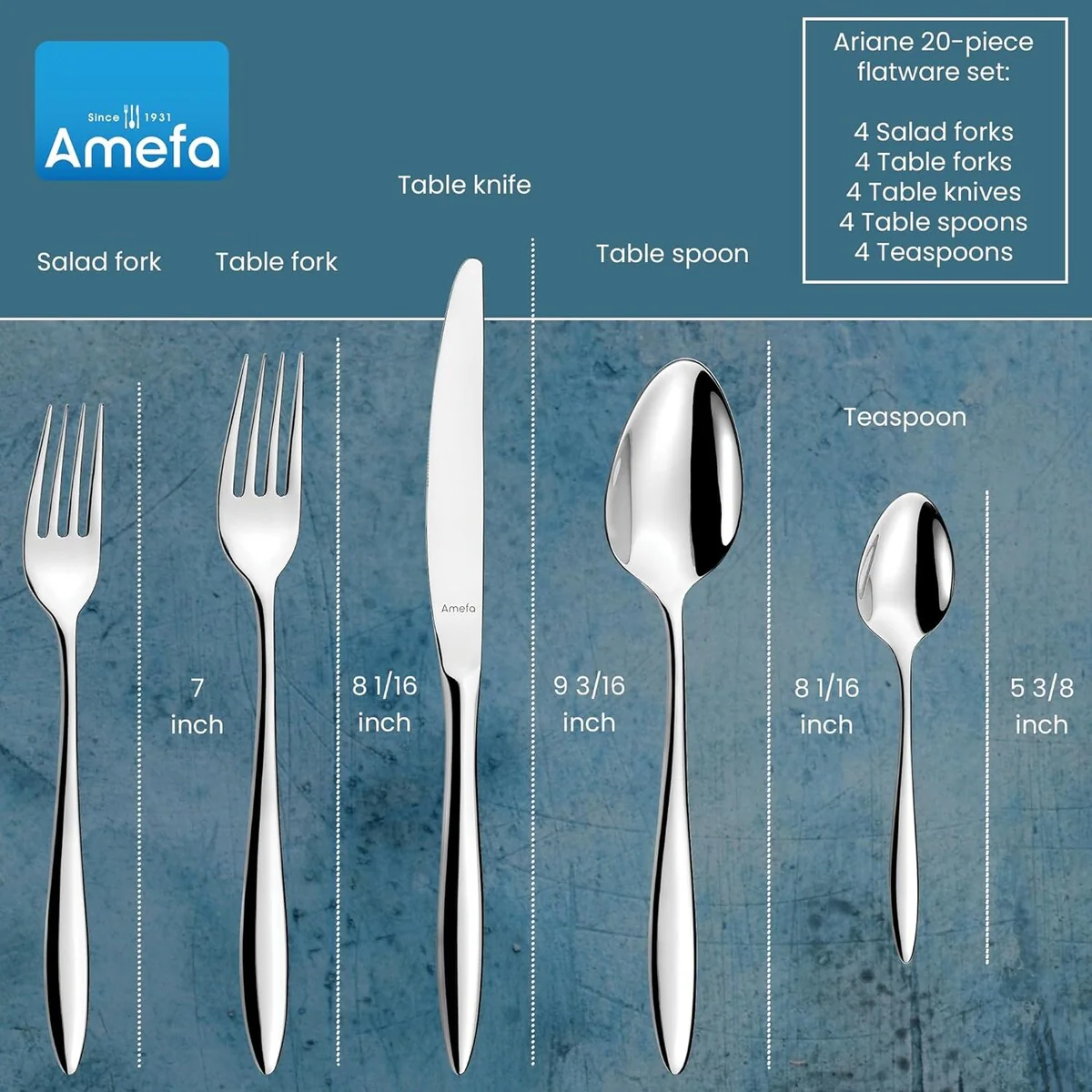 - Service For 4: 20-piece flatware set includes 4 dinner forks, 4 dinner spoons, 4 dinner knives, 4 salad forks and 4 teaspoons.