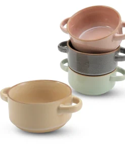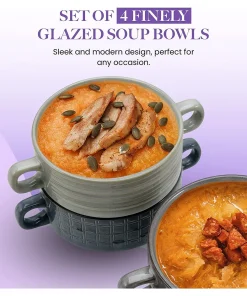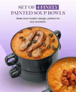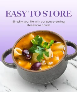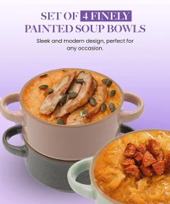 Experience the versatility and convenience of our Soup Bowl Set. These ceramic bowls measure 4.72" x 3" and hold up to 16 ounces of your favorite soups, snacks, rice, noodles, and more. The two-handle design offers a secure grip, while the durable stoneware construction ensures long-lasting use. With a classic design and assorted colors, these bowls enhance your dining table and kitchen decor. They are stackable, stain-resistant, and easy to clean. Upgrade your dining experience with this stylish and functional Soup Bowl Set that brings ease and elegance to your everyday meals.
