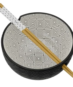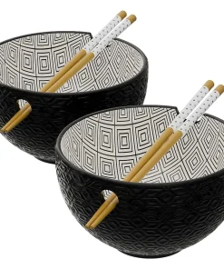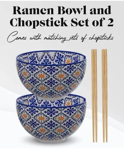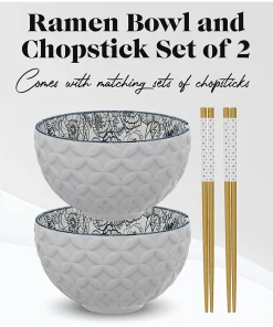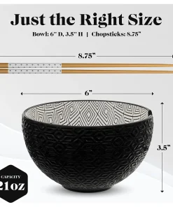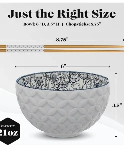 - Bowl and Chopstick Set – This set includes two noodle bowls with a 6" diameter and a 21 Oz capacity. It conveniently comes with a matching set of chopsticks measuring 8.75" long so you can easily savor a hearty bowl of ramen or any noodle soup