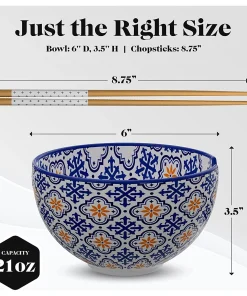 - Set of (2) American Atelier Stoneware Udon Ramen Bowl w/ Chopsticks, 6" D 21 Oz – Blue Floral Print