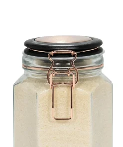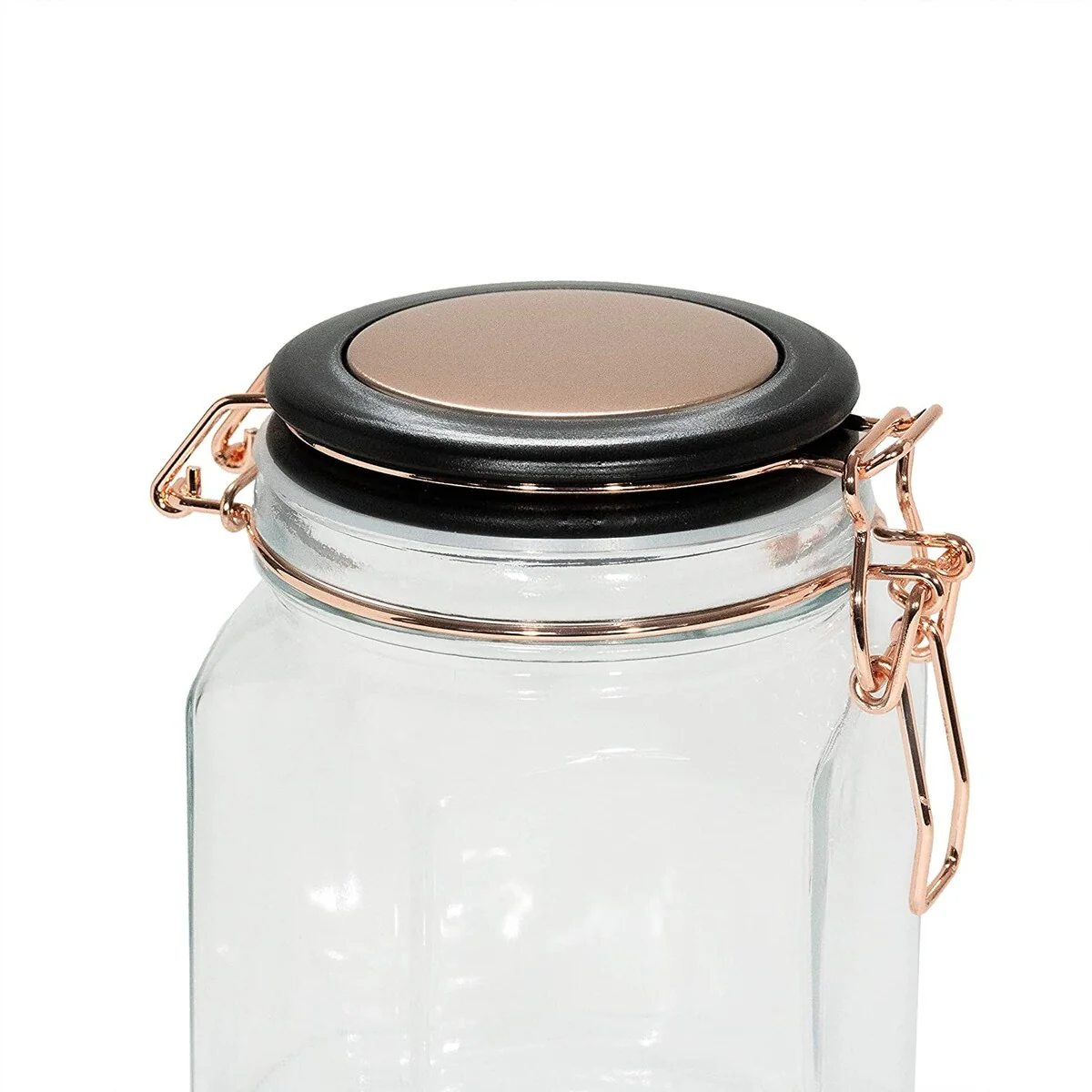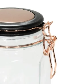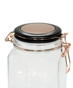 - Copper design – the hermetically sealing lid is a mixed media two toned black and copper combination with copper colored metal clippers.