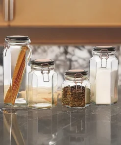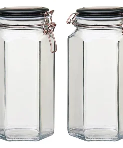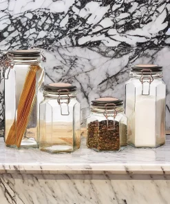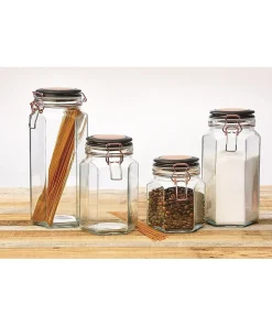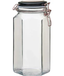 - Perfect for your pantry – this clear glass Canister is shaped in a stylish faceted hexagonal body that will accentuate a modern kitchen countertop or pantry. Sturdy, food safe glass will keep its contents visible and safe while adding a sense of style to your food prep area.