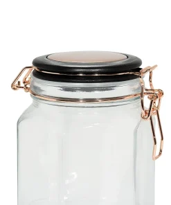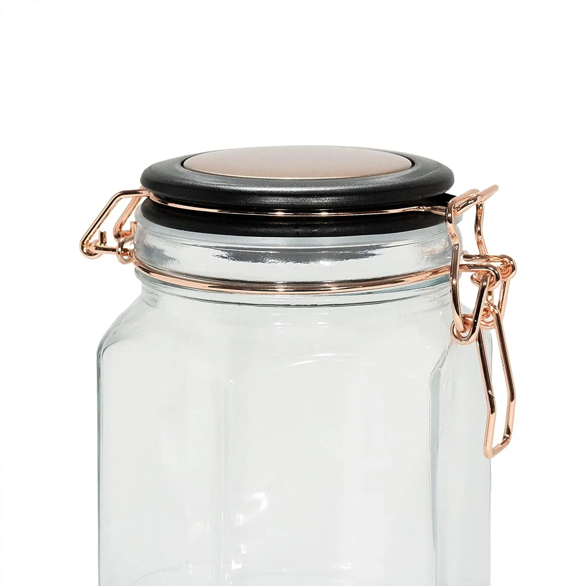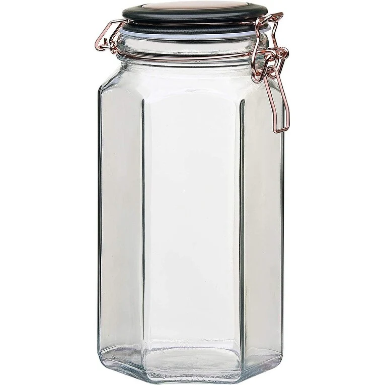 This clear glass canister is shaped in a stylish faceted hexagonal body that would accentuate a modern kitchen countertop or pantry. The hermetically sealing lid is a mixed media two toned black and copper combination with copper colored metal clippers. Sturdy, food safe glass will keep its contents visible and safe while adding a sense of style to your food prep area. The glass portion is dishwasher safe, while the lid and clippers should be hand washed.