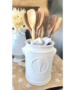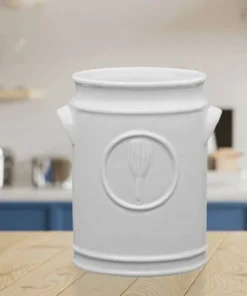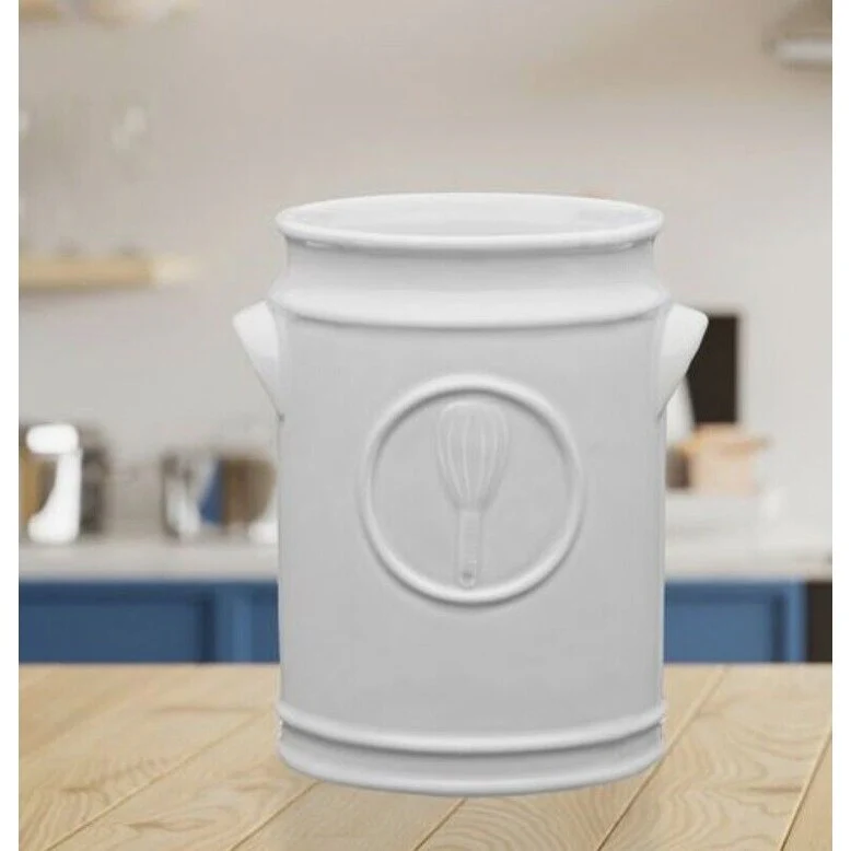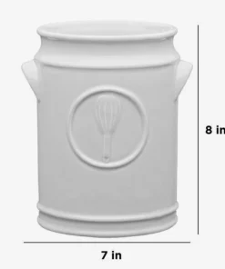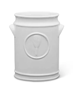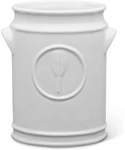 - DESIGN: The Amici Home Whisk Utensil Crock features an embossed whisk, monochrome in all white, works well in any type of kitchen: it will blend in nicely with all white interiors, minimalist set ups, or homey well-used cooking spaces.