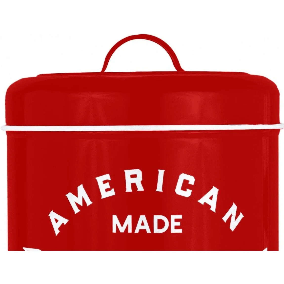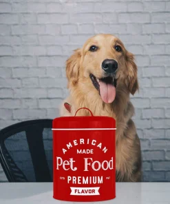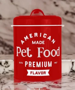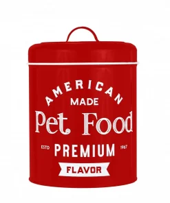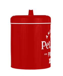 - FUNCTION AND FASHION – This metal food or treats canister features a red coated finish with white accents.
