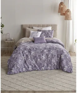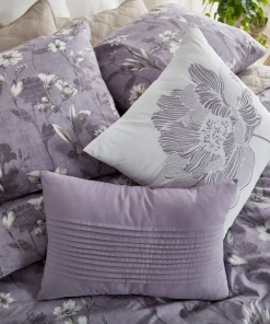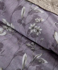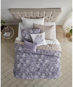 A dreamy field of wildflowers await your bedroom. With an allover lavender floral print on the comforter and shams, the Halsbury Bedding Set is an exquisite touch to any room. Reverses to a solid. The decorative pillows feature a single flower design on one and a solid color on the other. 4-piece set includes 1 printed comforter, 1 sham, and 2 coordinating decorative pillows. 5-piece set includes printed comforter, 2 shams, and 2 coordinating decorative pillows.