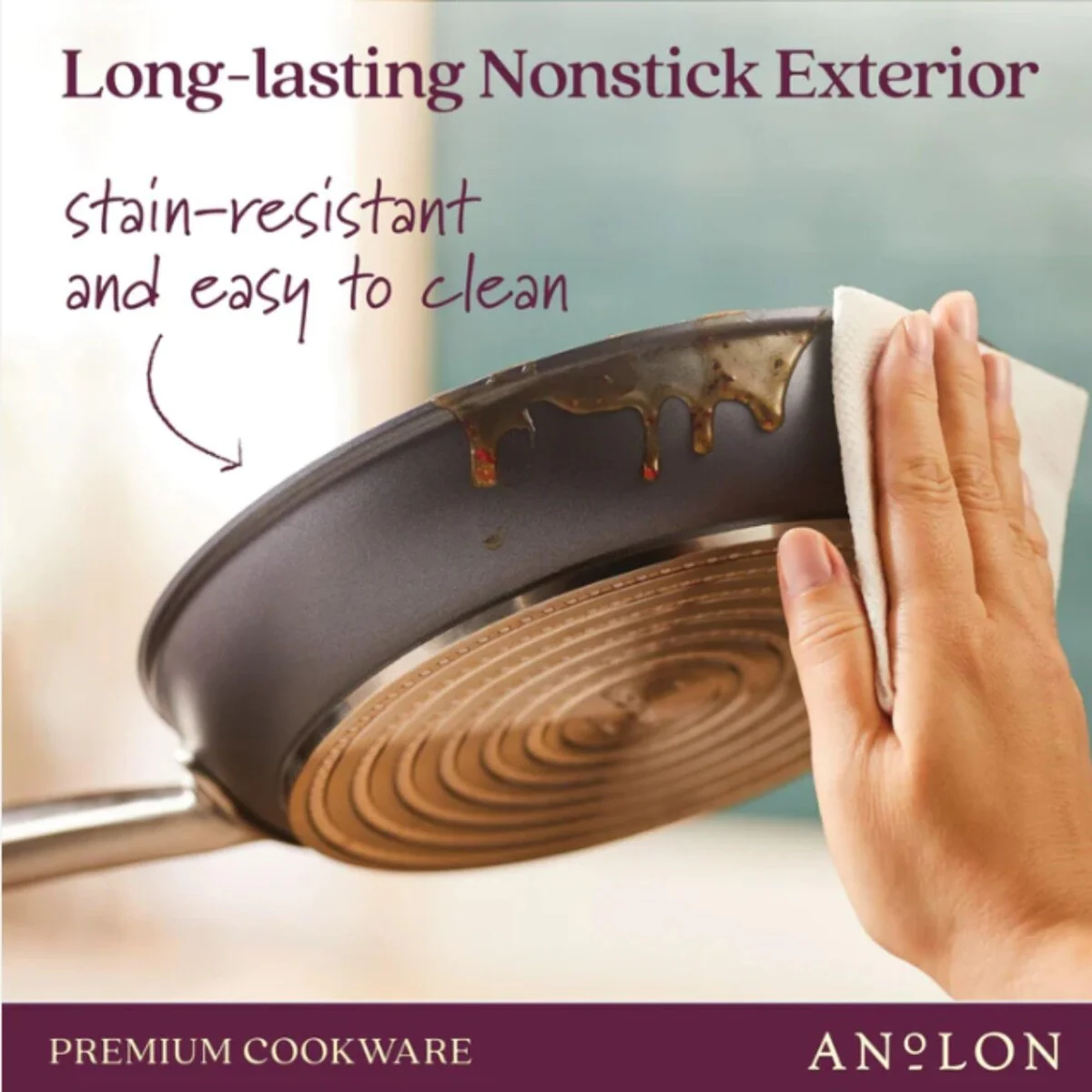 Anolon Accolade cookware has earned its way into kitchens thanks to the quality design that yields unmatched durability for a lifetime. Outfit your kitchen with this kitchen essentials set of frying pans never look back. Our triple layer nonstick lasts 16x longer than the competition, and our Precision Forge™ hard anodized construction delivers even heating, precise heat control, and consistent reliability from base to sidewalls to rim. An easy-clean nonstick exterior is stain-resistant and keeps your skillets looking newer, longer, and unique flush rivets provide a totally smooth cooking surface for sublime stirring and easy cleanup. Dishwasher safe and oven safe to 500°F, this incomparable nonstick frying pan set is designed for a lifetime of quality performance and happy cooking