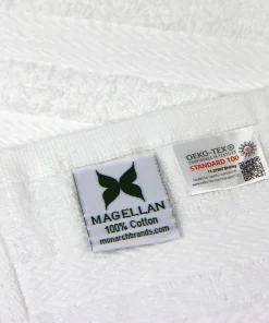 The Magellan collection is a superior white towel collection designed for a luxury hotel chain. Magellan is heavy but not oversized, which means you will enjoy more soft plush pile against your skin. The collection features a double dobby chevron border and double sewn hems for longevity. The collection is OEKO-TEX certified and meets all US Consumer Product Safety Improvement Act (CPSIA) requirements. Our Magellan towel is made from 100% premium ringspun cotton. Add a touch of elegance to any decor, home, hotel, spa, dorm, and our towels can be used in gyms, country clubs, hospitals, physical therapy clinics. Machine wash the towels in warm water using mild detergent and tumble dry on low; recommended to dry immediately; they will grow softer and fluffier with each wash