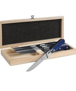 The majestic and elegant pearlized royal blue handles of this set of French-made steak knives are meticulously handcrafted in the Thiers region of France, renowned for over six hundred years for its excellence in knife making. Each Au Nain Prince Gastronome steak knife is individually handmade by local artisans using time-honored craftsmanship, preserving the tradition of high-quality knife making. These durable knives have razor-sharp stainless-steel blades that easily slice through steak without shredding the meat, while the handles accented with three stainless-steel rivets and bolster, feel substantial and comfortable. These knives are dishwasher safe and fully tanged, meaning the sturdy blade extends through the end of the handle. These impeccably made steak knives come housed in a beautiful wood box, ideal for storage and gift-giving.