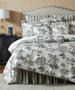 The stunning and opulent collection features a toile design in carbon & taupe colors with off white background to will complete the lavish top of your bed ensemble. The contemporary design fabric is accented with twisted multi-tone corded edge to complete its perfect look.