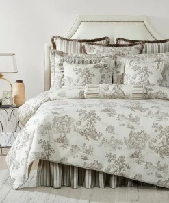 The stunning and opulent collection features a toile design in carbon & taupe colors with off white background to will complete the lavish top of your bed ensemble. The contemporary design fabric is accented with twisted multi-tone corded edge to complete its perfect look.