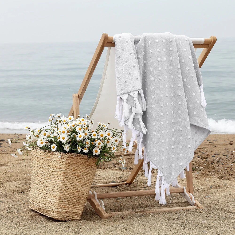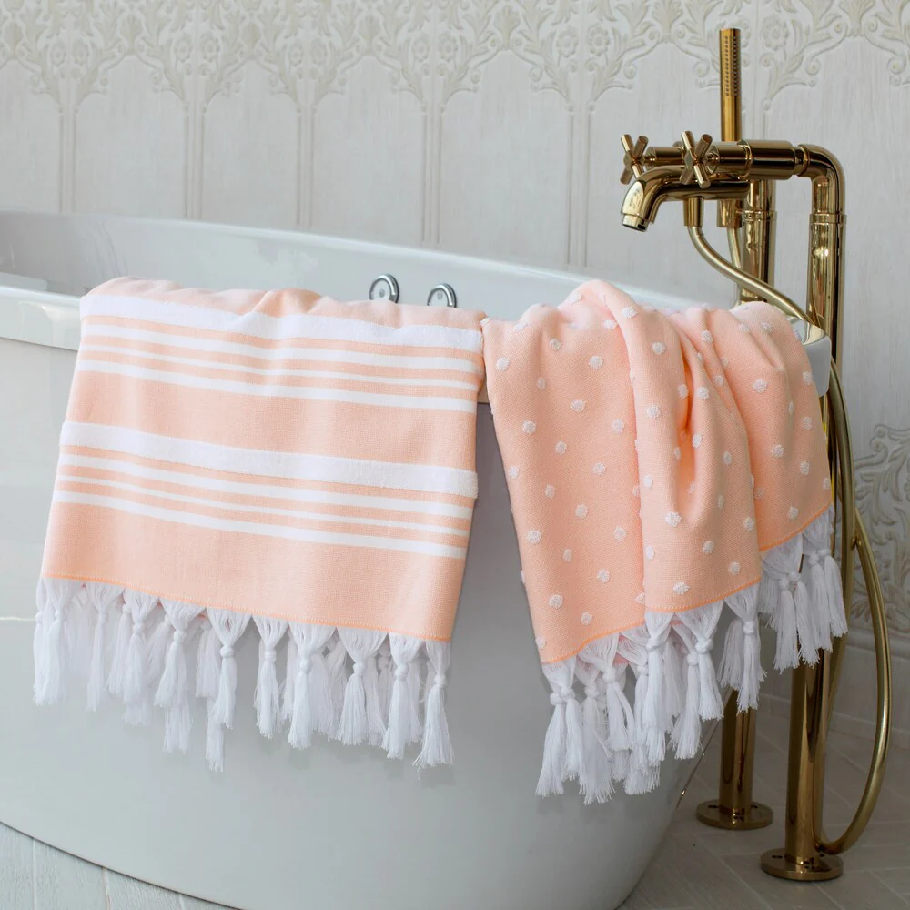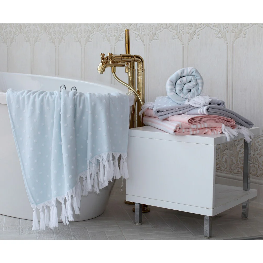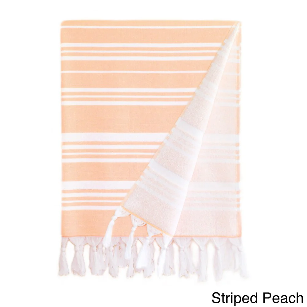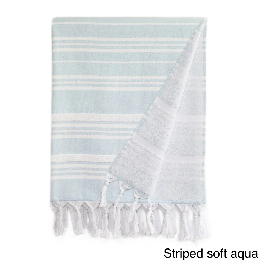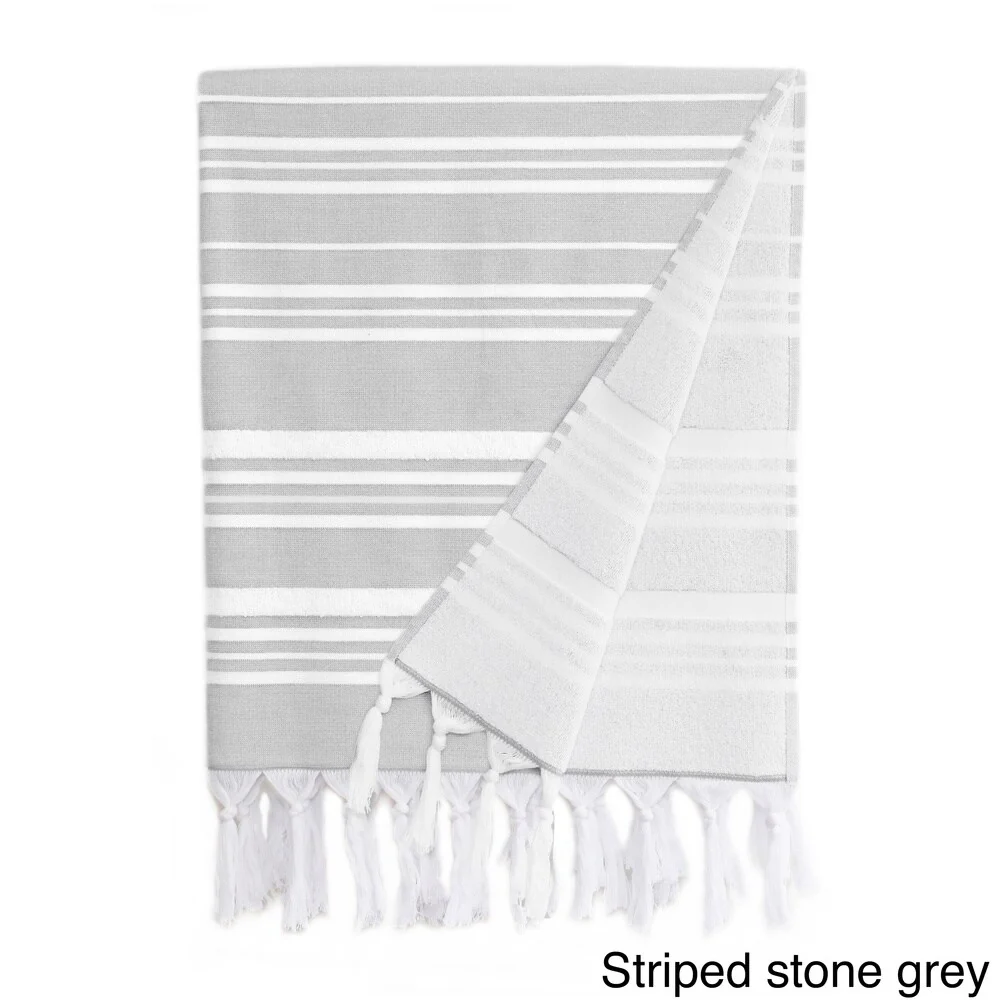 Experience the perfect blend of style and function with the Authentic Anatolia Stripes and Dots Turkish Cotton Terry Pestemal Fouta Bath and Beach Towel from Authentic Hotel and Spa. This lightweight towel features a flat-woven decorative front with a soft, absorbent terry back, making it perfect for drying off after a dip in the pool or at the beach. The pestemal construction ensures effective absorbency, while also allowing for quick drying, making it eco-friendly and mildew-resistant. Versatile enough to use as a picnic blanket, shawl, sarong, tablecloth, or chaise lounge cover, this towel is an essential accessory for any summer outing. Don’t forget to wash it before use to maximize absorbency and softness.