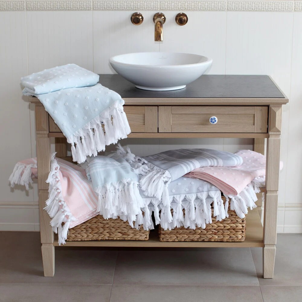 - Striped or polka dot design with hand-tied tassel edges on two sides