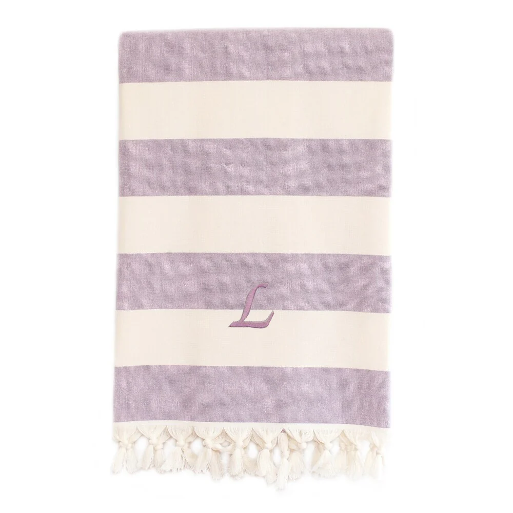 A beautiful yarn dyed stripe pattern adorns this fashionable Authentic Fouta Bath/Beach Towel with a soft Turkish cotton construction. This monogrammed Authentic Pestamel Fouta towel wrap in melon orange and cream bold cabana stripes features a flat woven front with a super soft terry back for maimum absorbency. Choose a single initial to be monogrammed on this lightweight and durable towel that is perfect to use for home or travel as a bath towel, beach towel or bathing suit sarong.