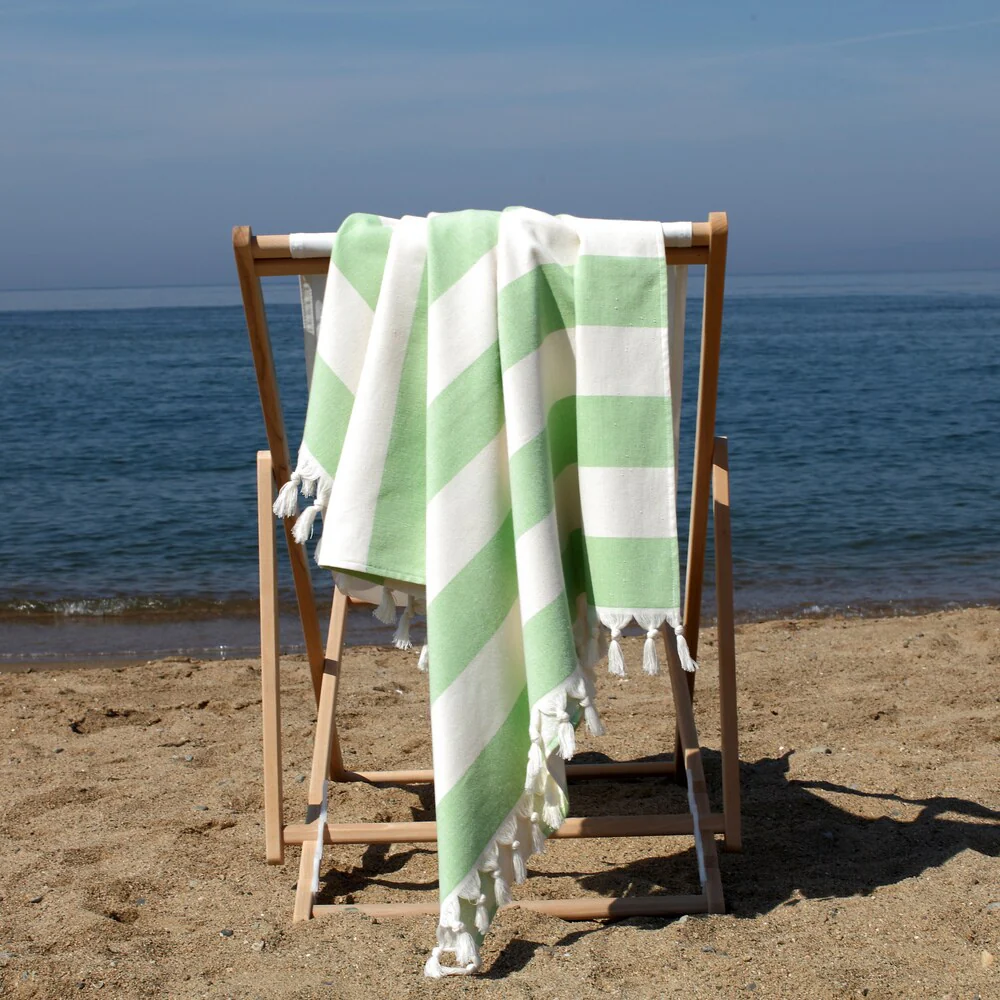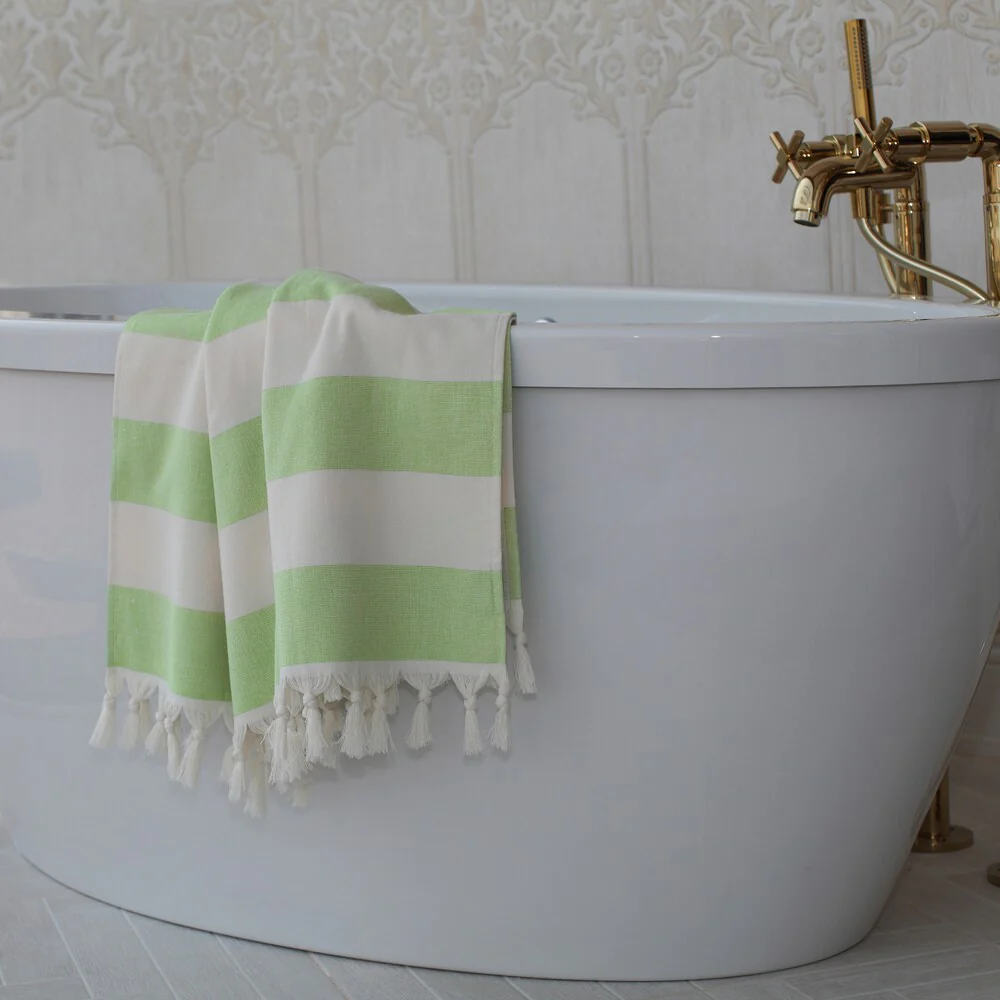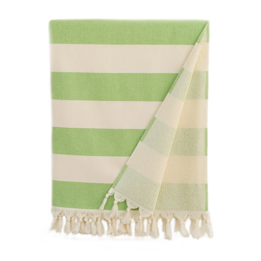 A beautiful yarn dyed stripe pattern adorns this fashionable Authentic Fouta Bath/Beach Towel with a soft Turkish cotton construction. This monogrammed Authentic Pestamel Fouta towel wrap in pistachio green and cream bold cabana stripes features a flat woven front with a super soft terry back for maimum absorbency. Choose a single initial to be monogrammed on this lightweight and durable towel that is perfect to use for home or travel as a bath towel, beach towel or bathing suit sarong.