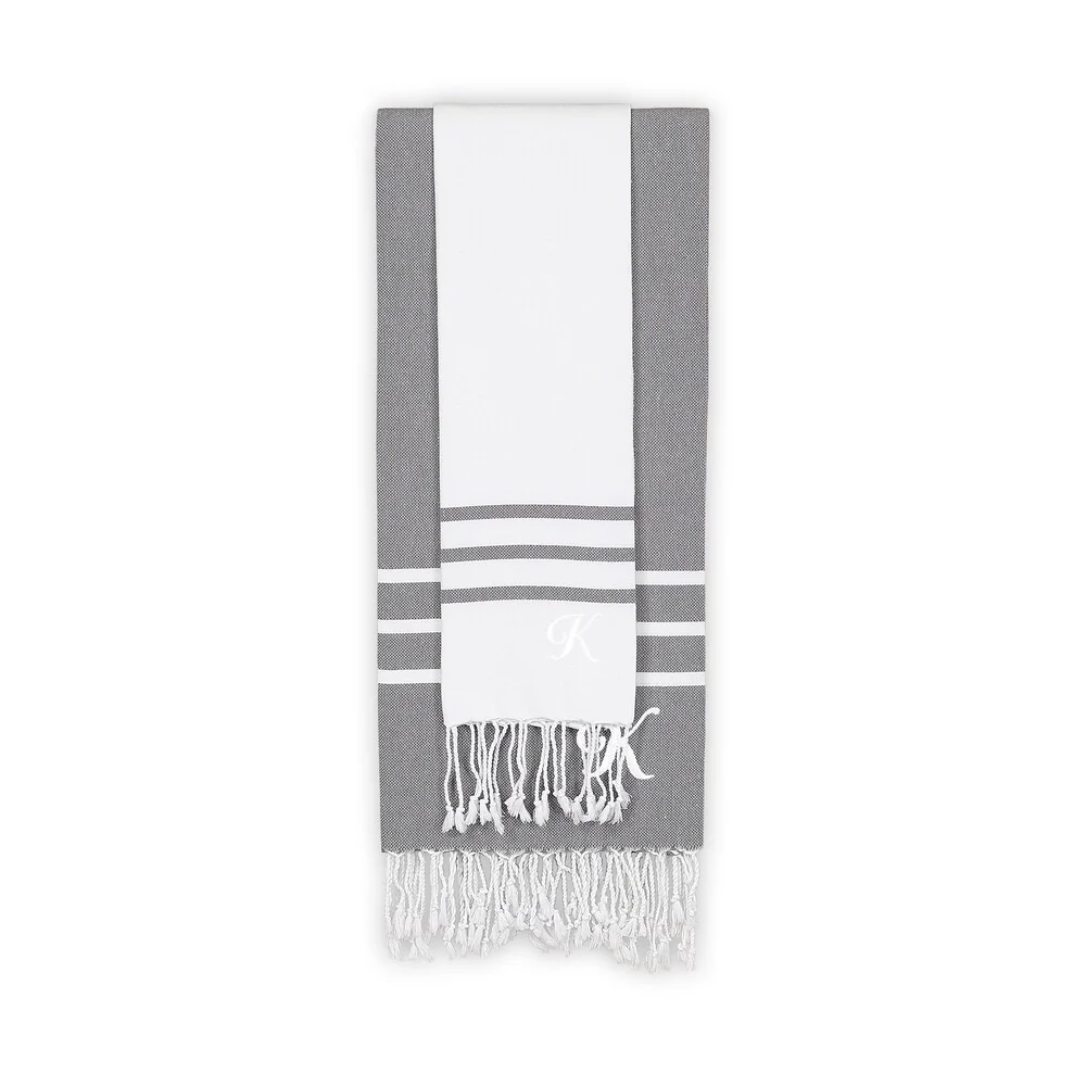 Hand-woven with lightweight yet absorbent Turkish cotton, these white and grey Ella towels are equally great for a day at the beach or getting ready at home. The pestemal towels feature a stylish striped pattern with an embroidered initial of your choice, making them a perfect gift for any occasion. The towels are machine washable for easy care and cleaning.