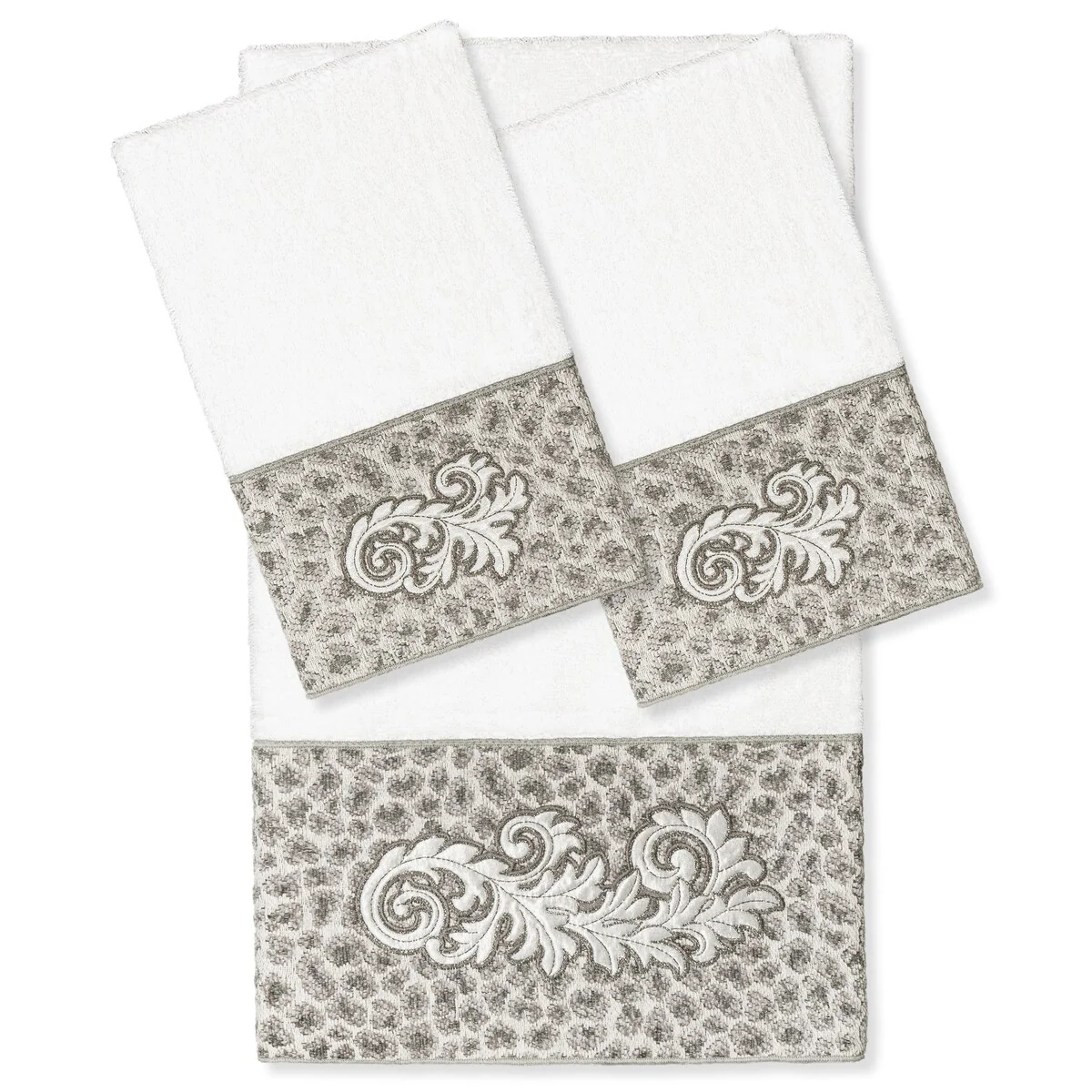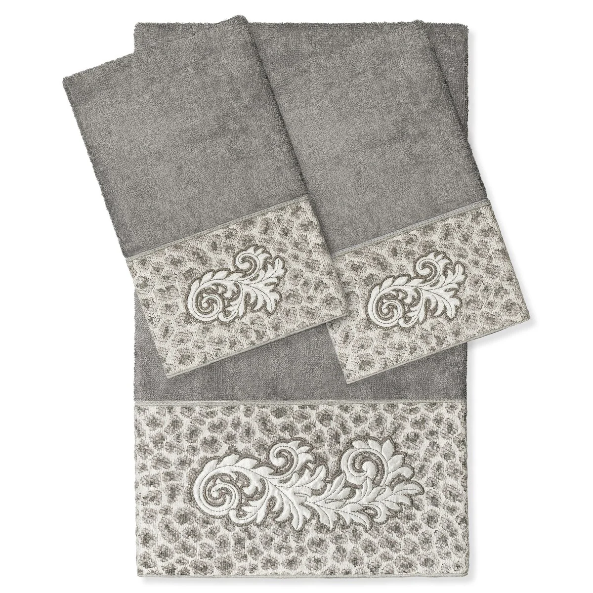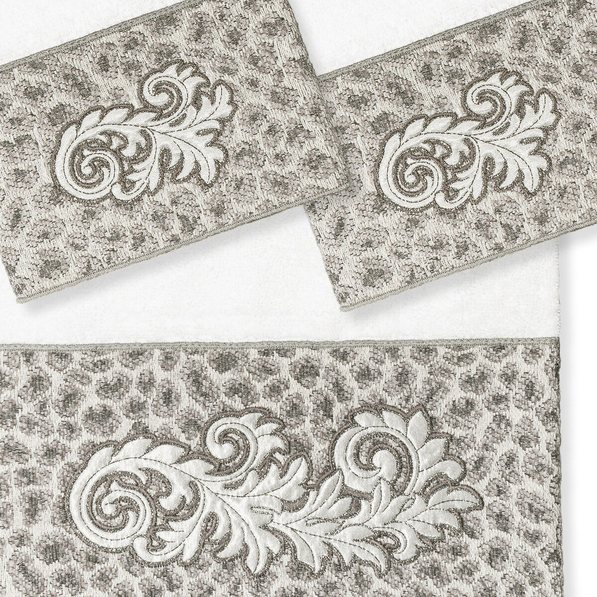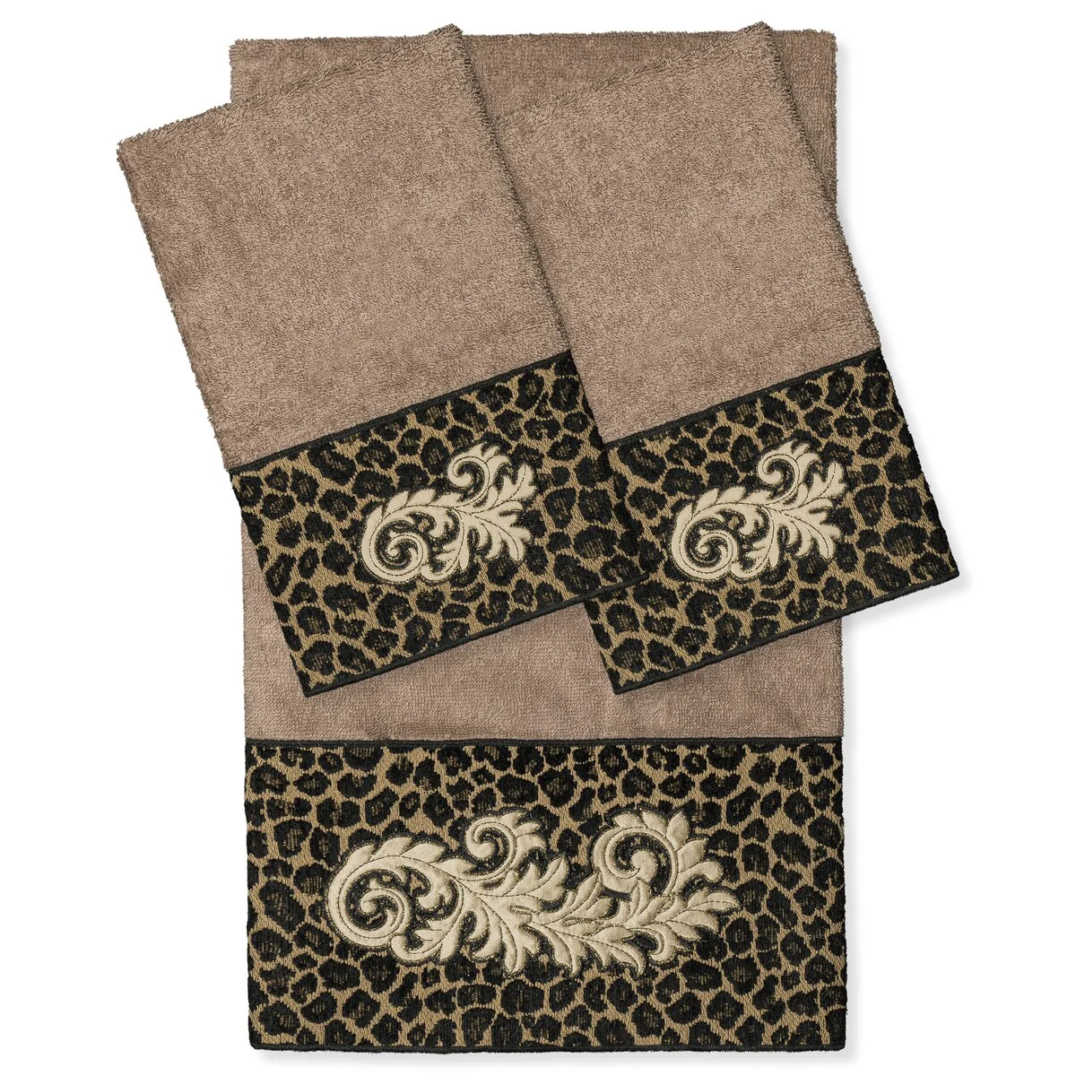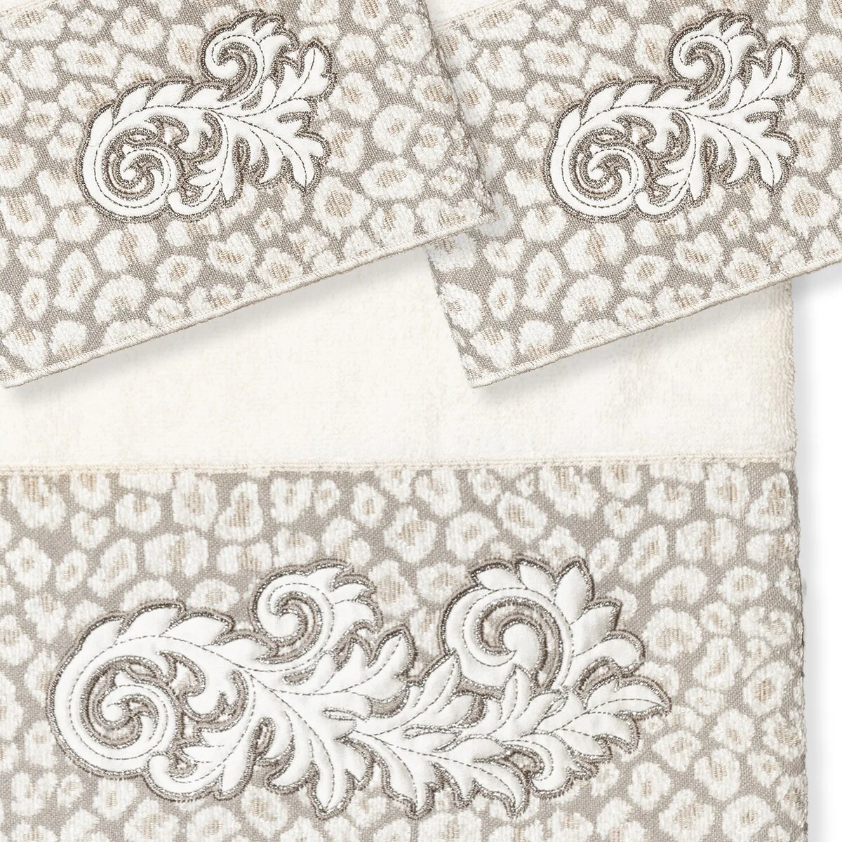 The April Embellished Towel Collection features an elegant lustrous appliqué scroll motif, embroidered on a plush cheetah patterned border. These soft and luxurious towels are made of 100% premium Turkish Cotton and offer lasting absorbency and superior durability.