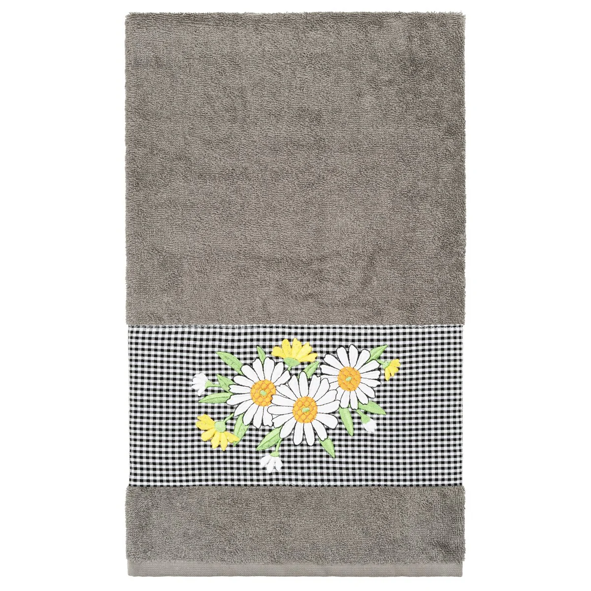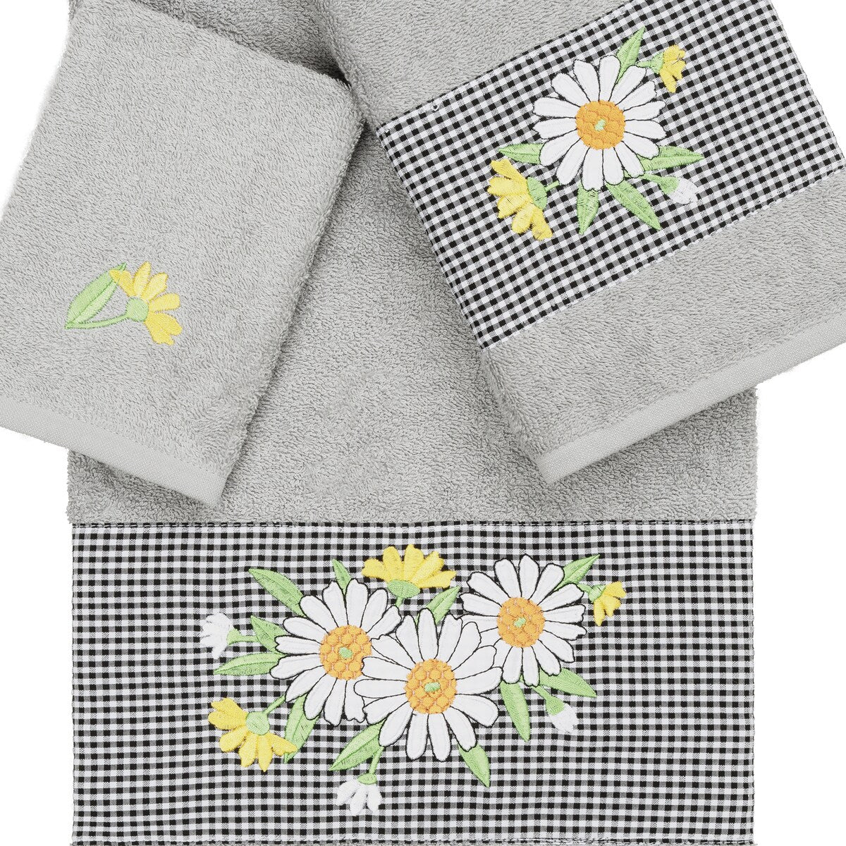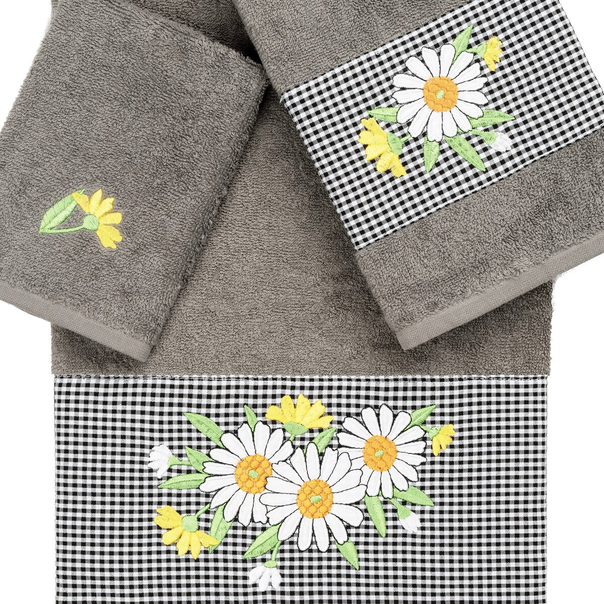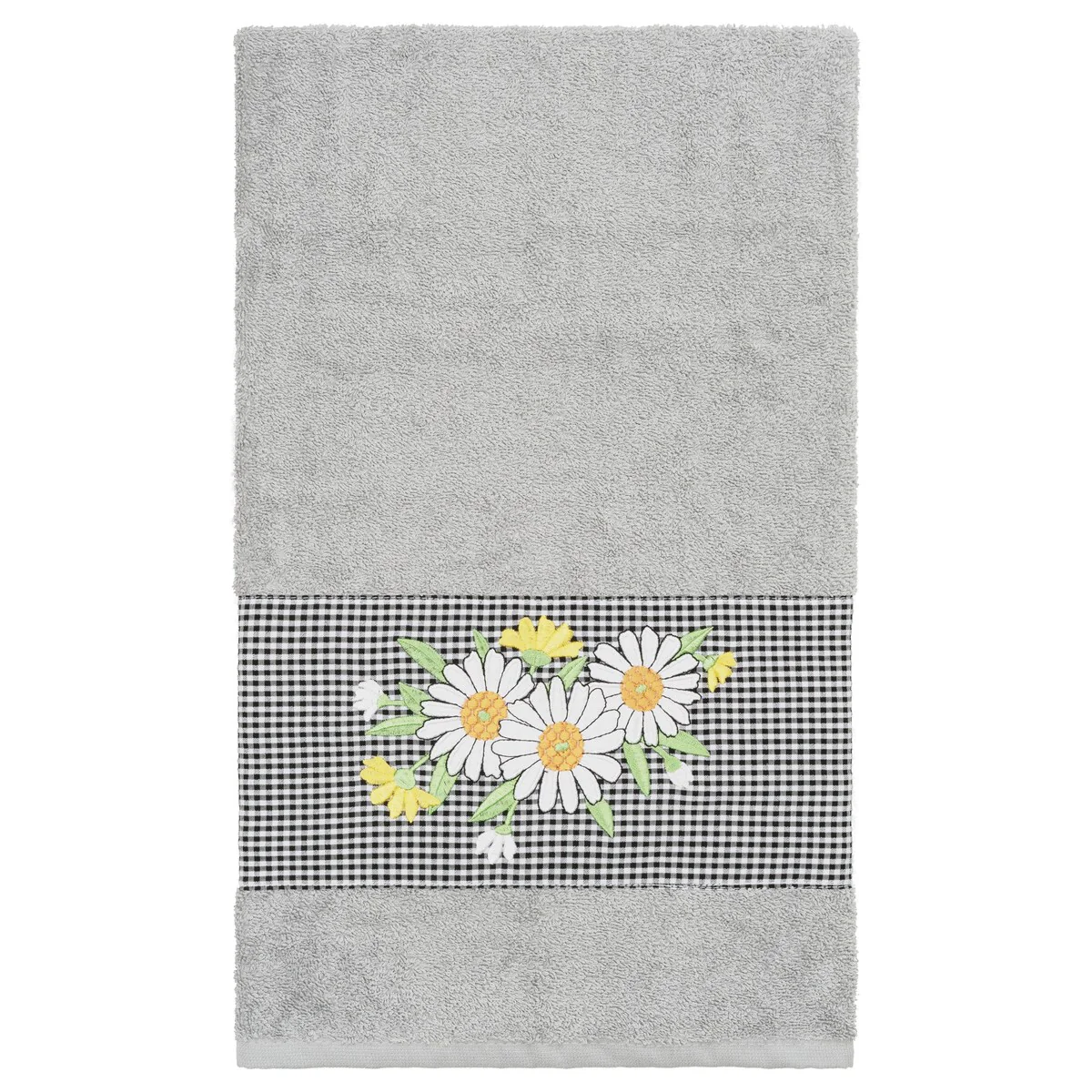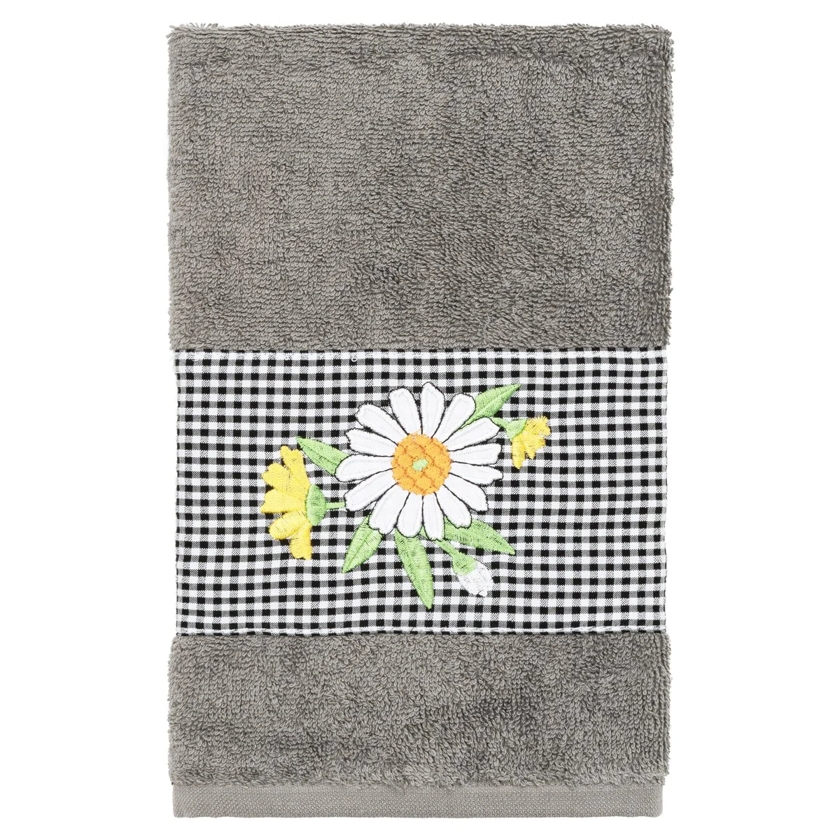 The Daisy Embellished Towel Collection features a fresh bouquet embroidered on a textured gingham check cloth border. These soft and luxurious towels are made of 100% premium Turkish Cotton and offer lasting absorbency and superior durability.