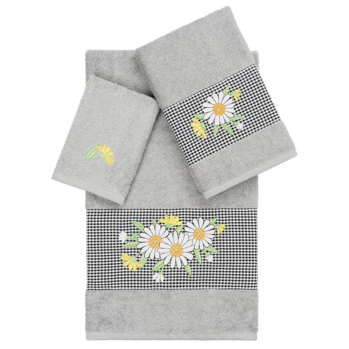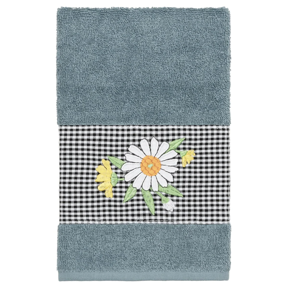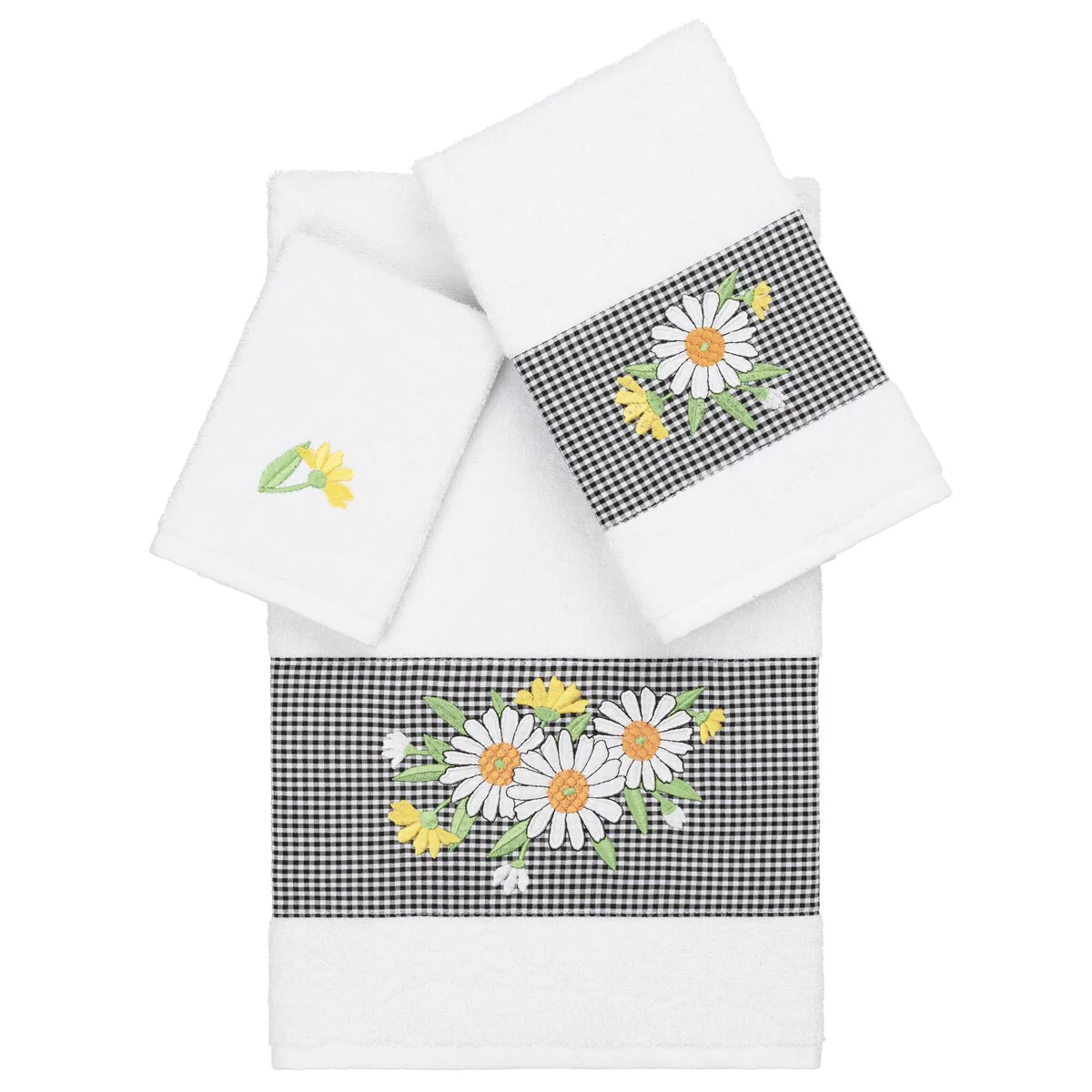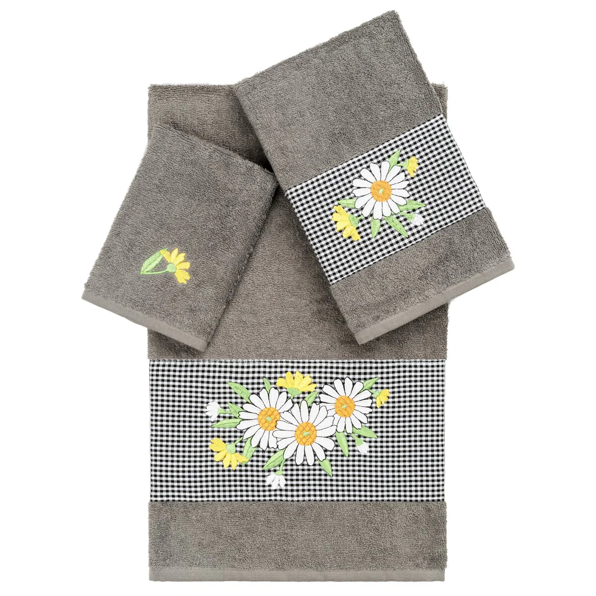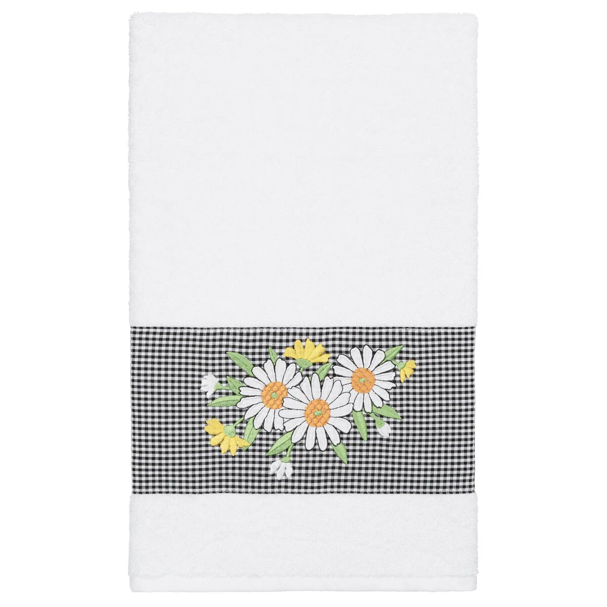 The Daisy Embellished Towel Collection features a fresh bouquet embroidered on a textured gingham check cloth border. These soft and luxurious towels are made of 100% premium Turkish Cotton and offer lasting absorbency and superior durability.