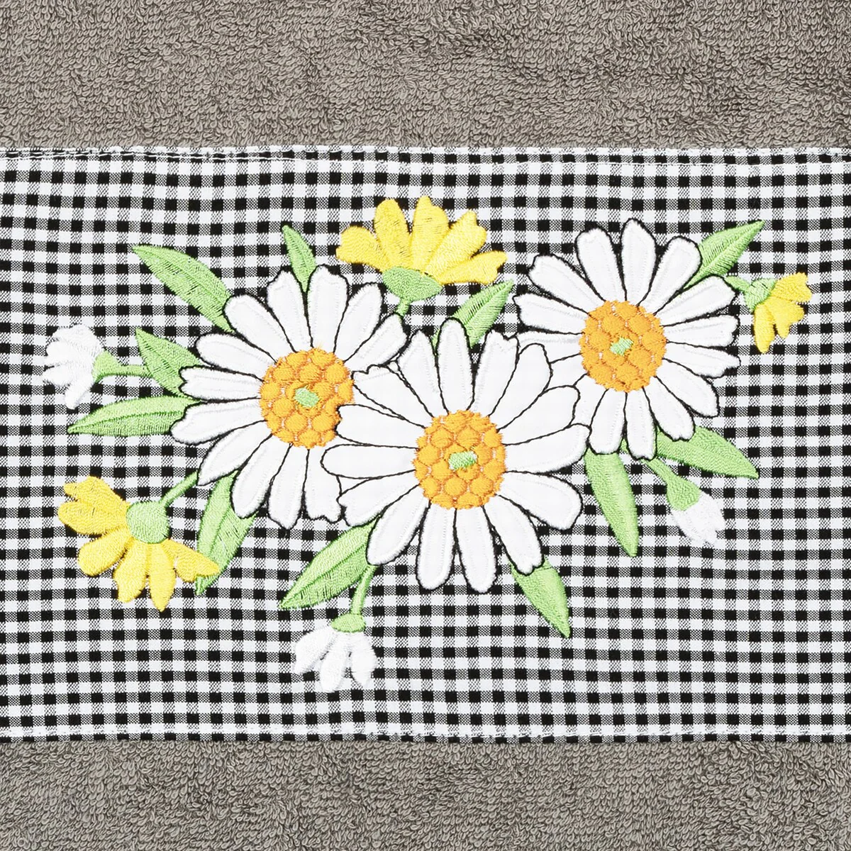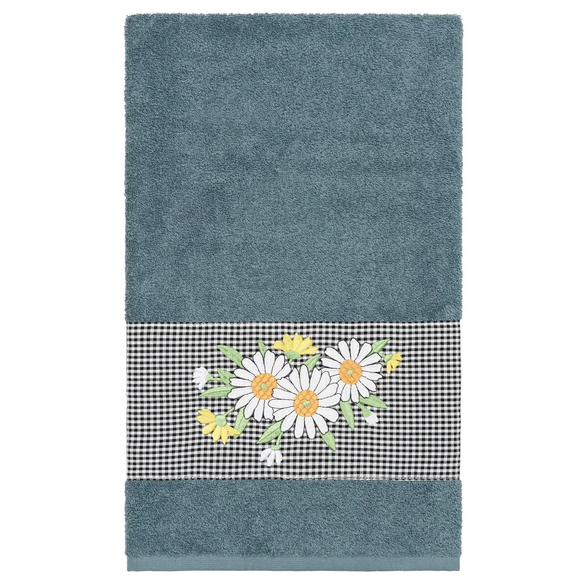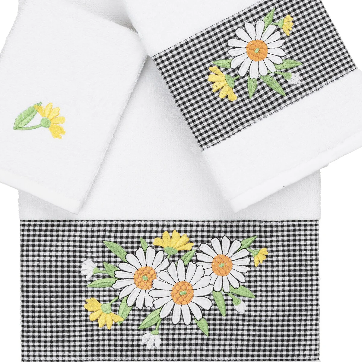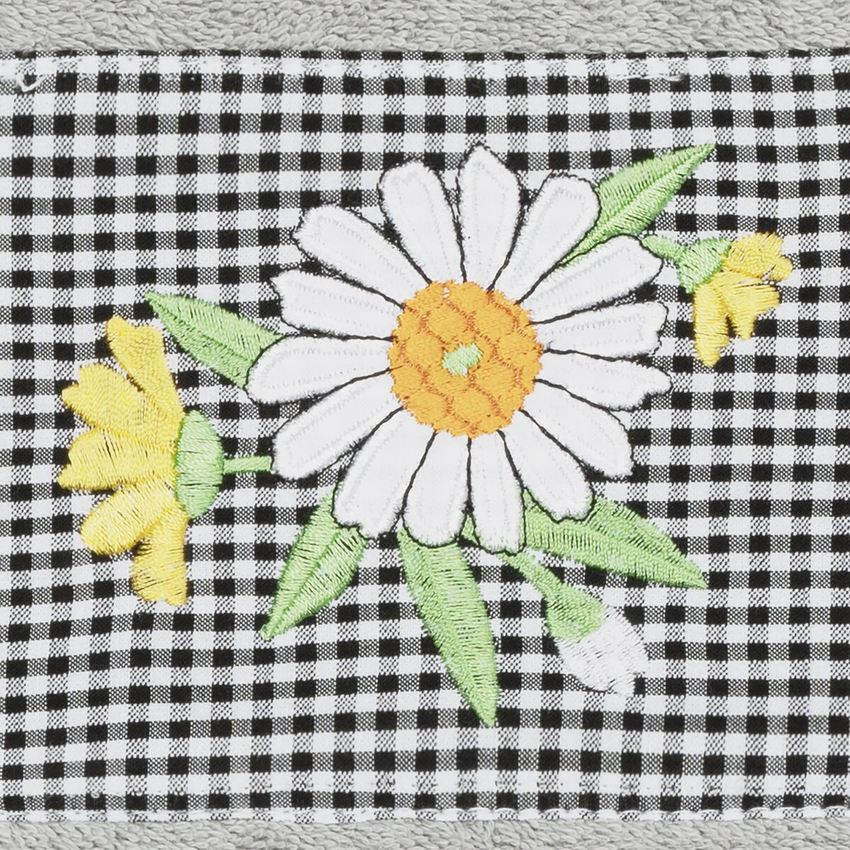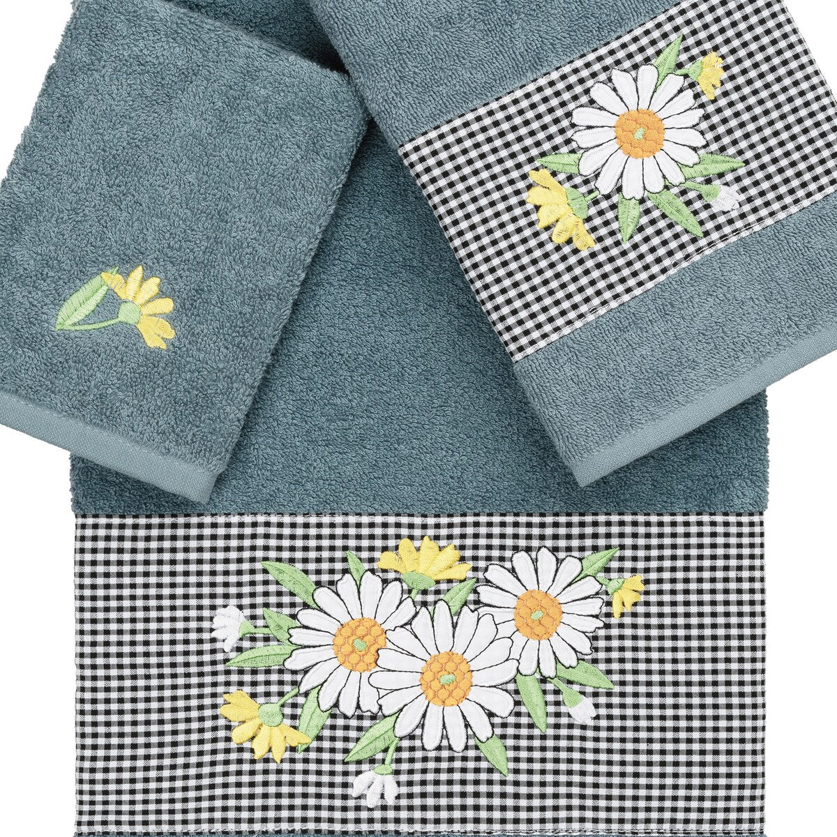 The Daisy Embellished Towel Collection features a fresh bouquet embroidered on a textured gingham check cloth border. These soft and luxurious towels are made of 100% premium Turkish Cotton and offer lasting absorbency and superior durability.