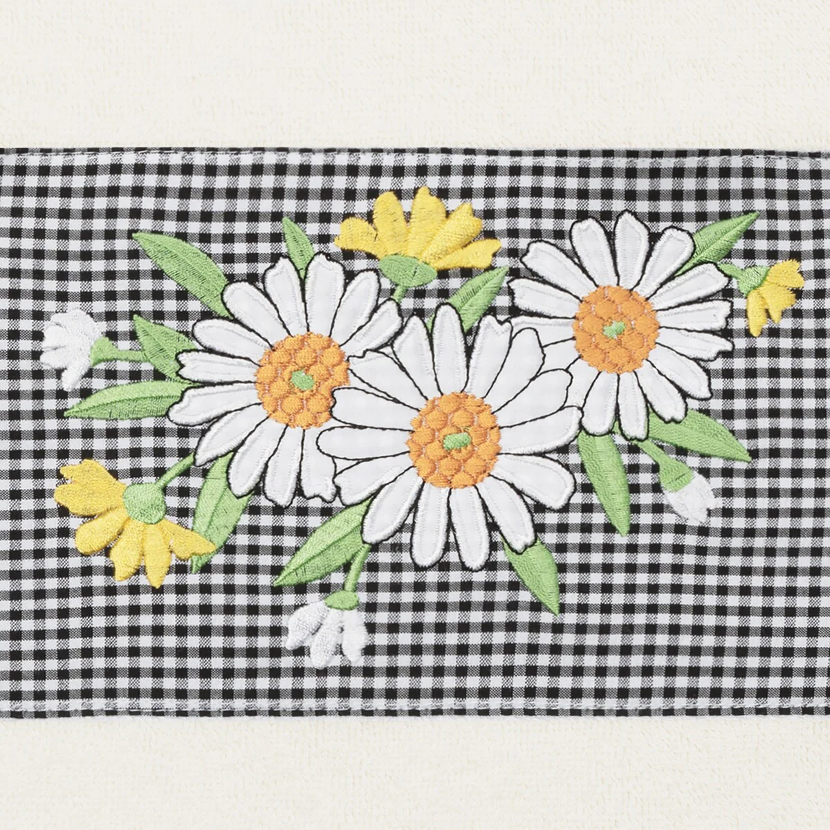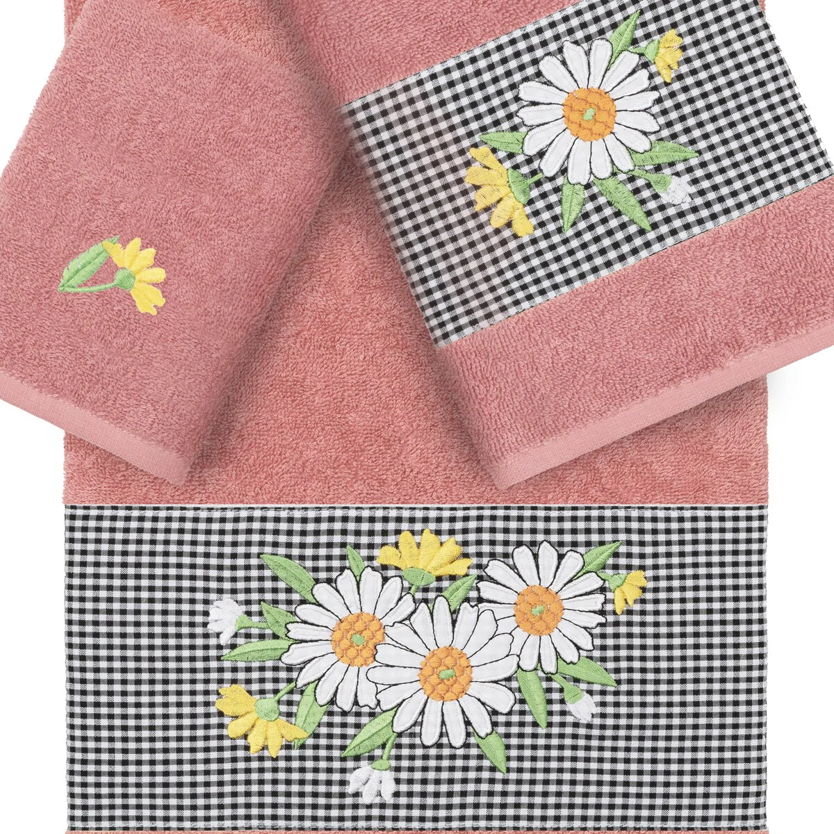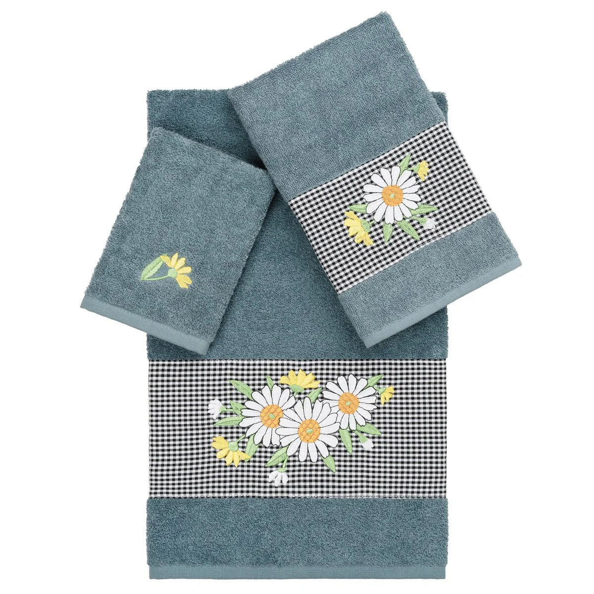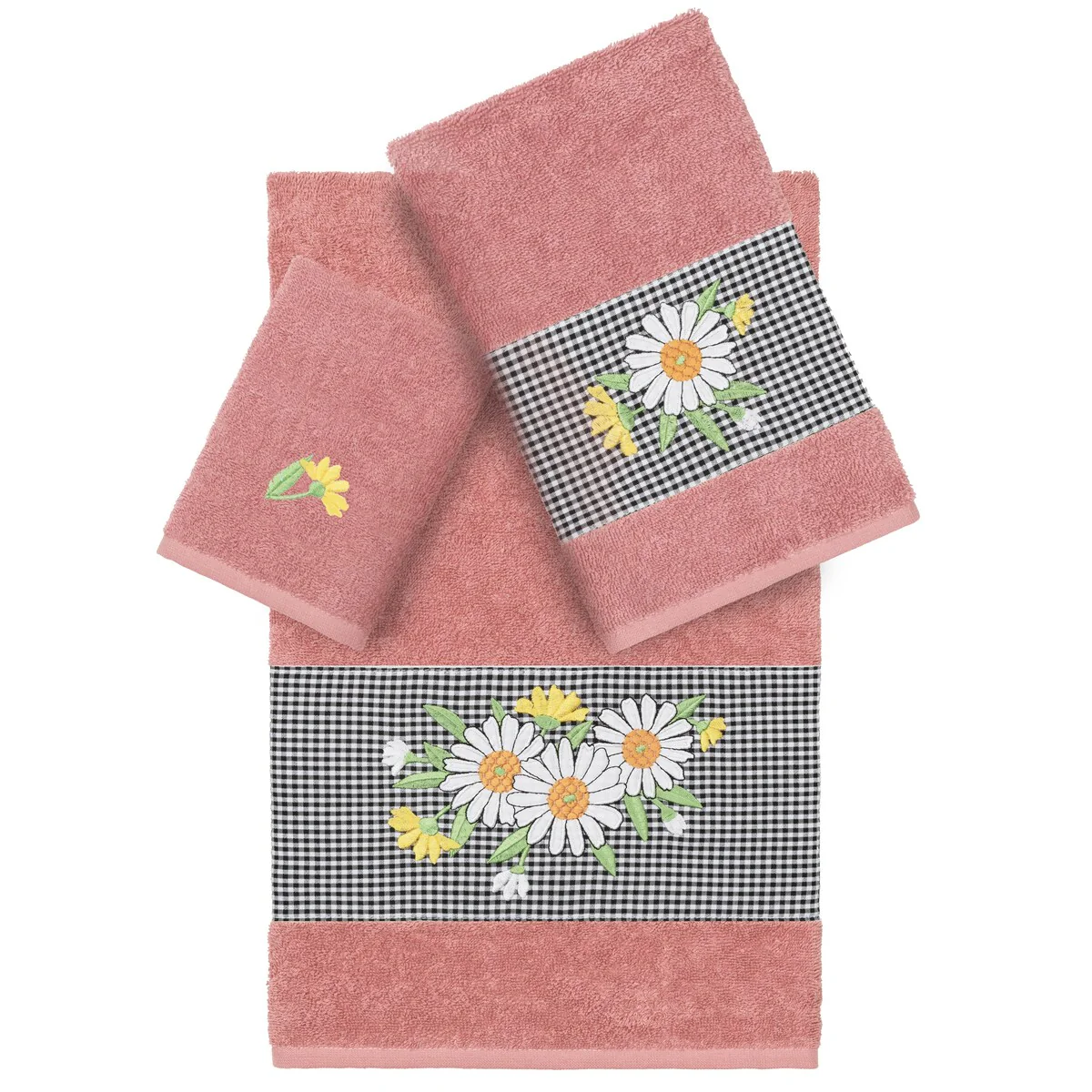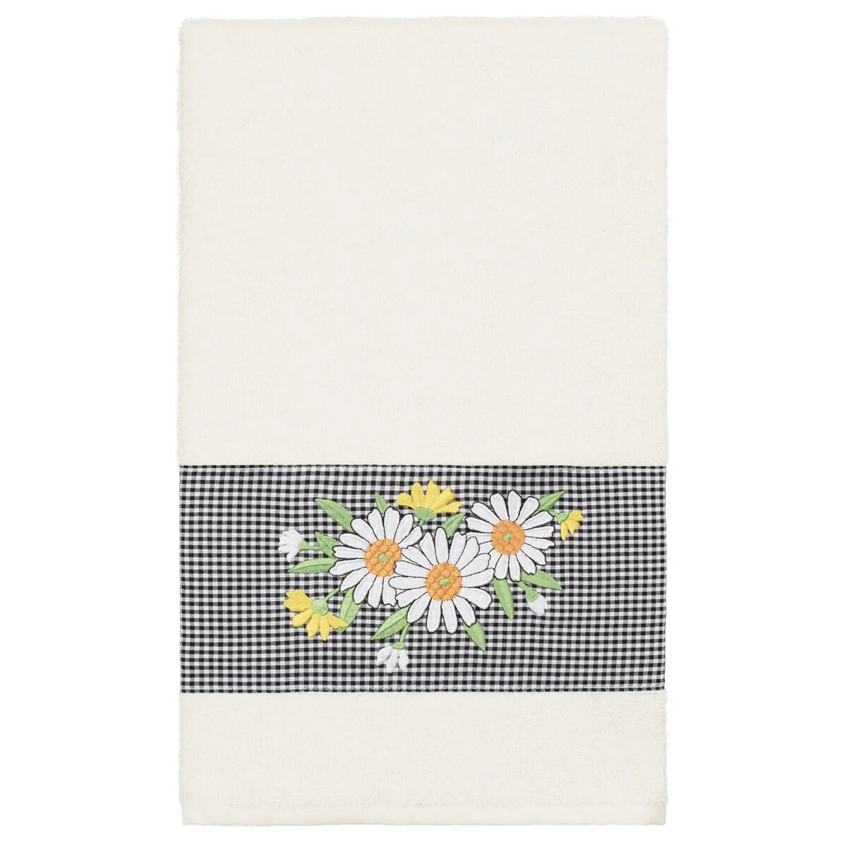 The Daisy Embellished Towel Collection features a fresh bouquet embroidered on a textured gingham check cloth border. These soft and luxurious towels are made of 100% premium Turkish Cotton and offer lasting absorbency and superior durability.