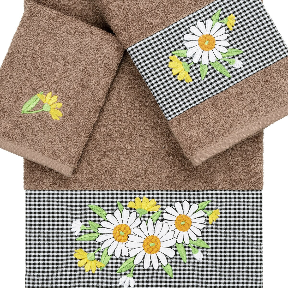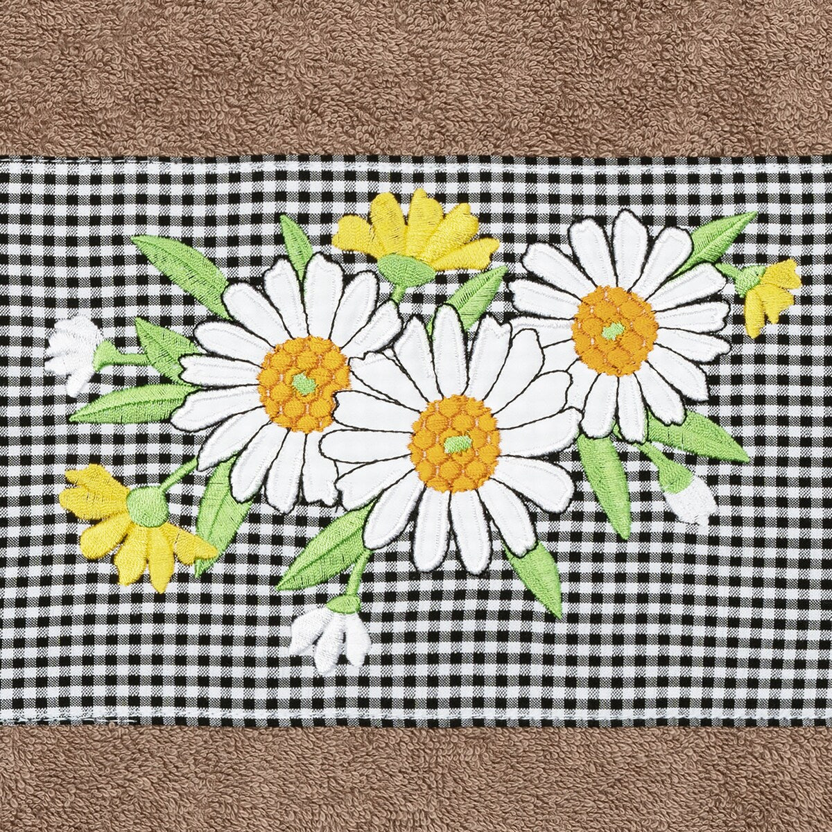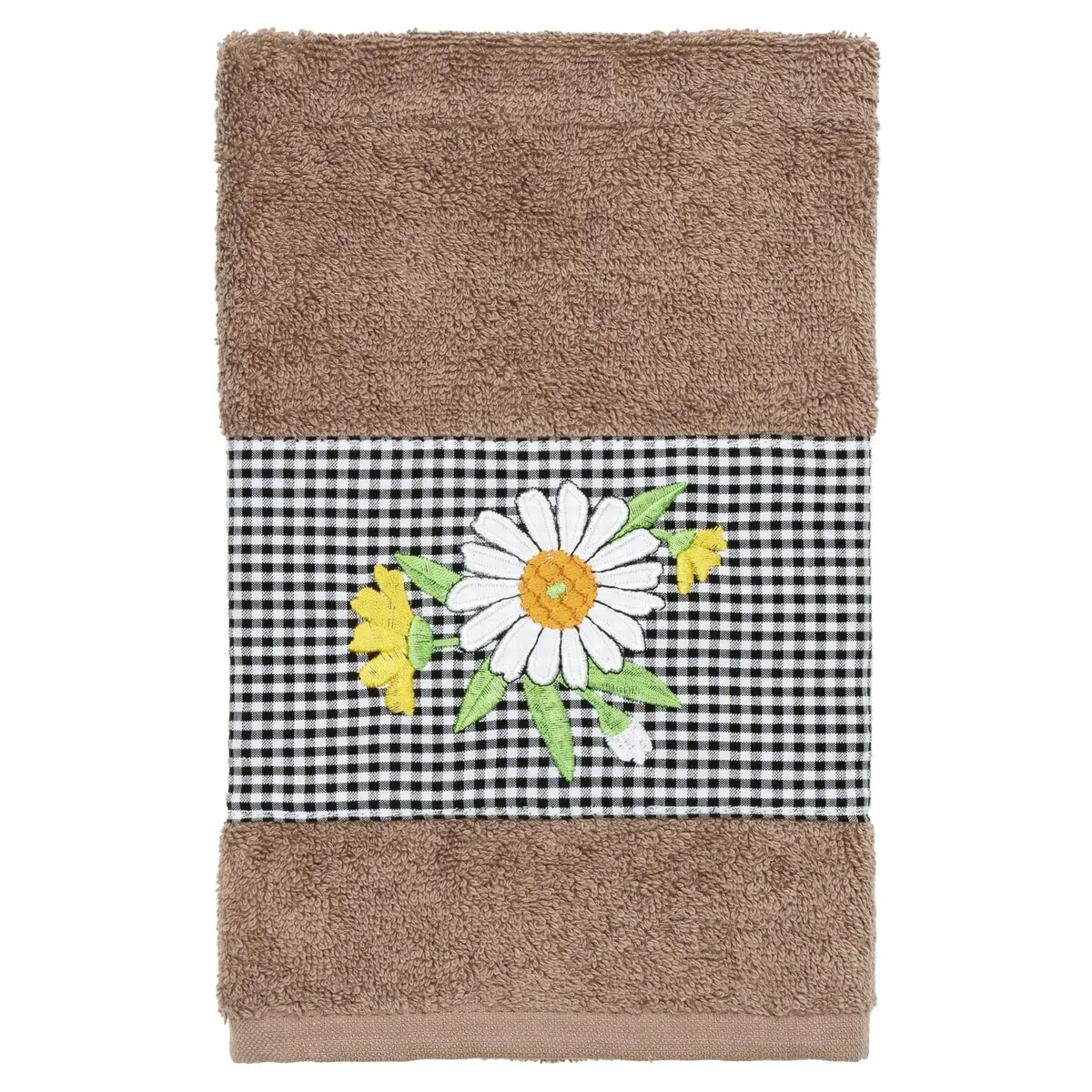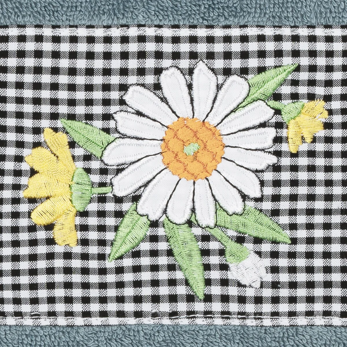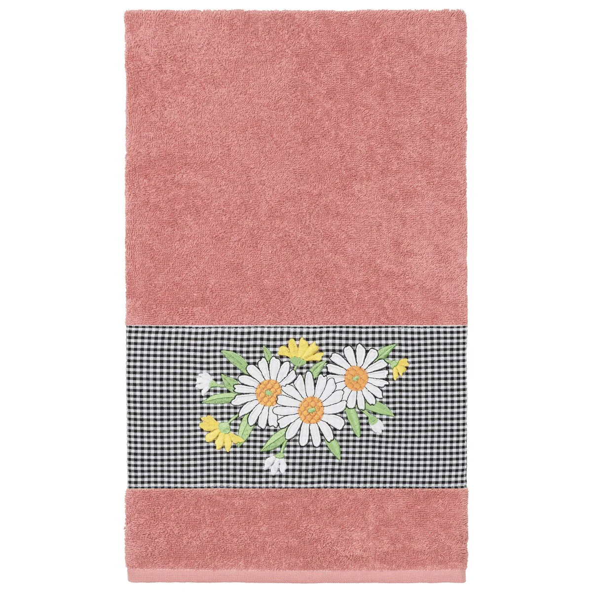 The Daisy Embellished Towel Collection features a fresh bouquet embroidered on a textured gingham check cloth border. These soft and luxurious towels are made of 100% premium Turkish Cotton and offer lasting absorbency and superior durability.