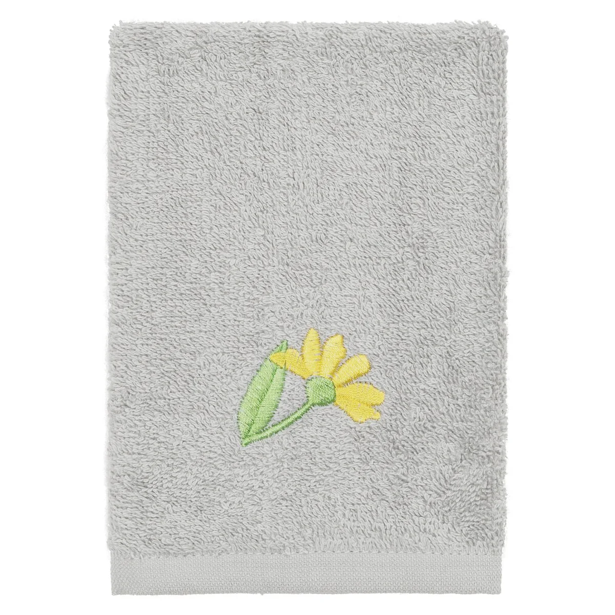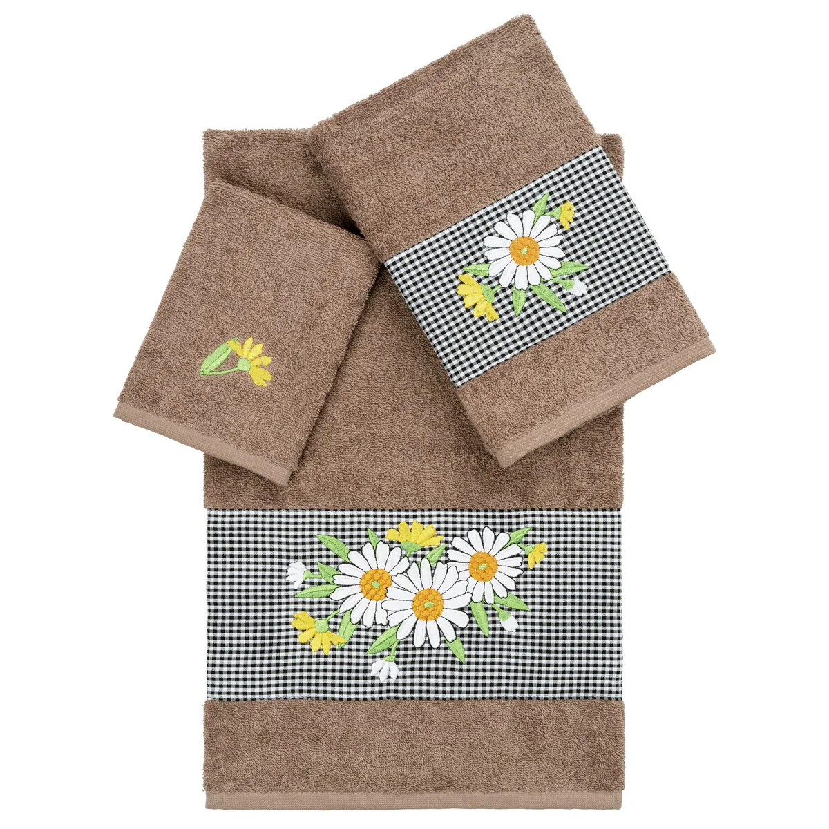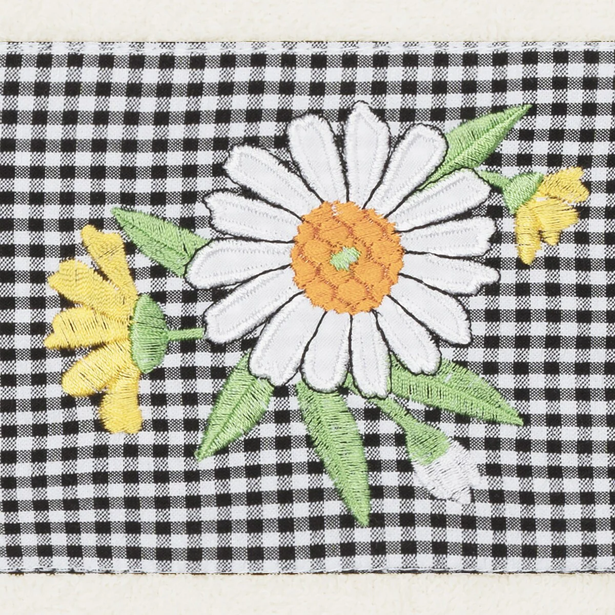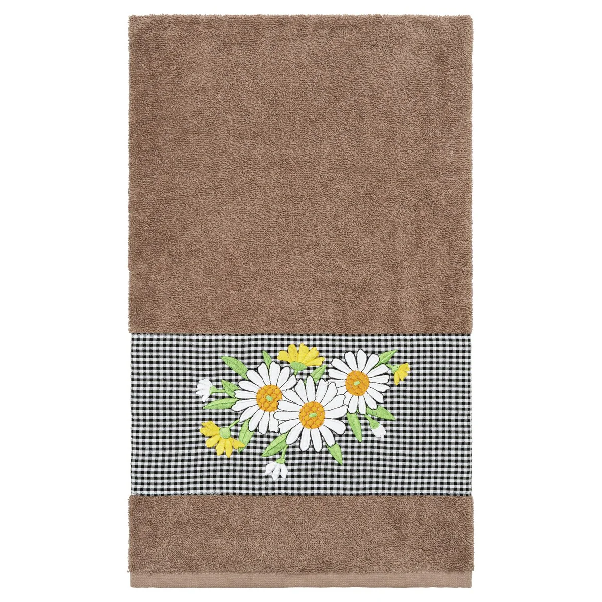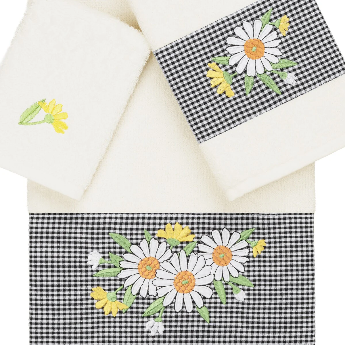 The Daisy Embellished Towel Collection features a fresh bouquet embroidered on a textured gingham check cloth border. These soft and luxurious towels are made of 100% premium Turkish Cotton and offer lasting absorbency and superior durability.