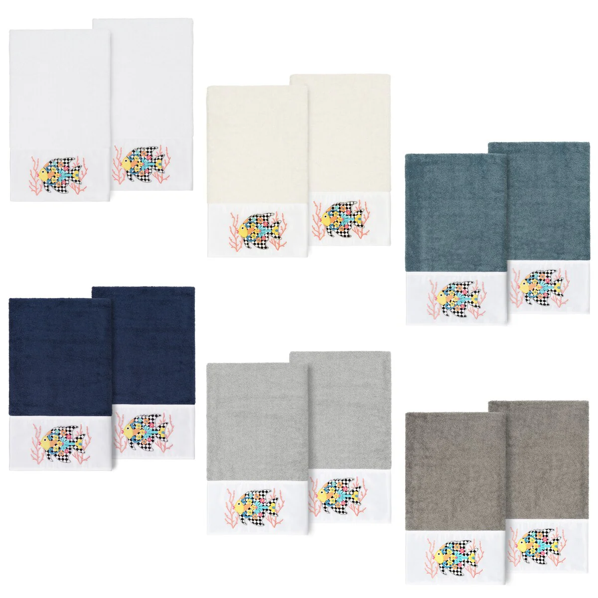 The Feliz Embellished Towel Collection by Authentic Hotel and Spa features a colorful and festive applique fish motif, embroidered on a lustrous ribbed texture cloth border. These soft and luxurious towels are made of 100% premium Turkish Cotton and offer lasting absorbency and superior durability.