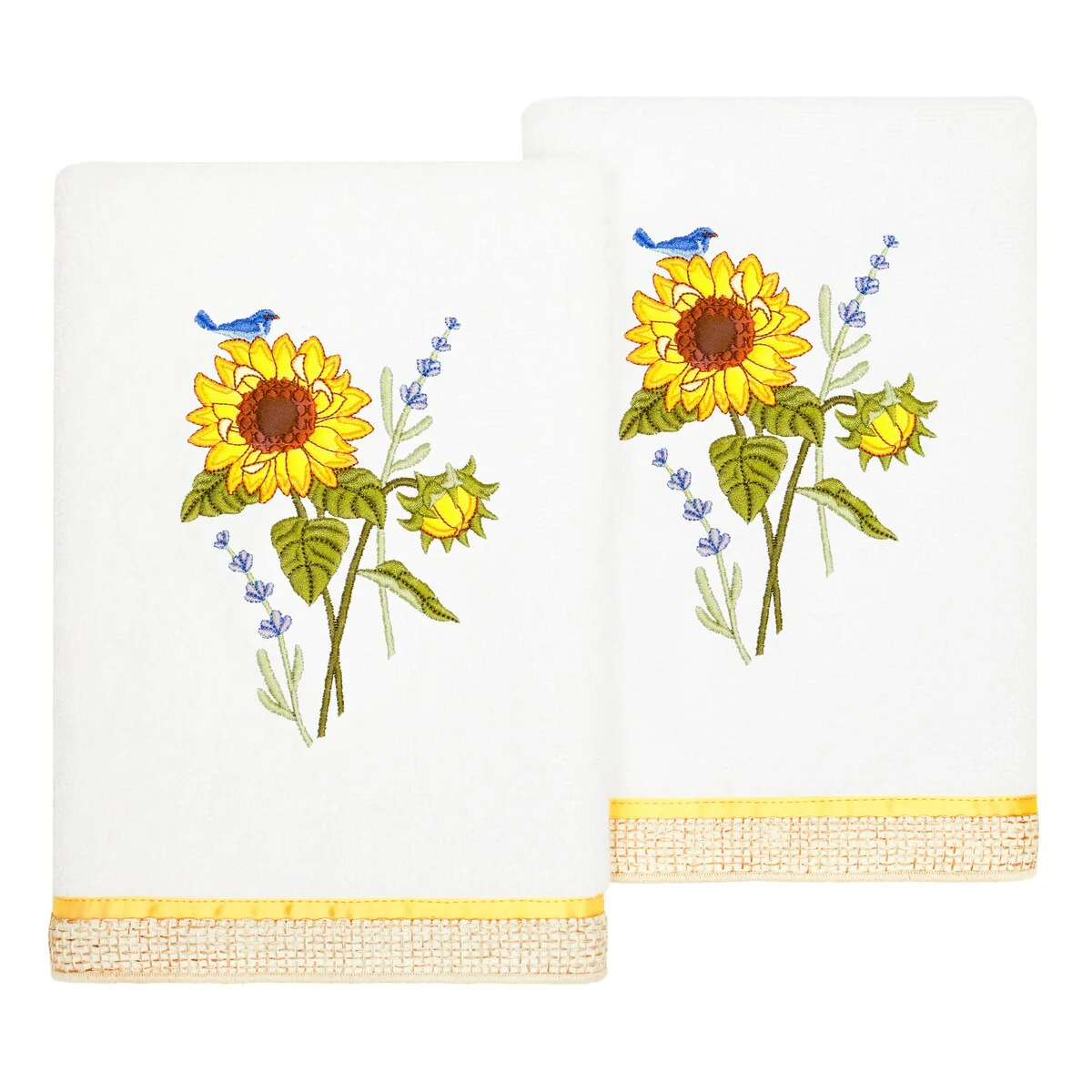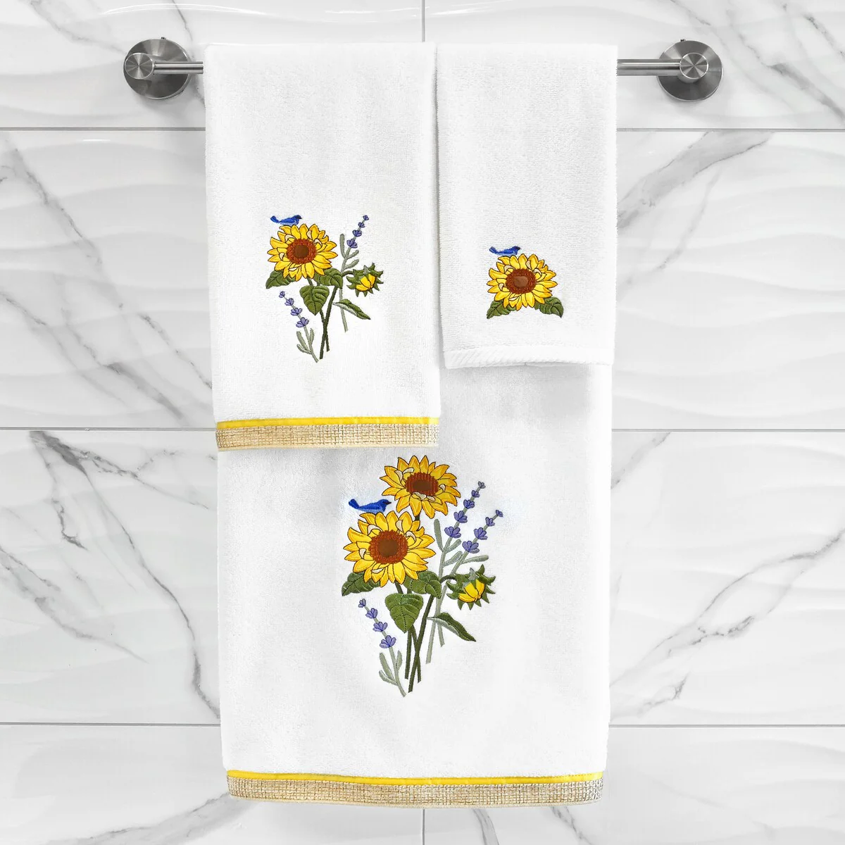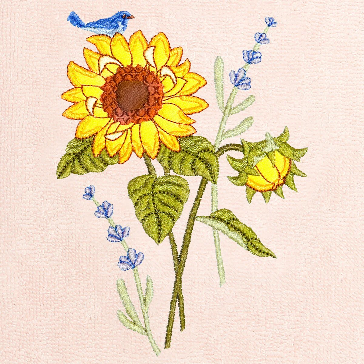 Create a mood of country charm in your bath with the Girasol Embellished Towel Collection by Authentic Hotel and Spa. These towels feature an applique embroidered bouquet of vibrant sunflowers and lavender, highlighted by a bright bird perched on top. Cloud soft and super absorbent, these luxurious, durable towels keep their plush appearance after washing. This collection is available in 8 elegant colors: White, Beige, Blush, Aqua, Silver, Cocoa, Charcoal and Marine. The Girasol Towel Collection brings a natural spirit and richness to your home decor and makes a great gift!