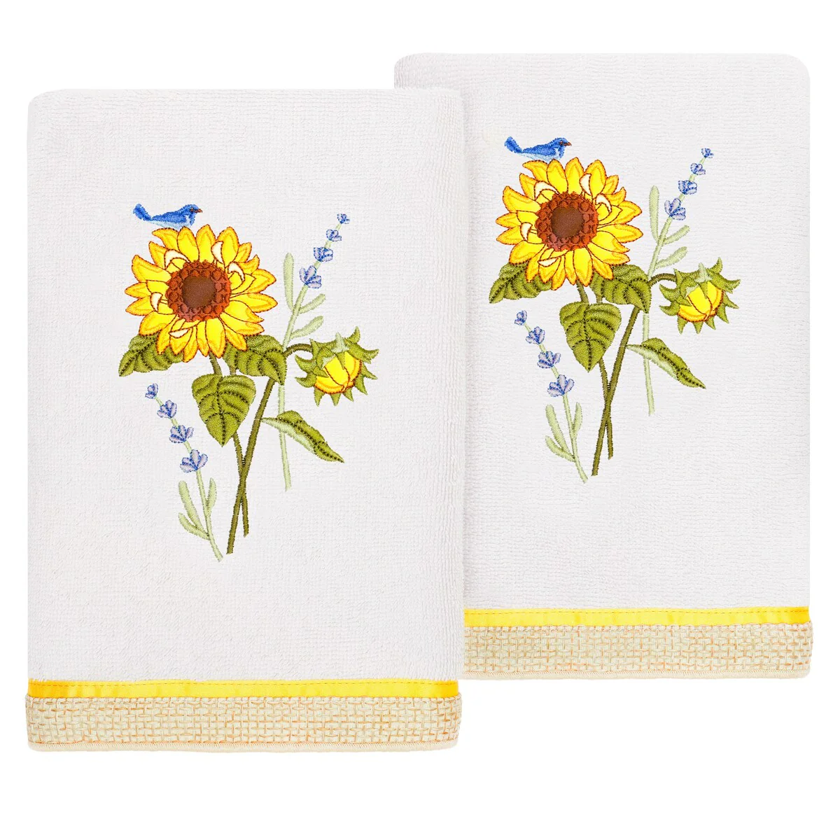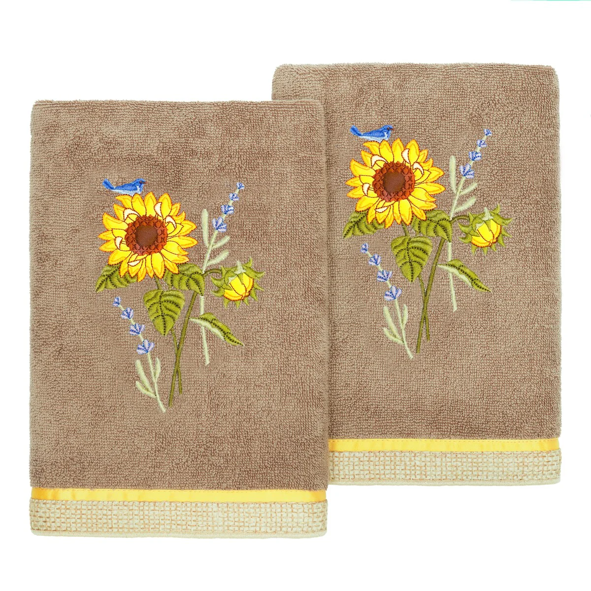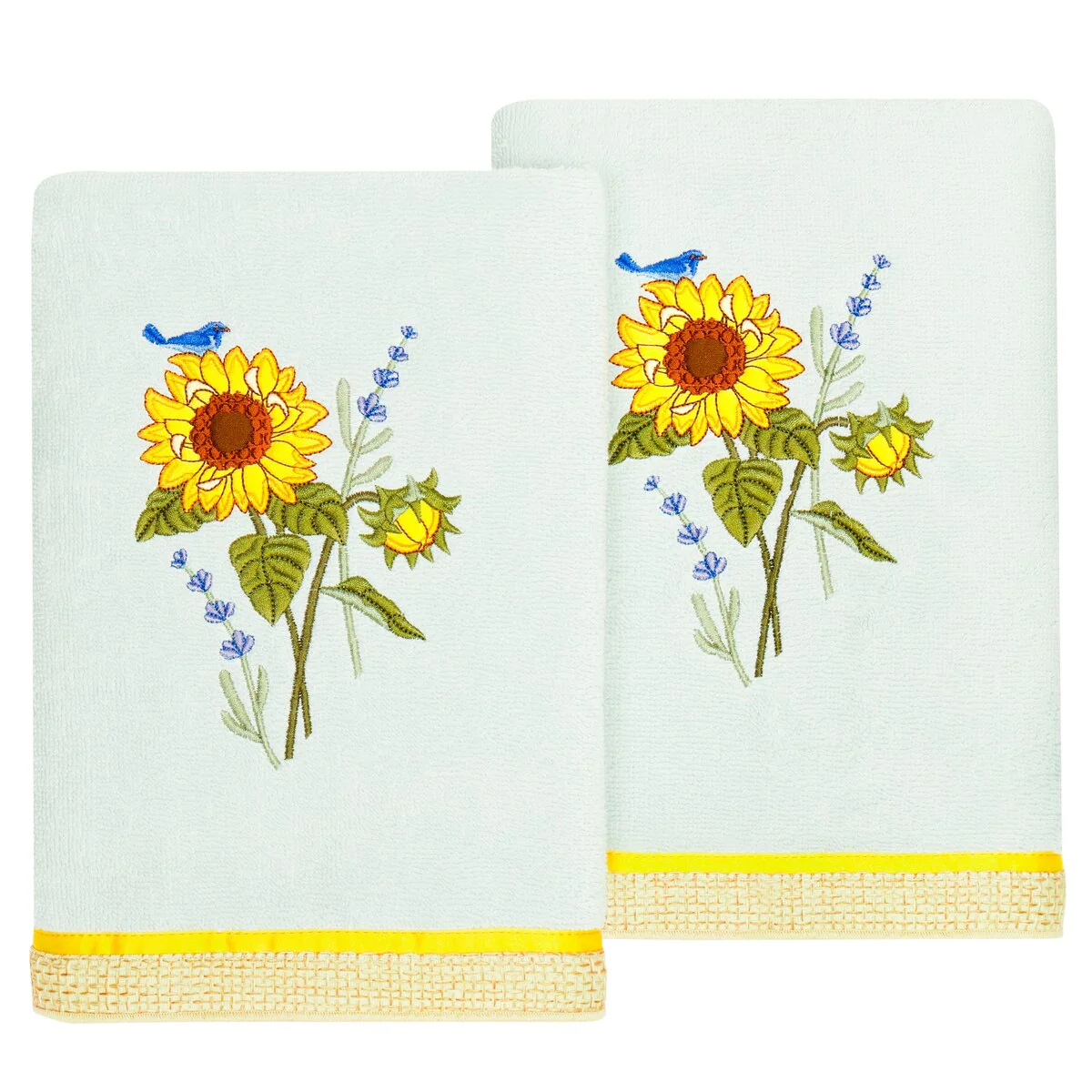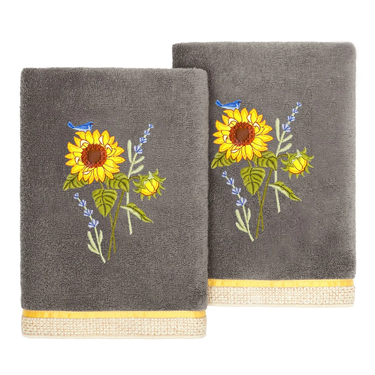 Create a mood of country charm in your bath with the Girasol Embellished Towel Collection by Authentic Hotel and Spa. These towels feature an applique embroidered bouquet of vibrant sunflowers and lavender, highlighted by a bright bird perched on top. Cloud soft and super absorbent, these luxurious, durable towels keep their plush appearance after washing. This collection is available in 8 elegant colors: White, Beige, Blush, Aqua, Silver, Cocoa, Charcoal and Marine. The Girasol Towel Collection brings a natural spirit and richness to your home decor and makes a great gift!
