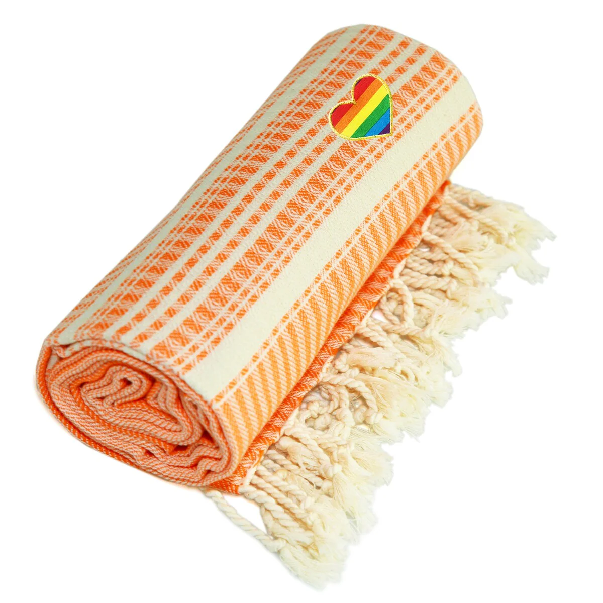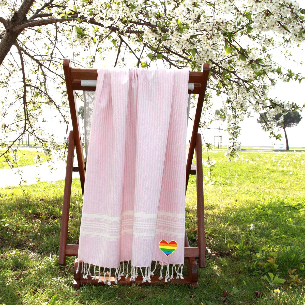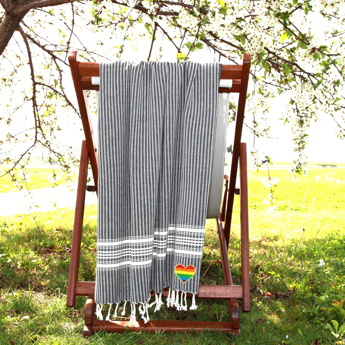 Ultra-soft and extremely absorbent herringbone weave, cheerful rainbow heart embroidered beach towel is 100% natural cotton and hand woven on ancient looms in Turkey. This beach towel is light weight and generously sized, making it perfect to use for home and travel as a bath towel, beach towel or sarong. To get the best softness, it is recommended to wash before use.