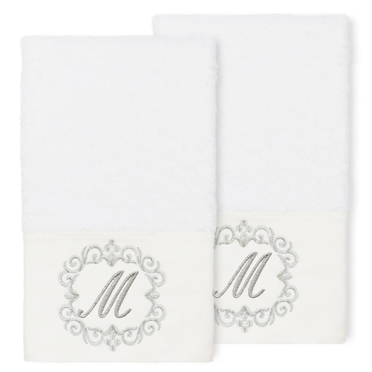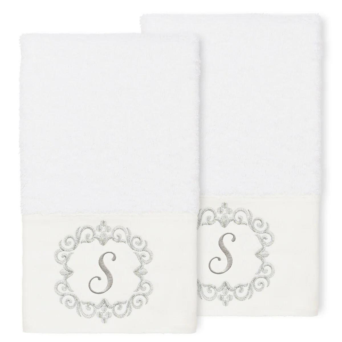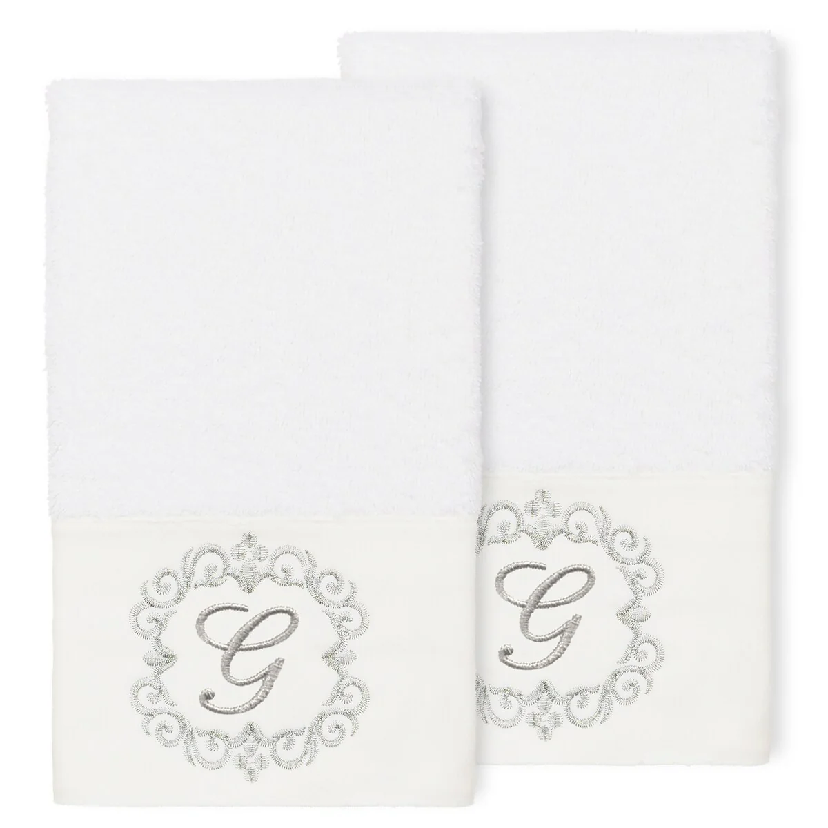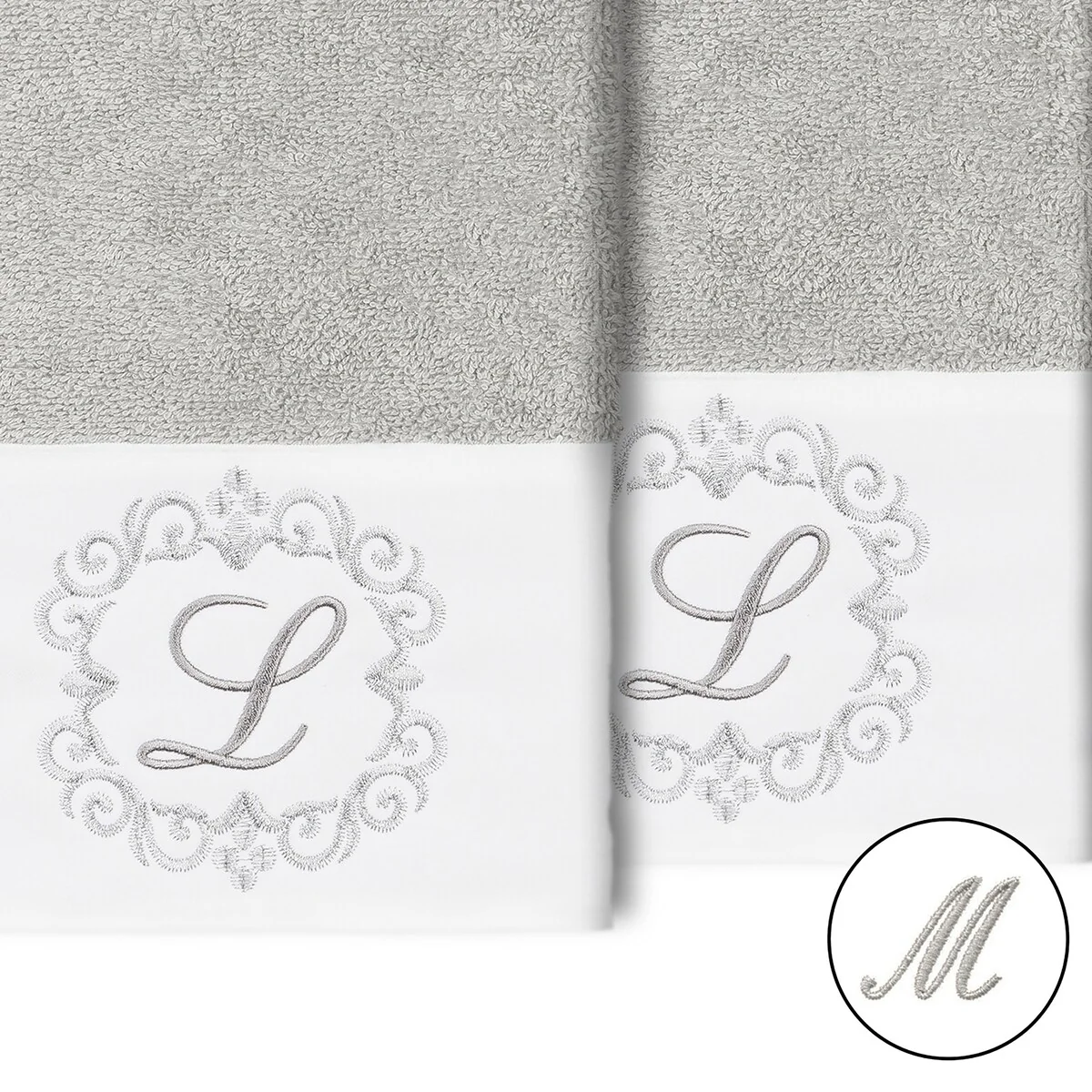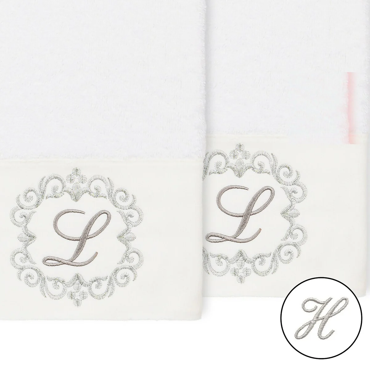 The Monica Embellished Towel Collection features an elegant metallic crest motif with your monogram embroidered on a crisp white border. These soft and luxurious towels are made of 100% premium Turkish Cotton and offer lasting absorbency and superior durability.