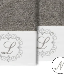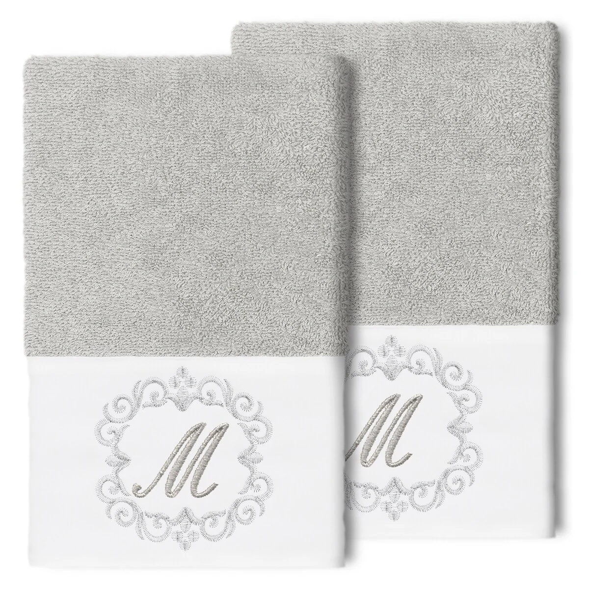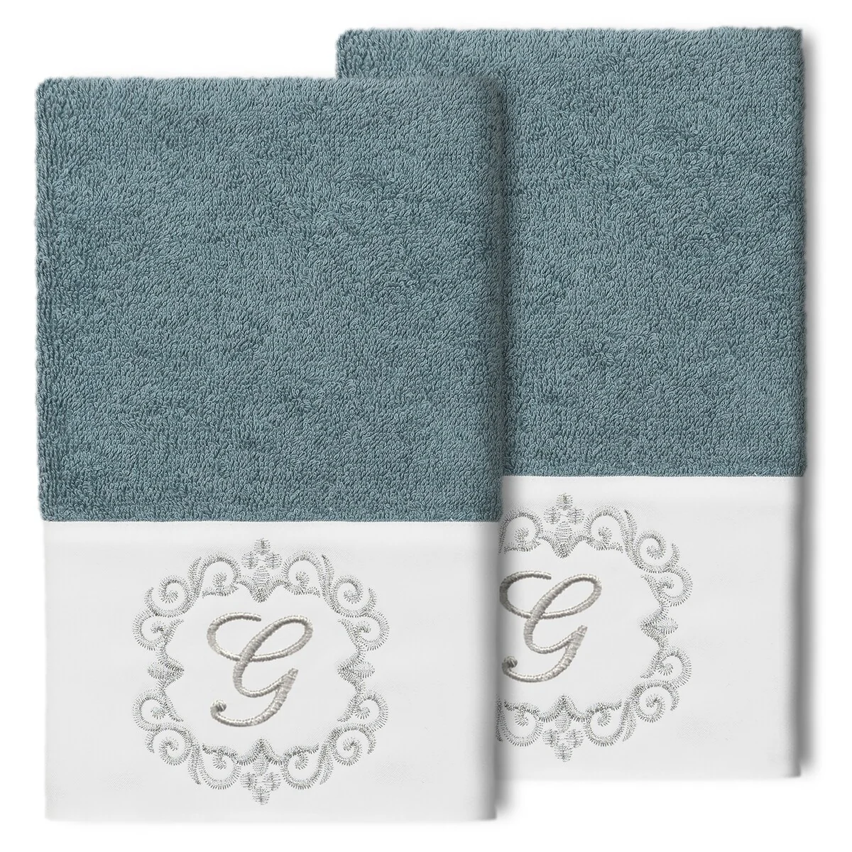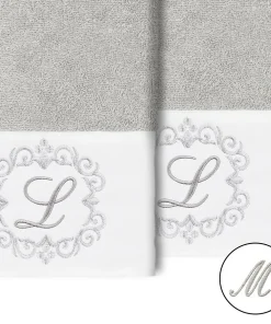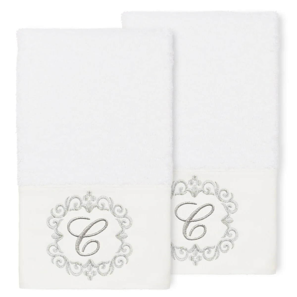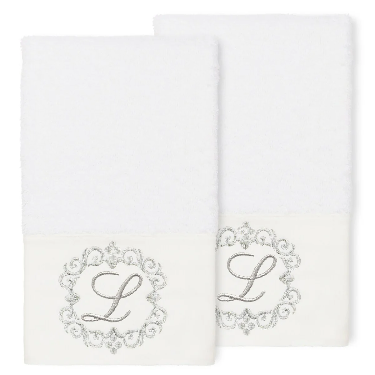 The Monica Embellished Towel Collection features an elegant metallic crest motif with your monogram embroidered on a crisp white border. These soft and luxurious towels are made of 100% premium Turkish Cotton and offer lasting absorbency and superior durability.