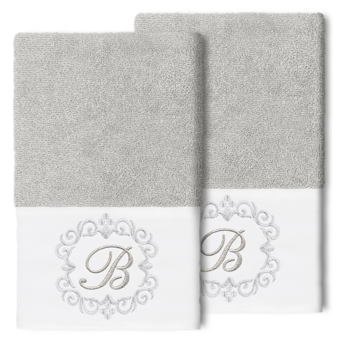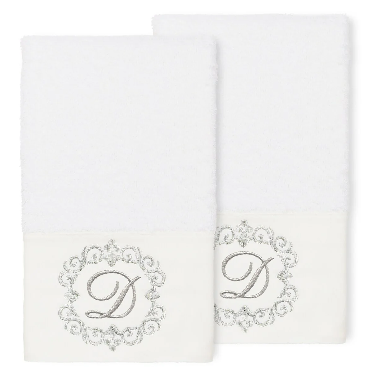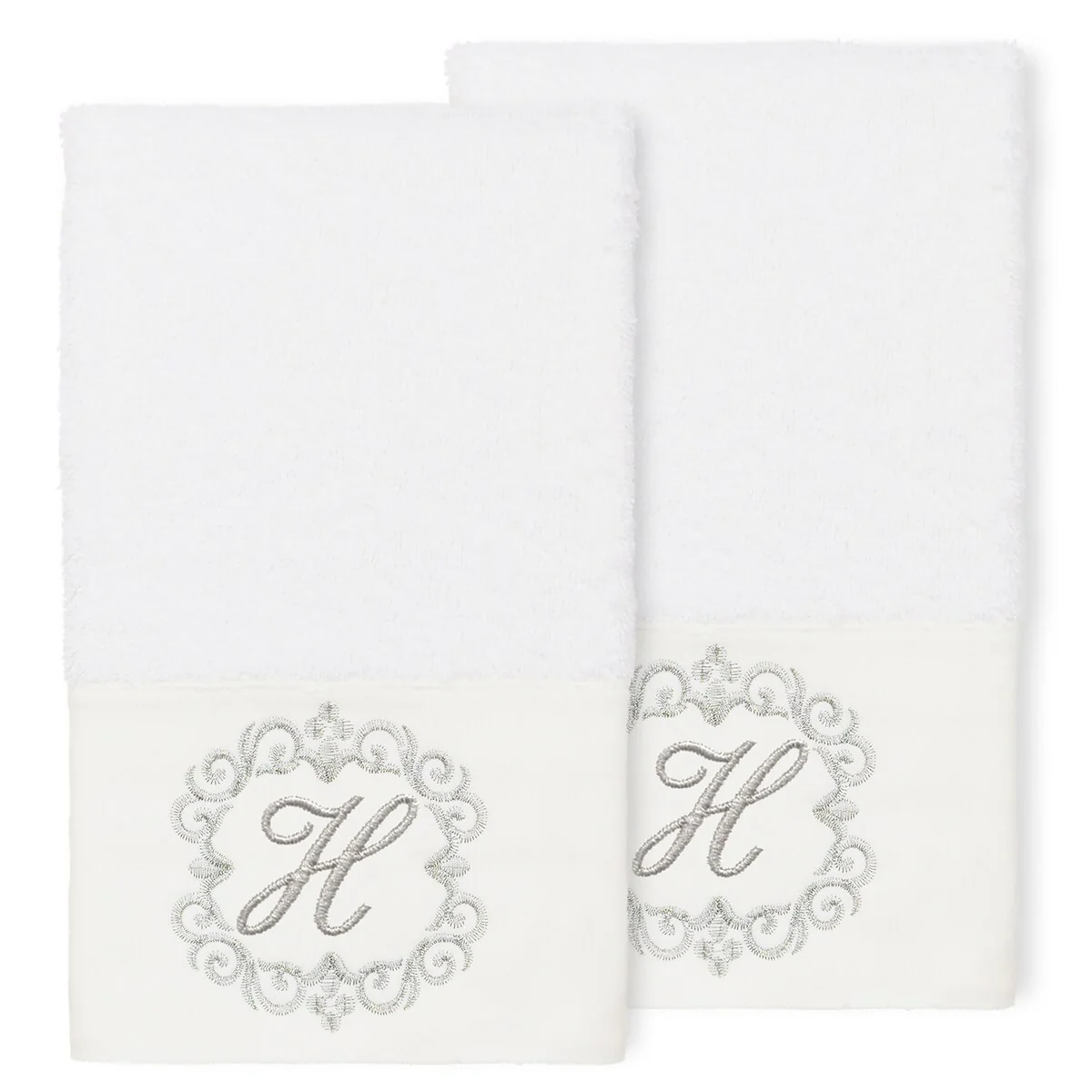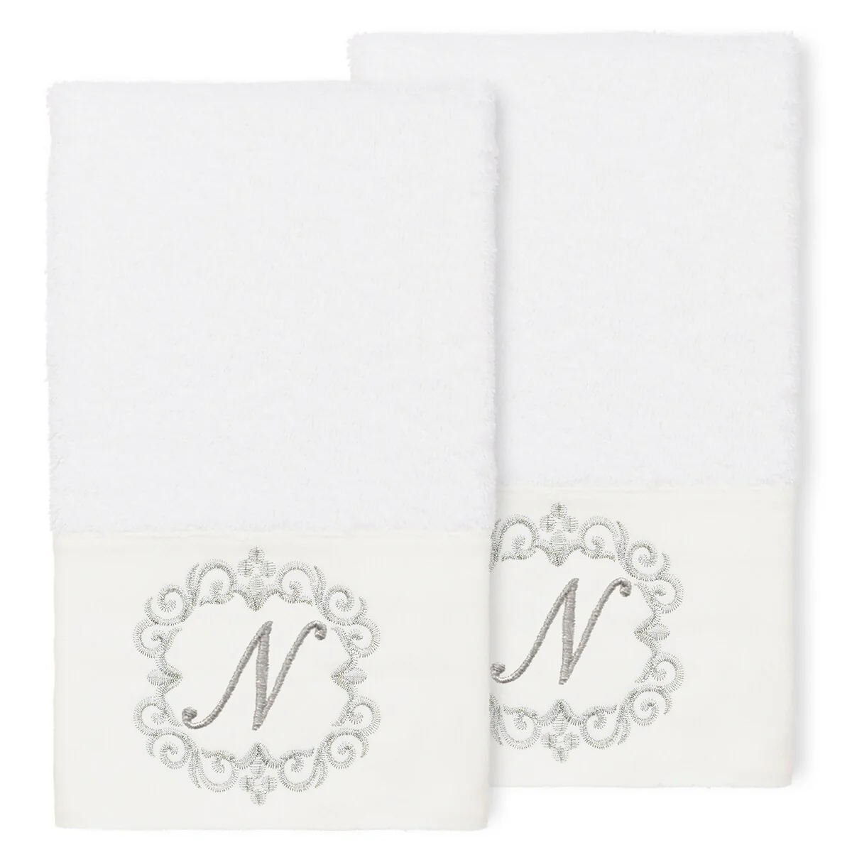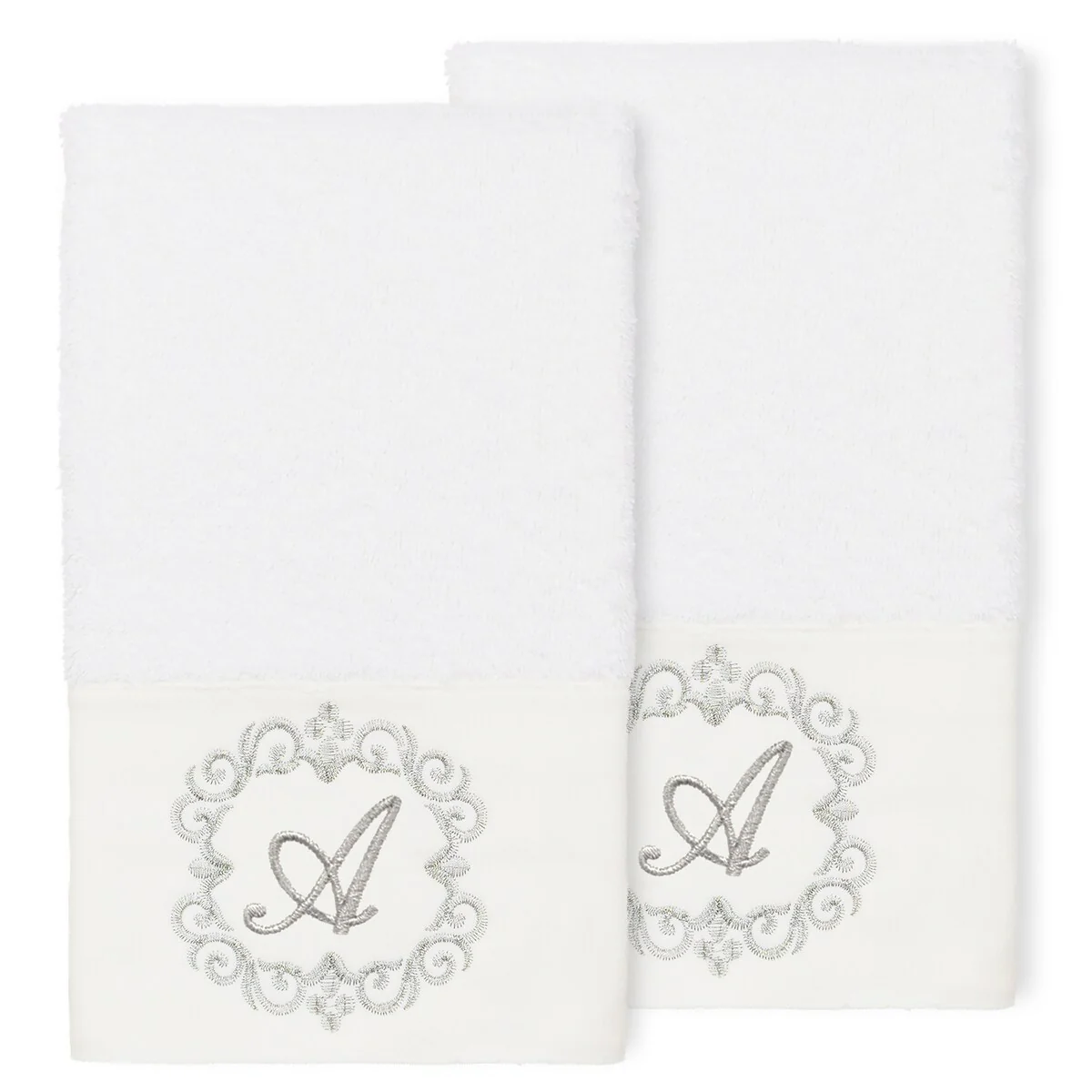 The Monica Embellished Towel Collection features an elegant metallic crest motif with your monogram embroidered on a crisp white border. These soft and luxurious towels are made of 100% premium Turkish Cotton and offer lasting absorbency and superior durability.