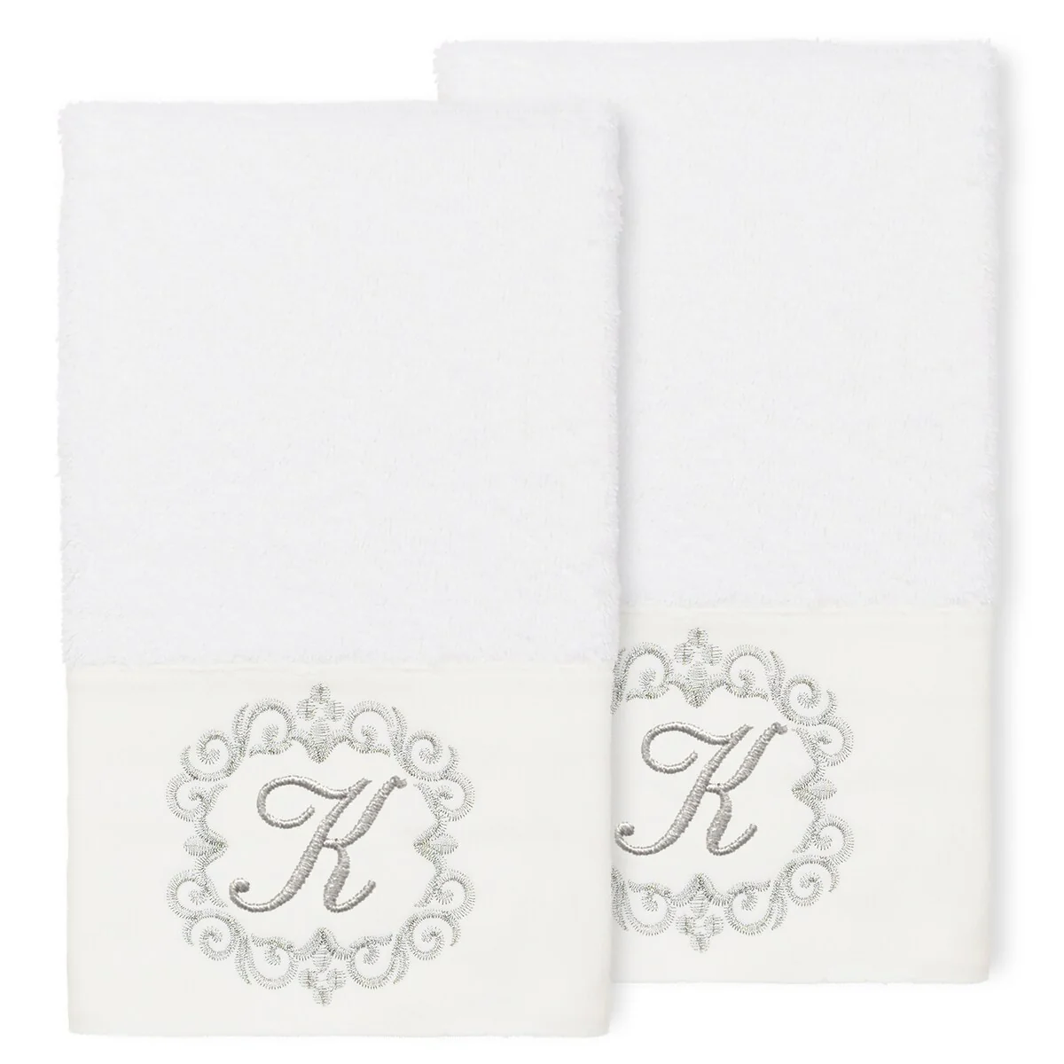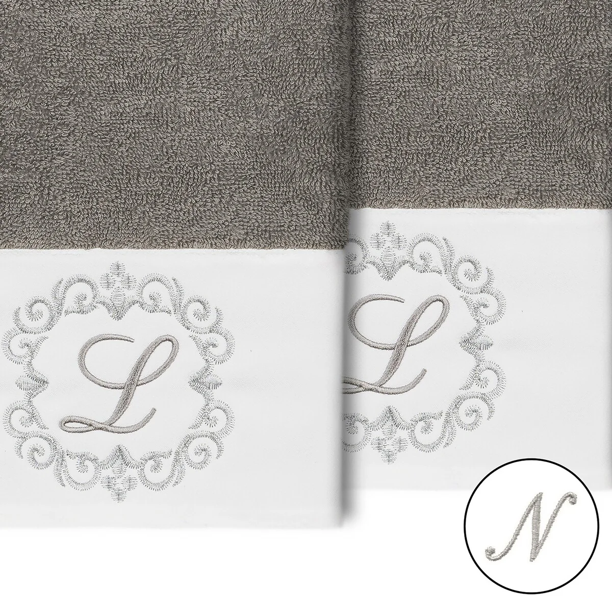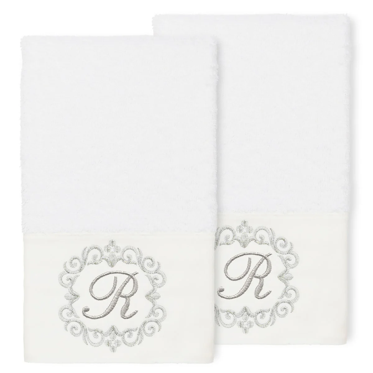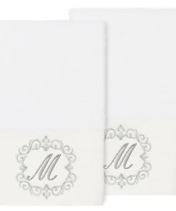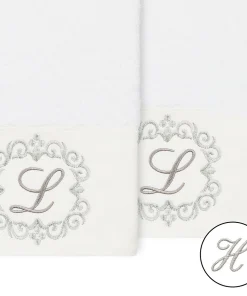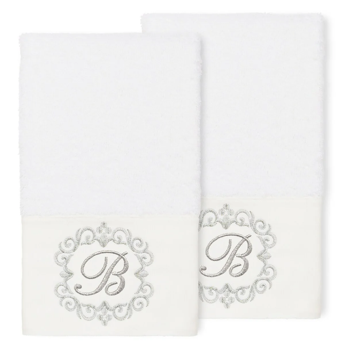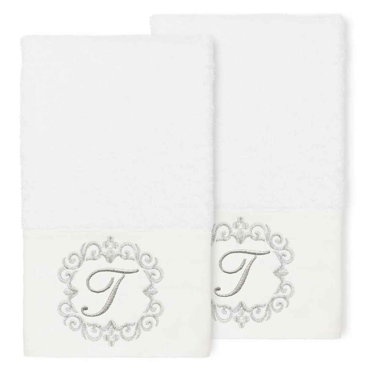 The Monica Embellished Towel Collection features an elegant metallic crest motif with your monogram embroidered on a crisp white border. These soft and luxurious towels are made of 100% premium Turkish Cotton and offer lasting absorbency and superior durability.