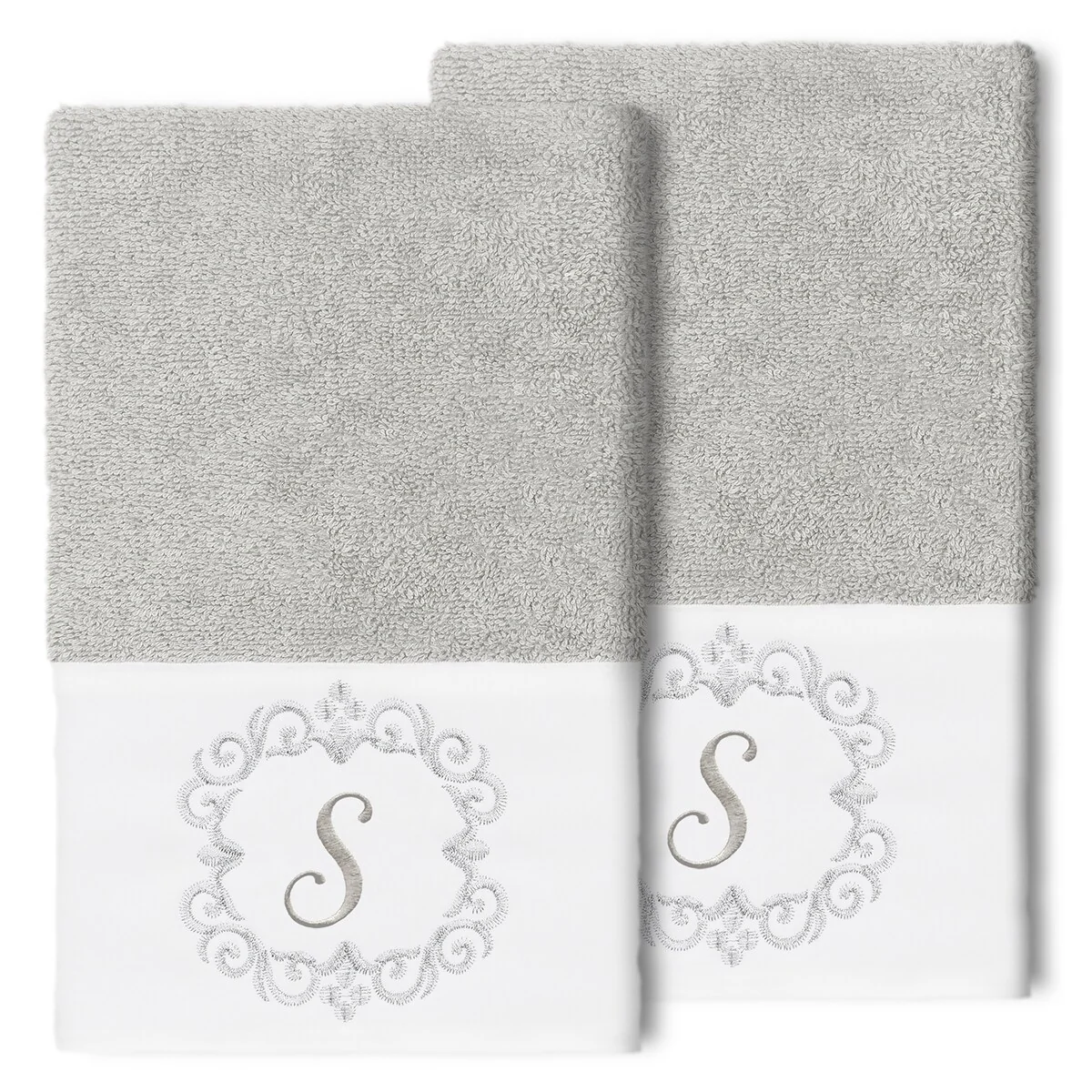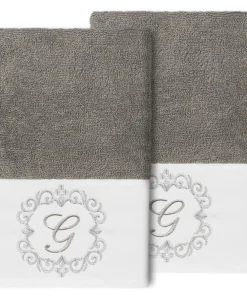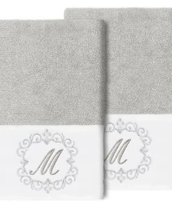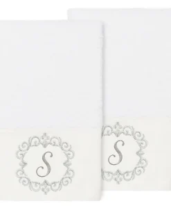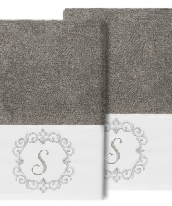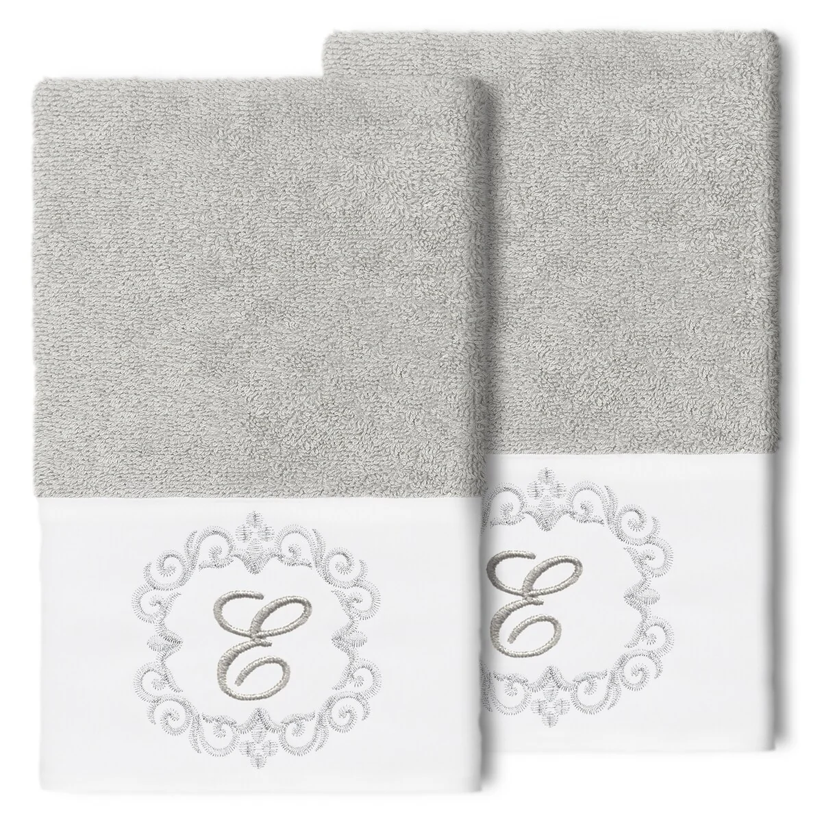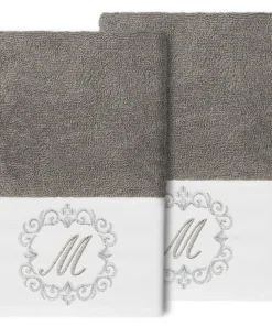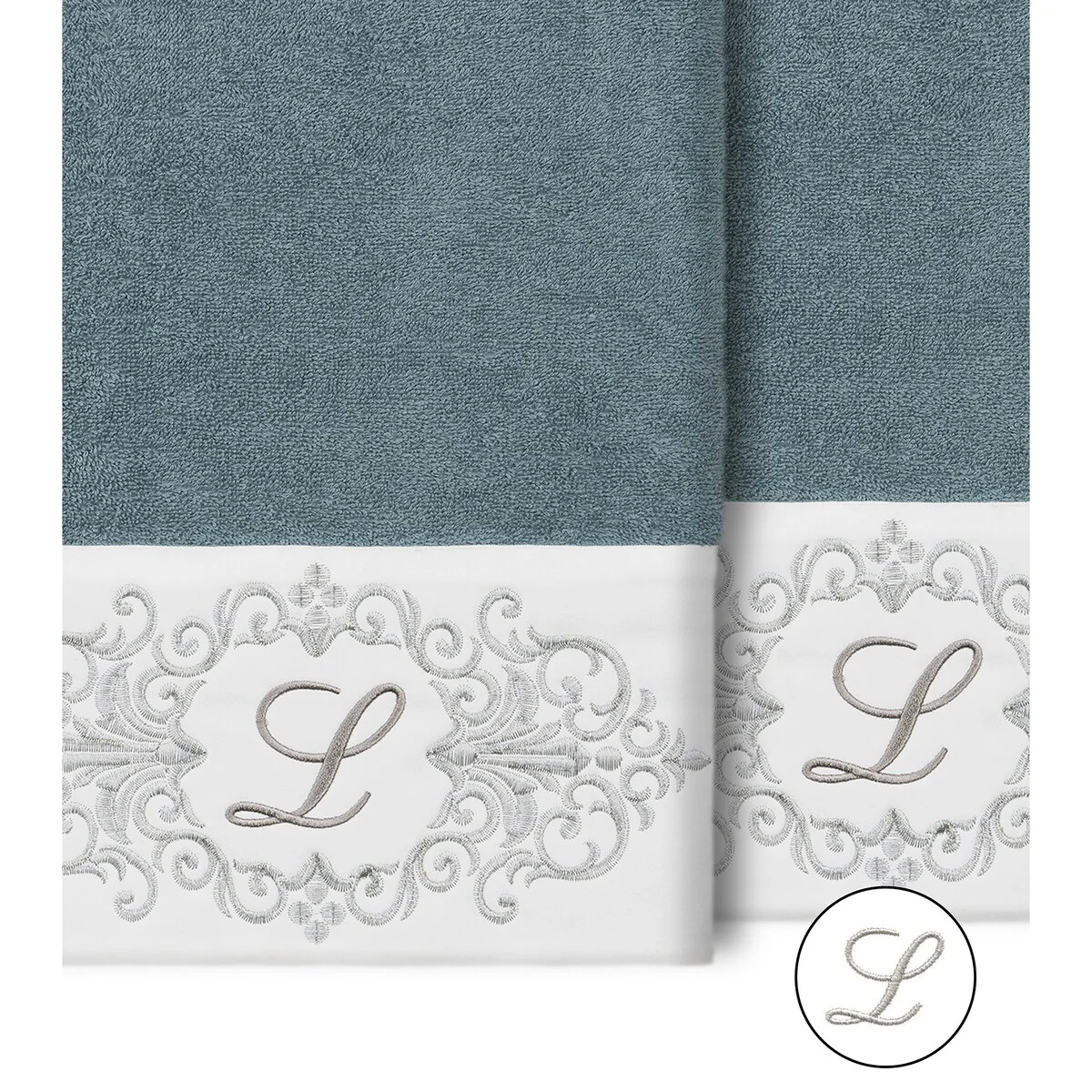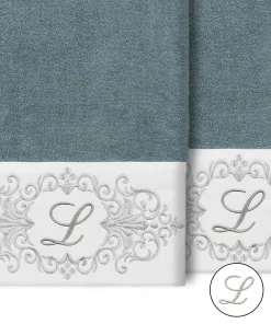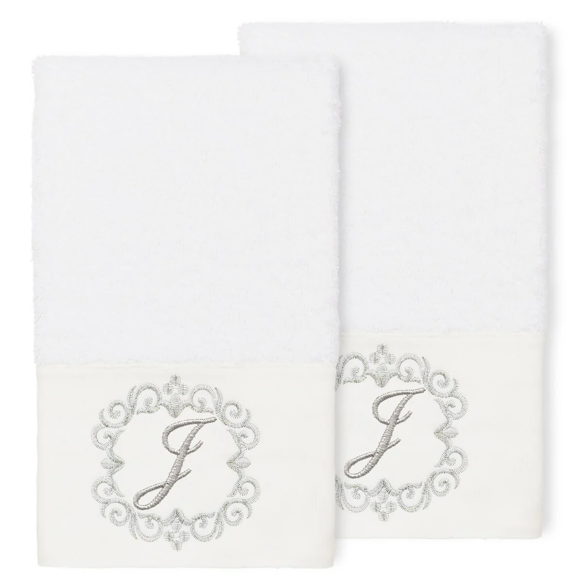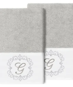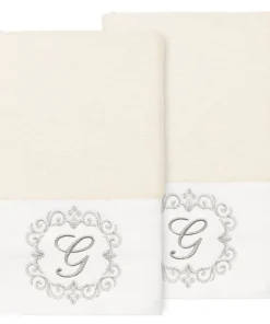 The Monica Embellished Towel Collection features an elegant metallic crest motif with your monogram embroidered on a crisp white border. These soft and luxurious towels are made of 100% premium Turkish Cotton and offer lasting absorbency and superior durability.