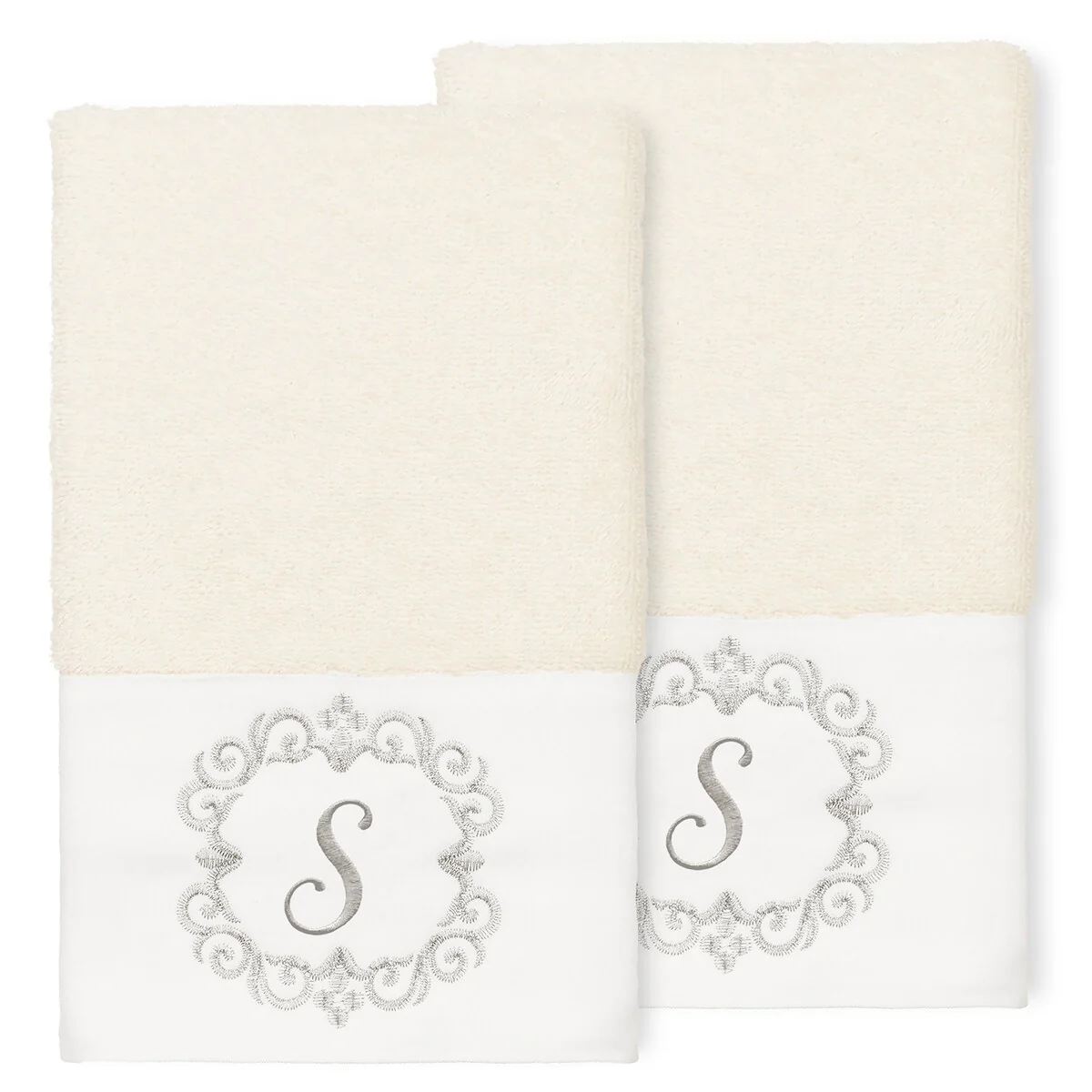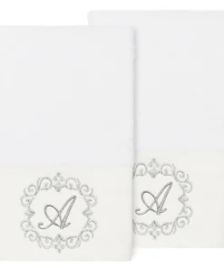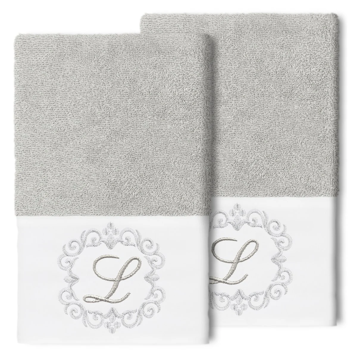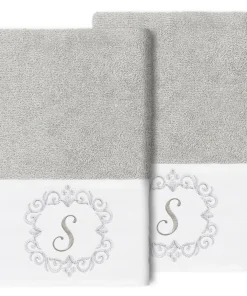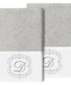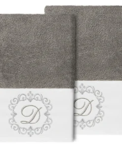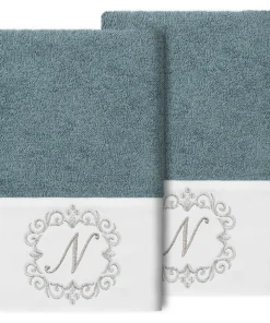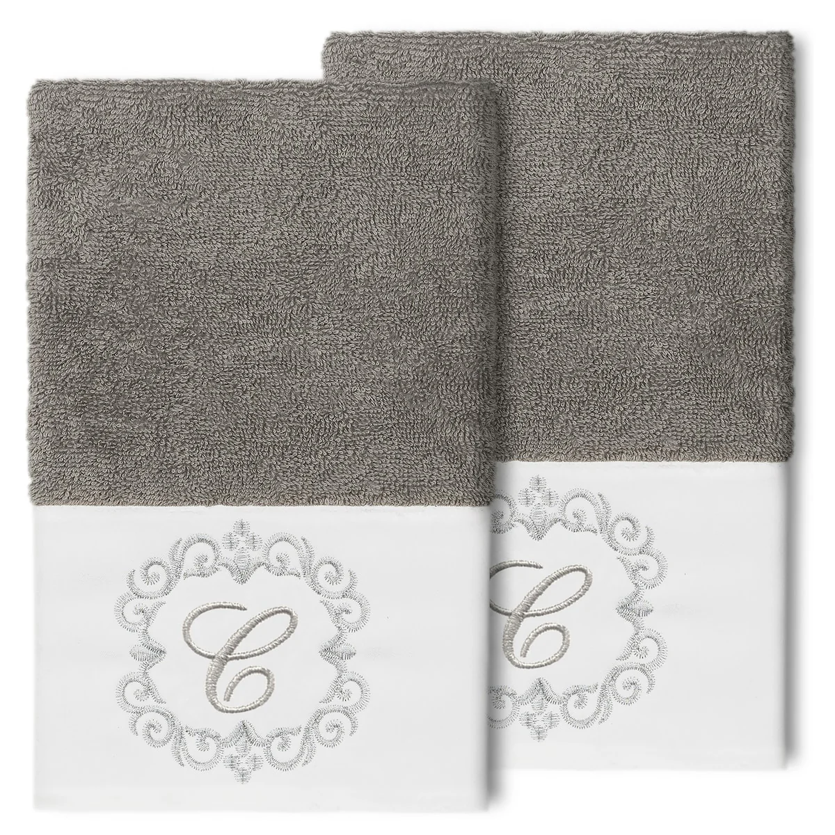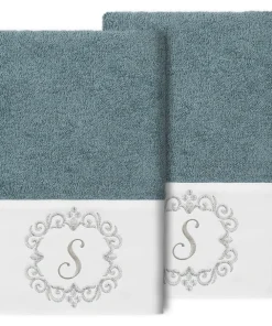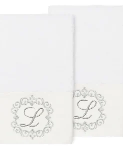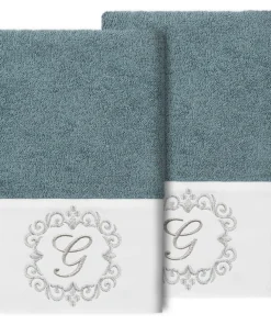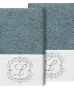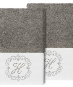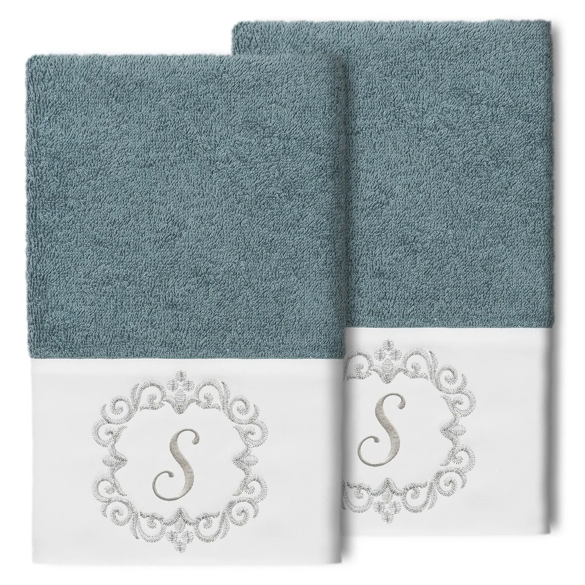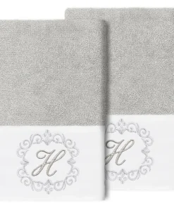 The Monica Embellished Towel Collection features an elegant metallic crest motif with your monogram embroidered on a crisp white border. These soft and luxurious towels are made of 100% premium Turkish Cotton and offer lasting absorbency and superior durability.
