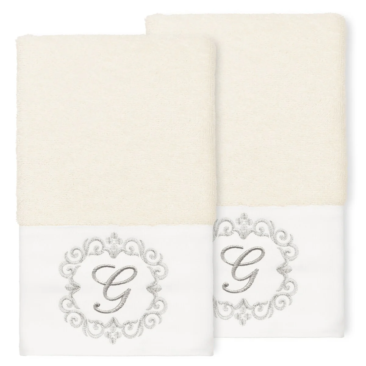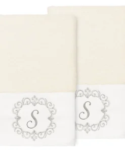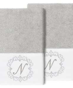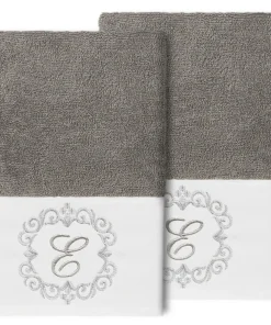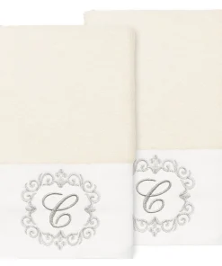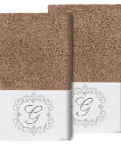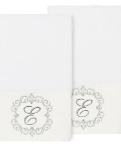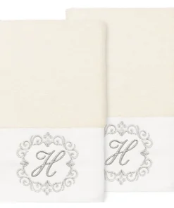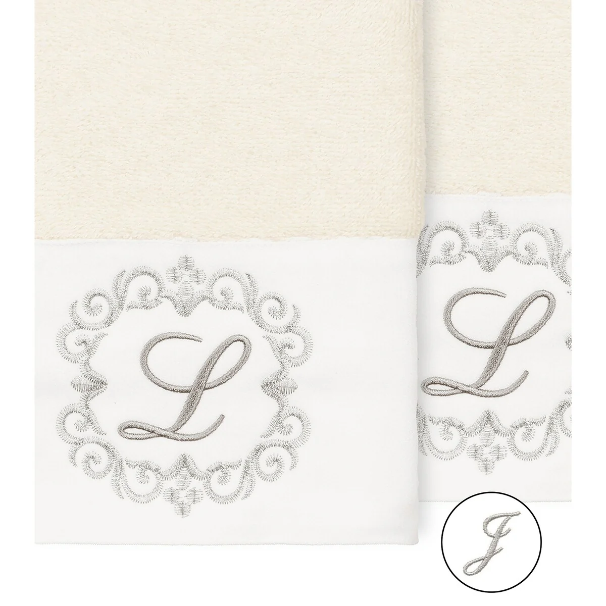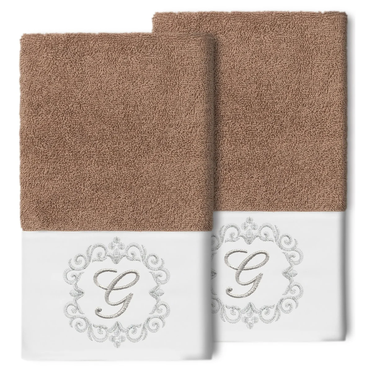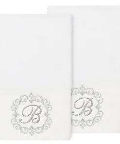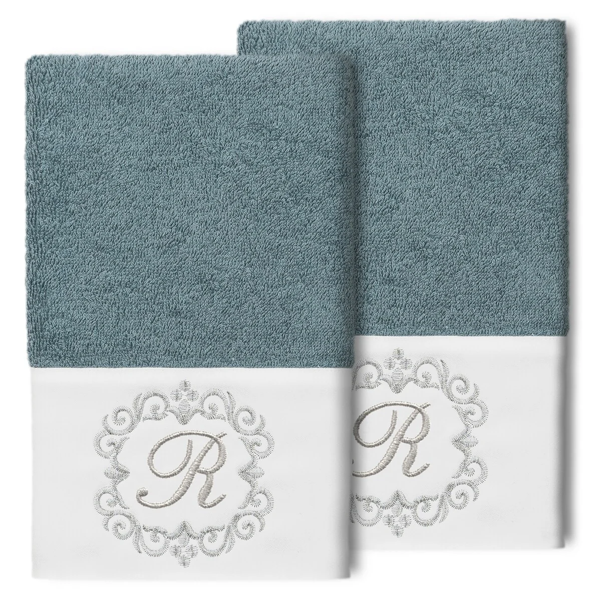 The Monica Embellished Towel Collection features an elegant metallic crest motif with your monogram embroidered on a crisp white border. These soft and luxurious towels are made of 100% premium Turkish Cotton and offer lasting absorbency and superior durability.