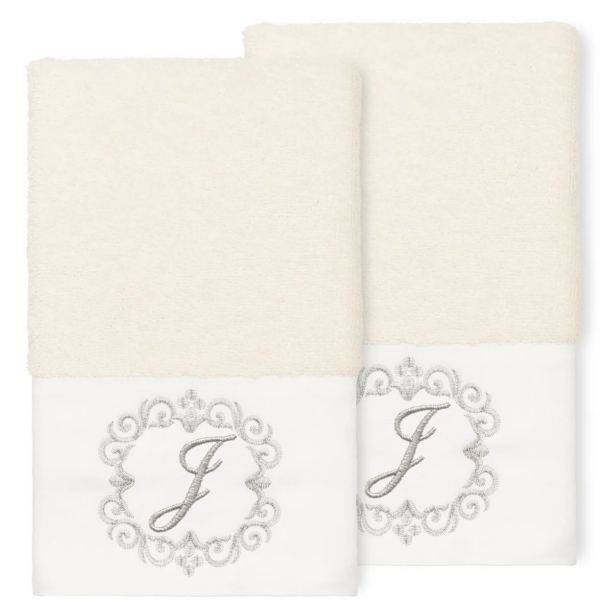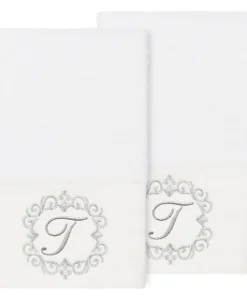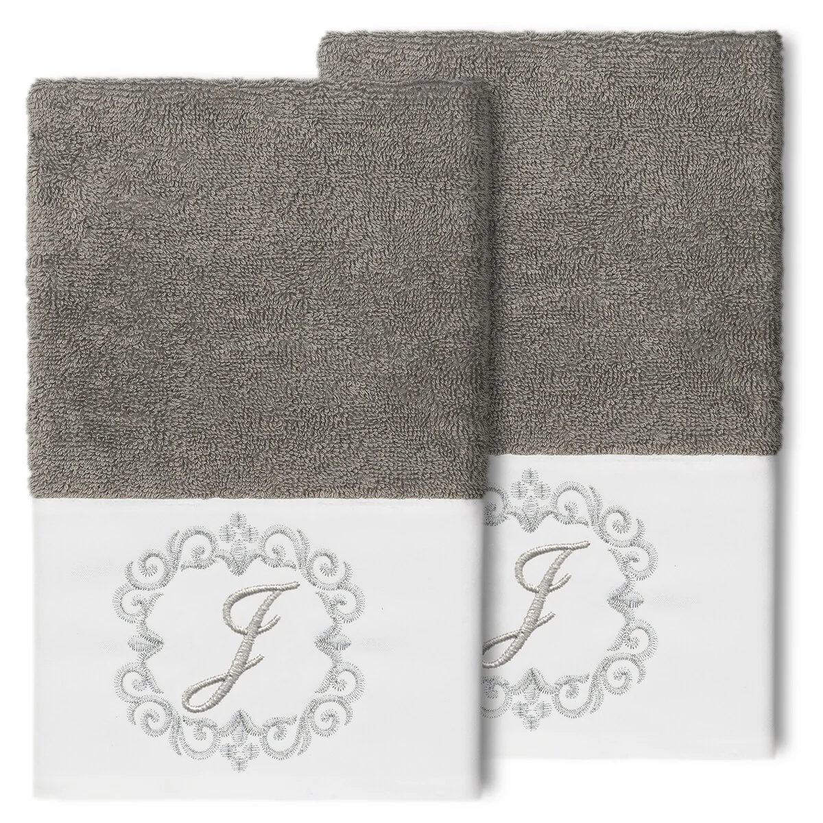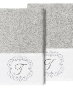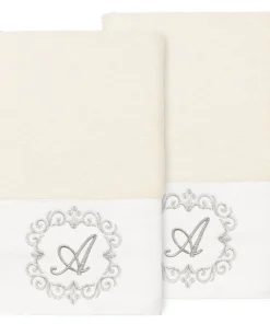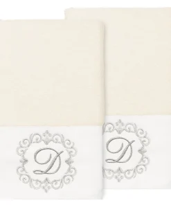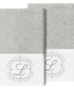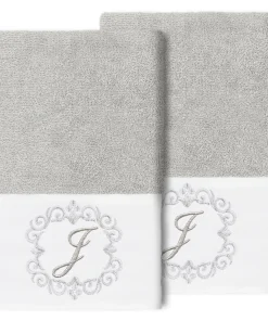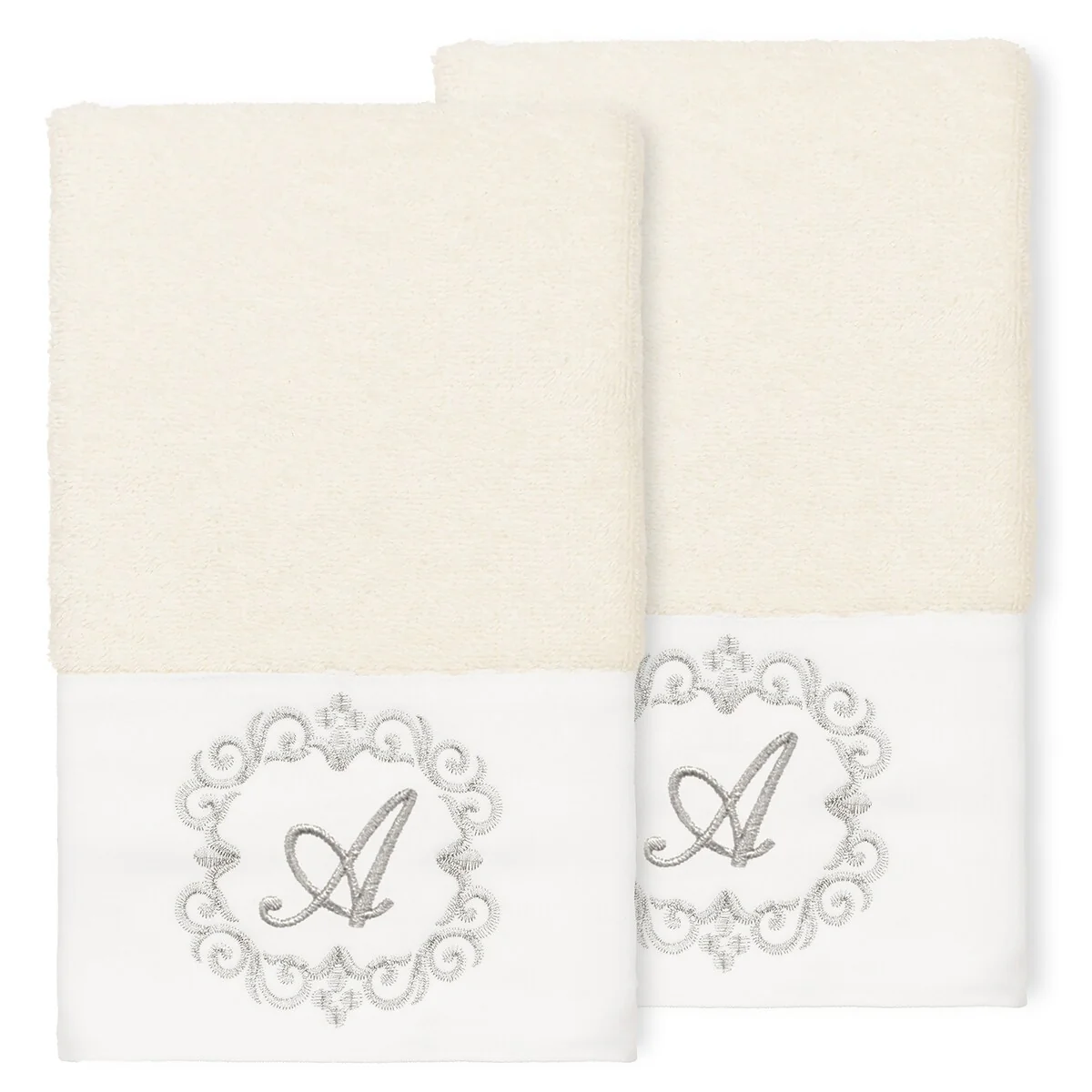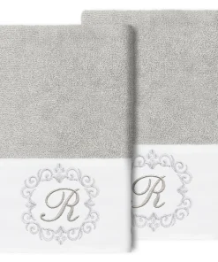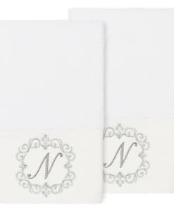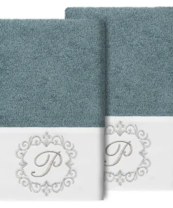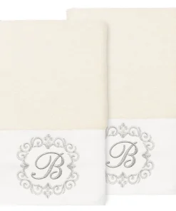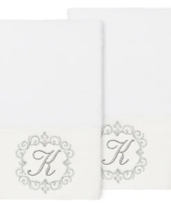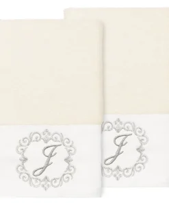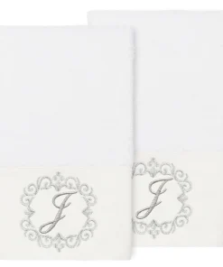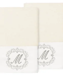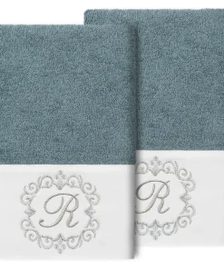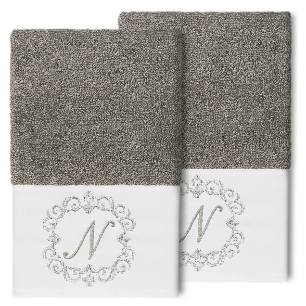 The Monica Embellished Towel Collection features an elegant metallic crest motif with your monogram embroidered on a crisp white border. These soft and luxurious towels are made of 100% premium Turkish Cotton and offer lasting absorbency and superior durability.
