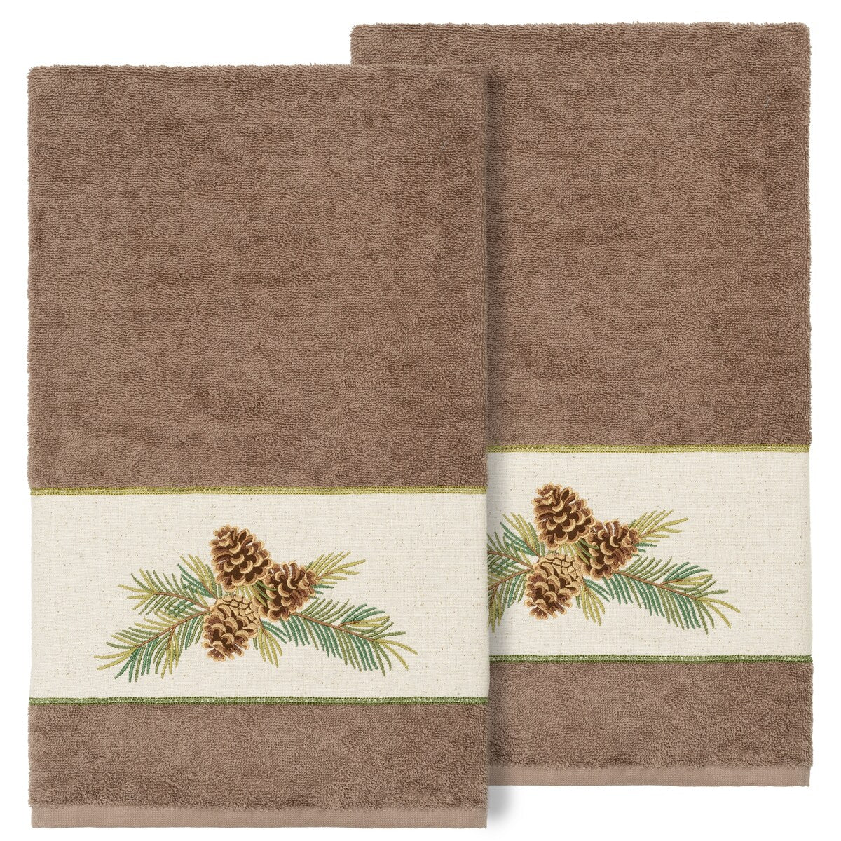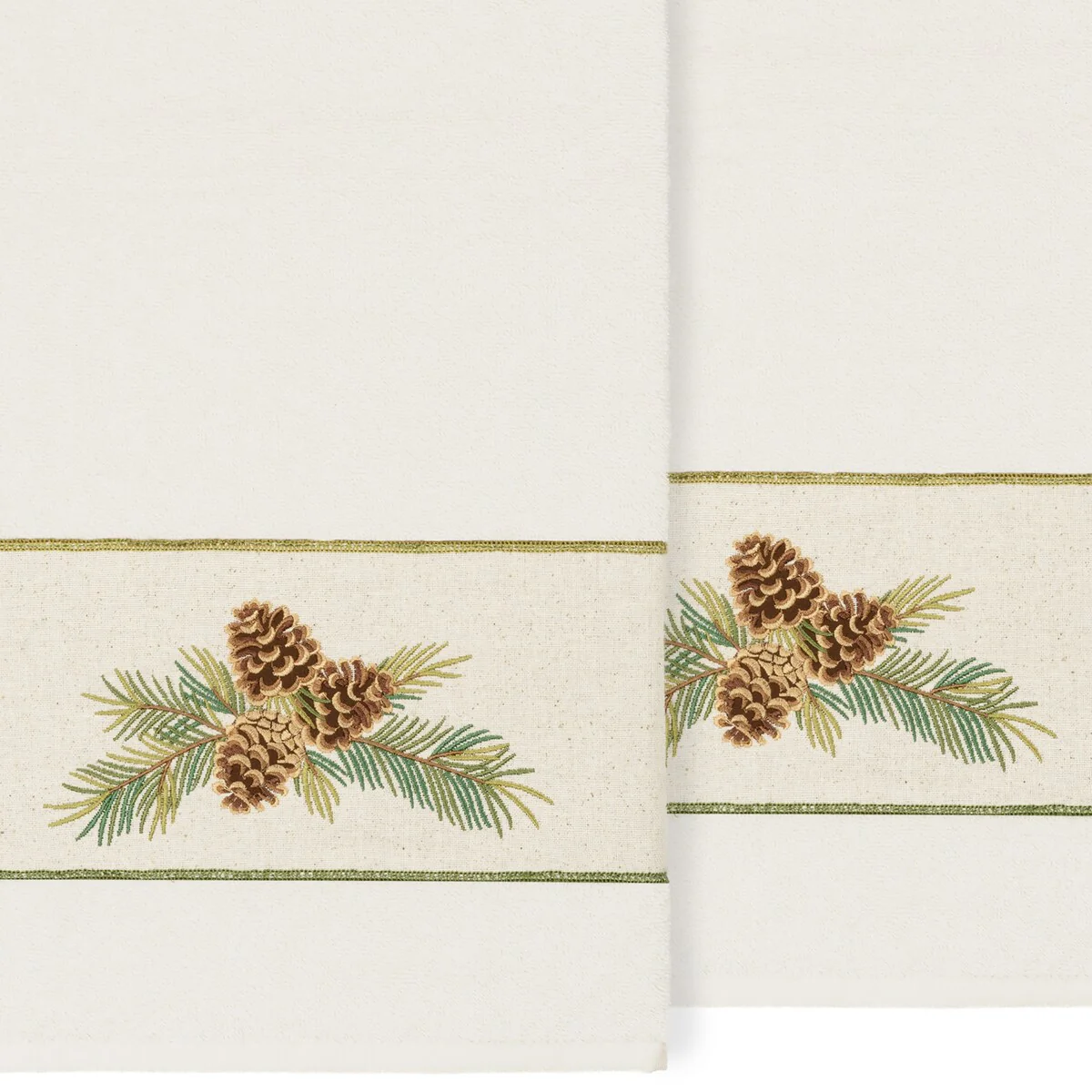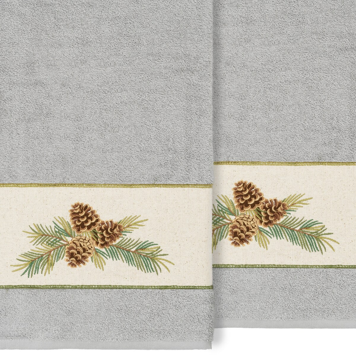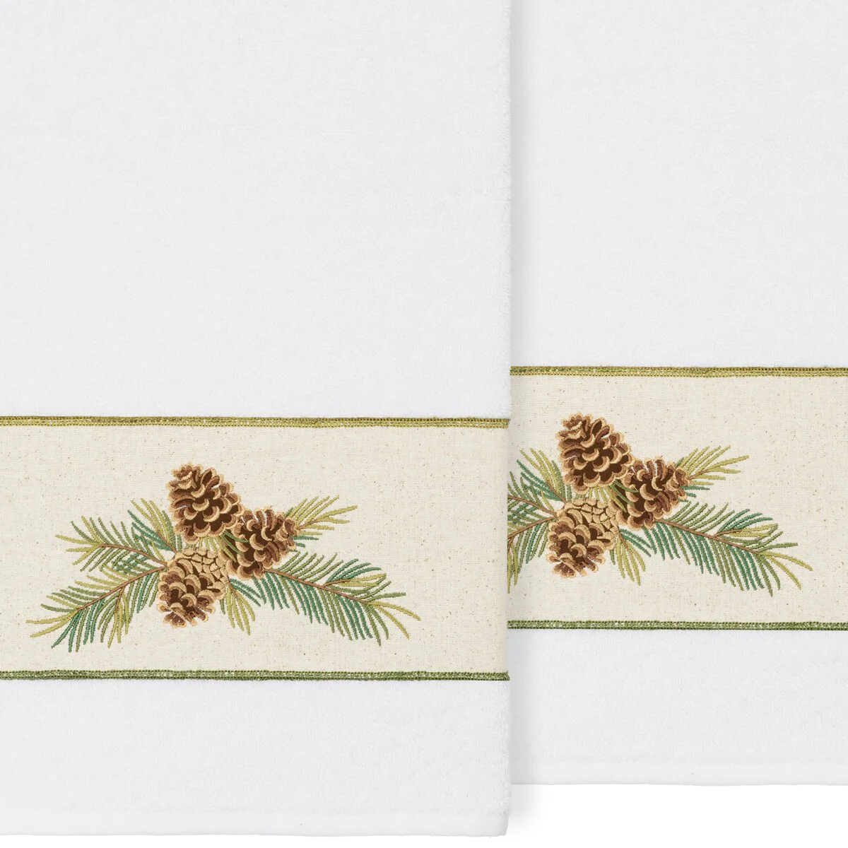 The Pierre Embellished Towel Collection by Authentic Hotel and Spa features a rustic pinecones on branches motif, embroidered on a natural cotton osnaburg cloth border. These soft and luxurious towels are made of 100% premium Turkish Cotton and offer lasting absorbency and superior durability.