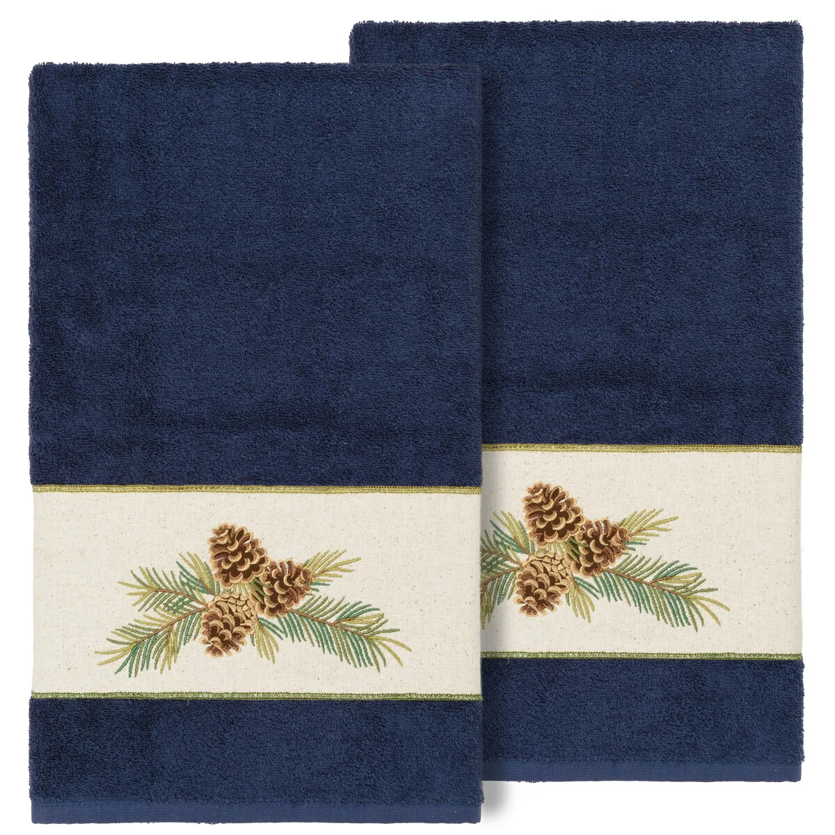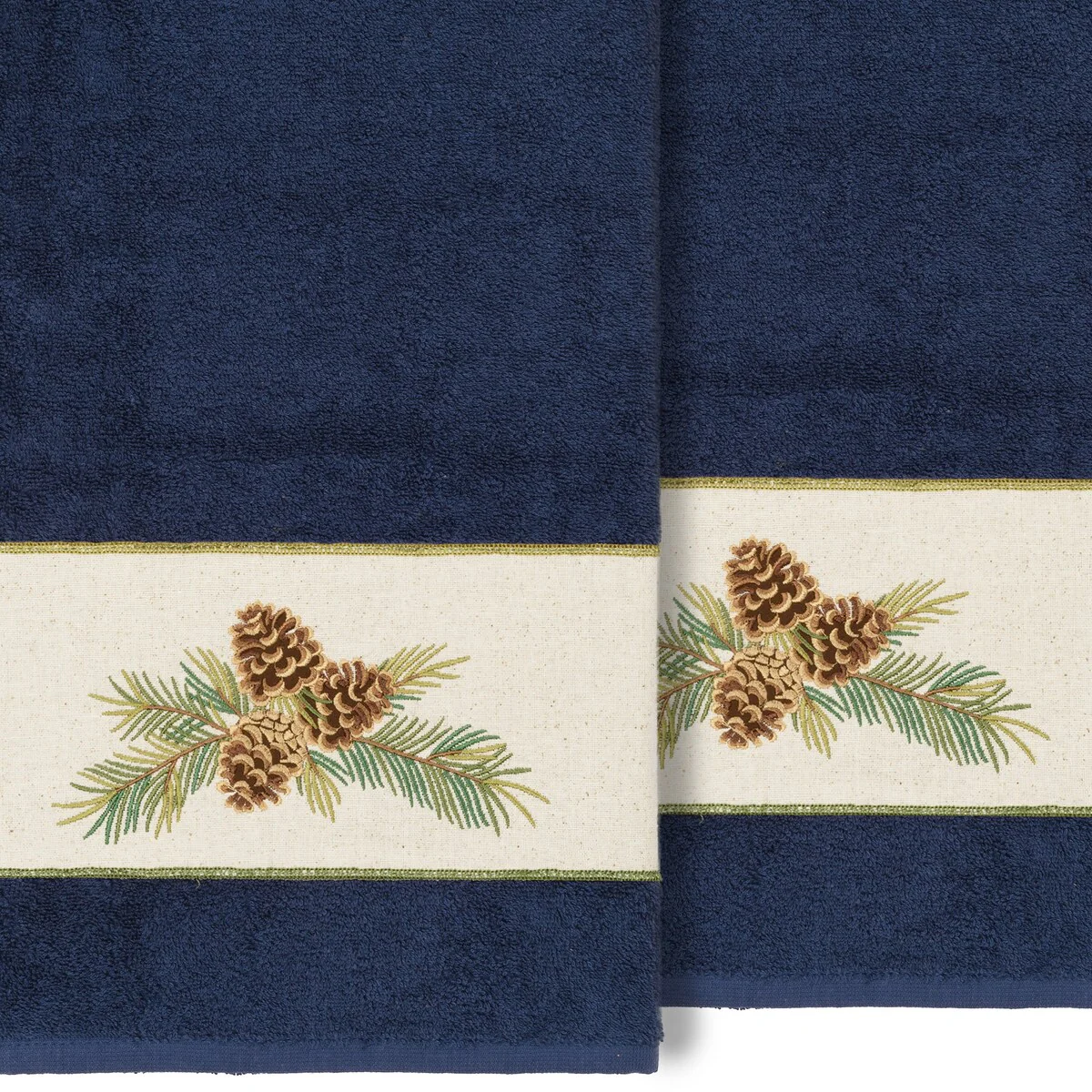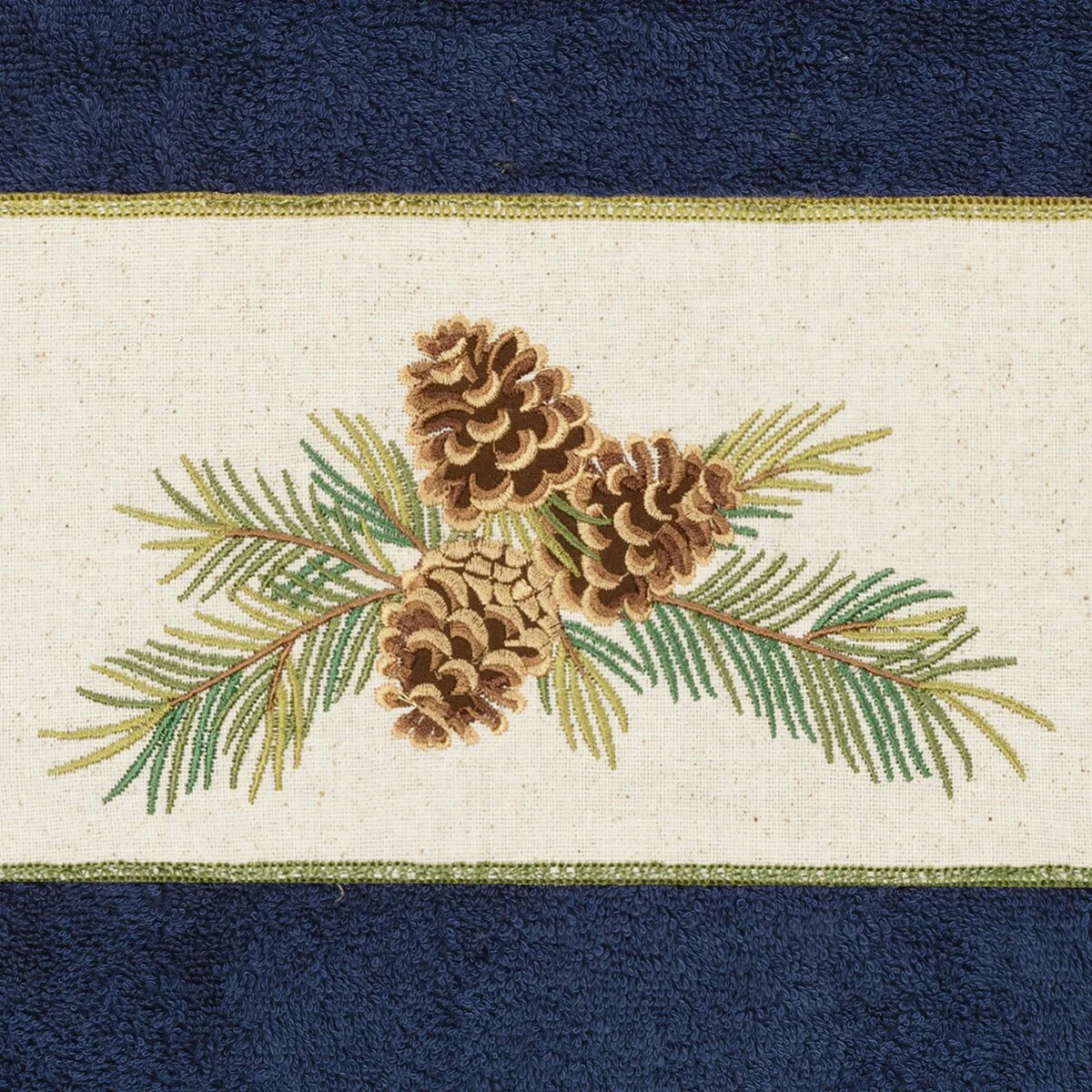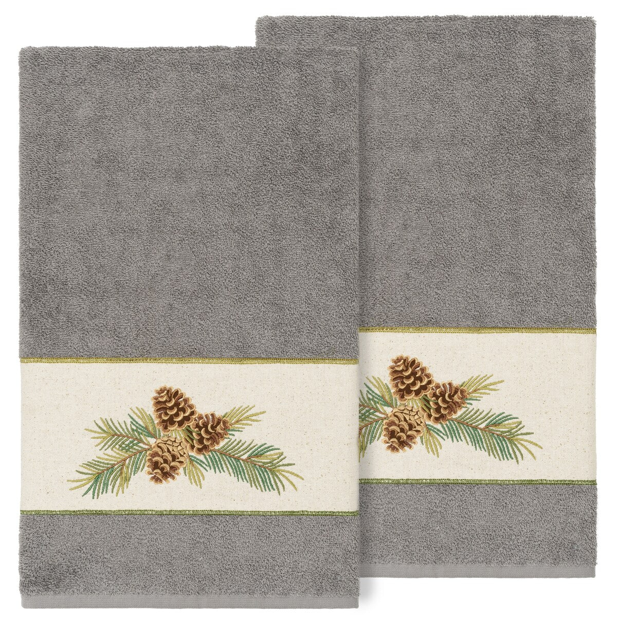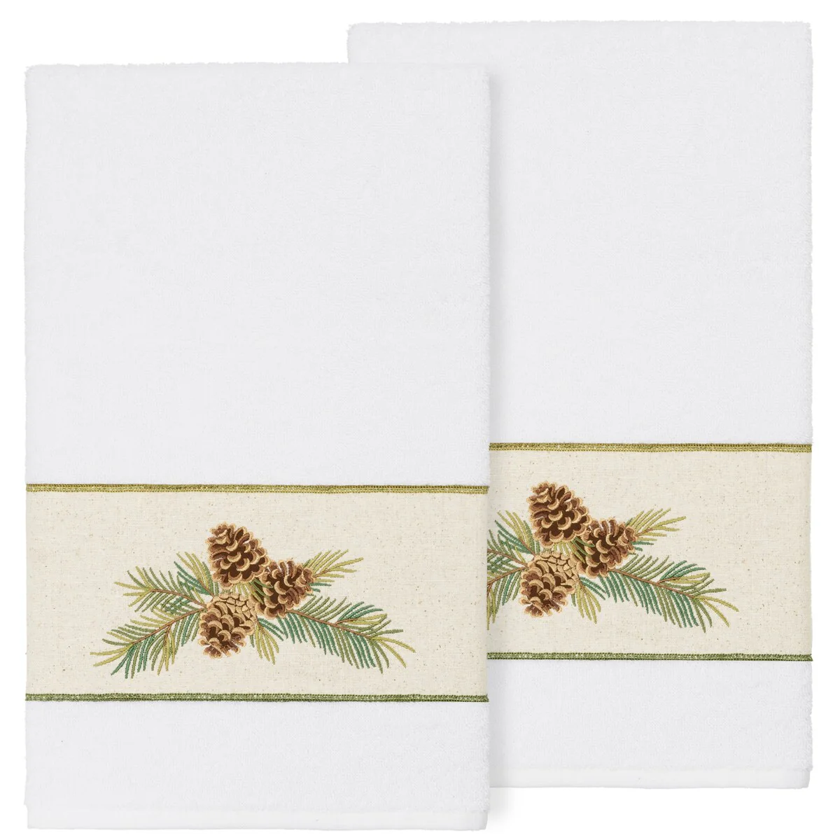 The Pierre Embellished Towel Collection by Authentic Hotel and Spa features a rustic pinecones on branches motif, embroidered on a natural cotton osnaburg cloth border. These soft and luxurious towels are made of 100% premium Turkish Cotton and offer lasting absorbency and superior durability.