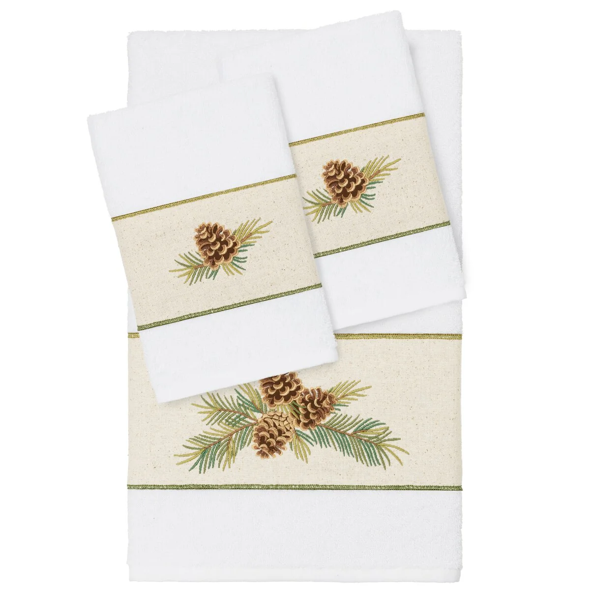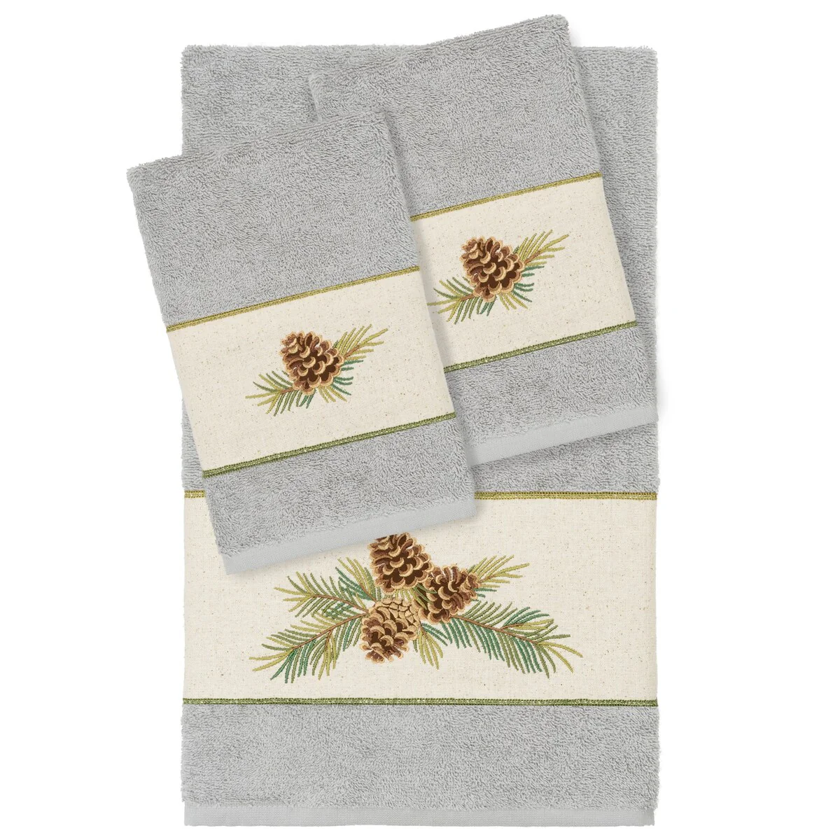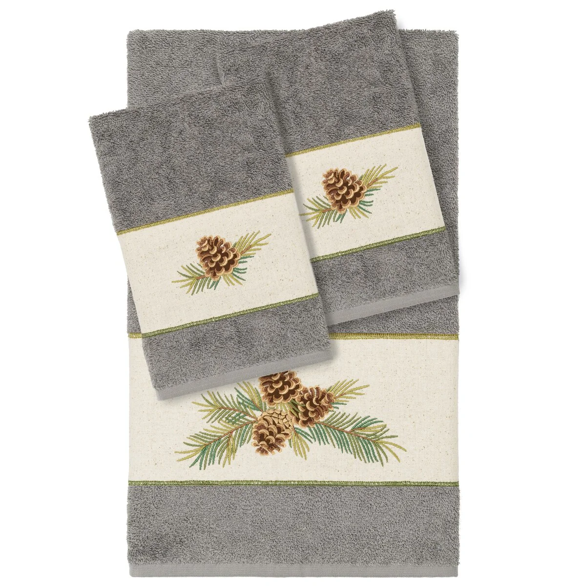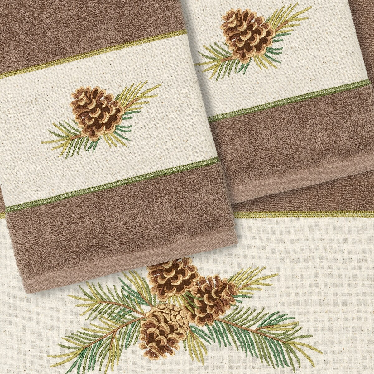 The Pierre Embellished Towel Collection by Authentic Hotel and Spa features a rustic pinecones on branches motif, embroidered on a natural cotton osnaburg cloth border. These soft and luxurious towels are made of 100% premium Turkish Cotton and offer lasting absorbency and superior durability.