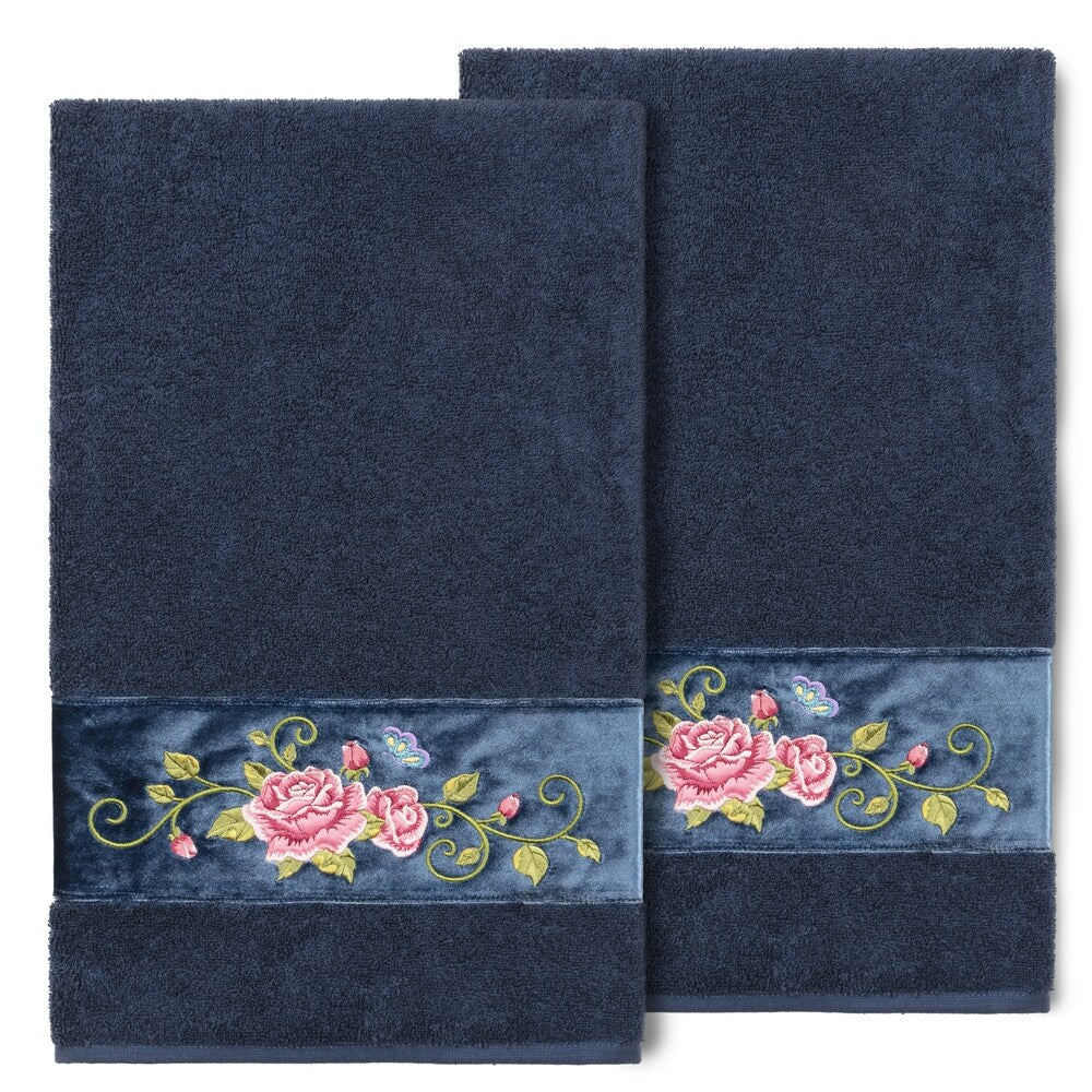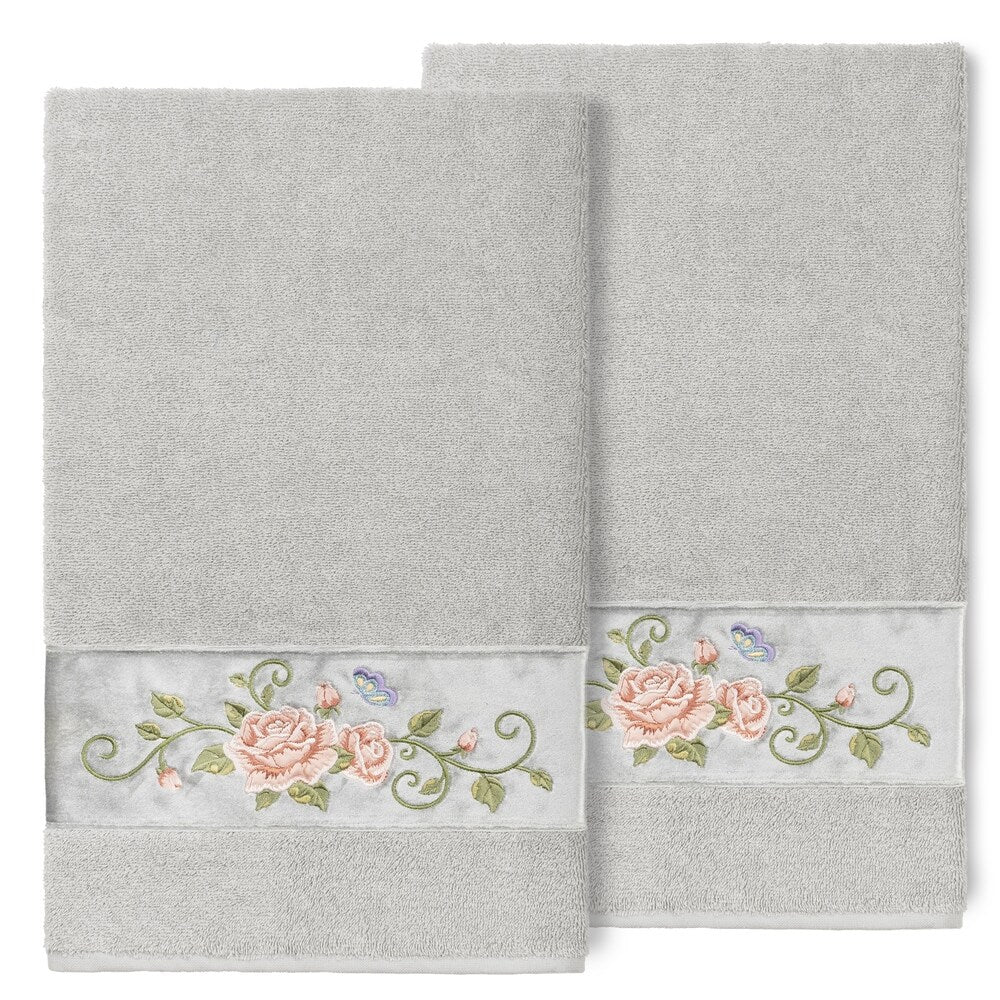 The Rebecca Embellished Towel Collection features a romantic rose & butterfly motif embroidered on a rich velvet border. These soft and luxurious towels are made of 100% premium Turkish Cotton and offer lasting absorbency and superior durability.