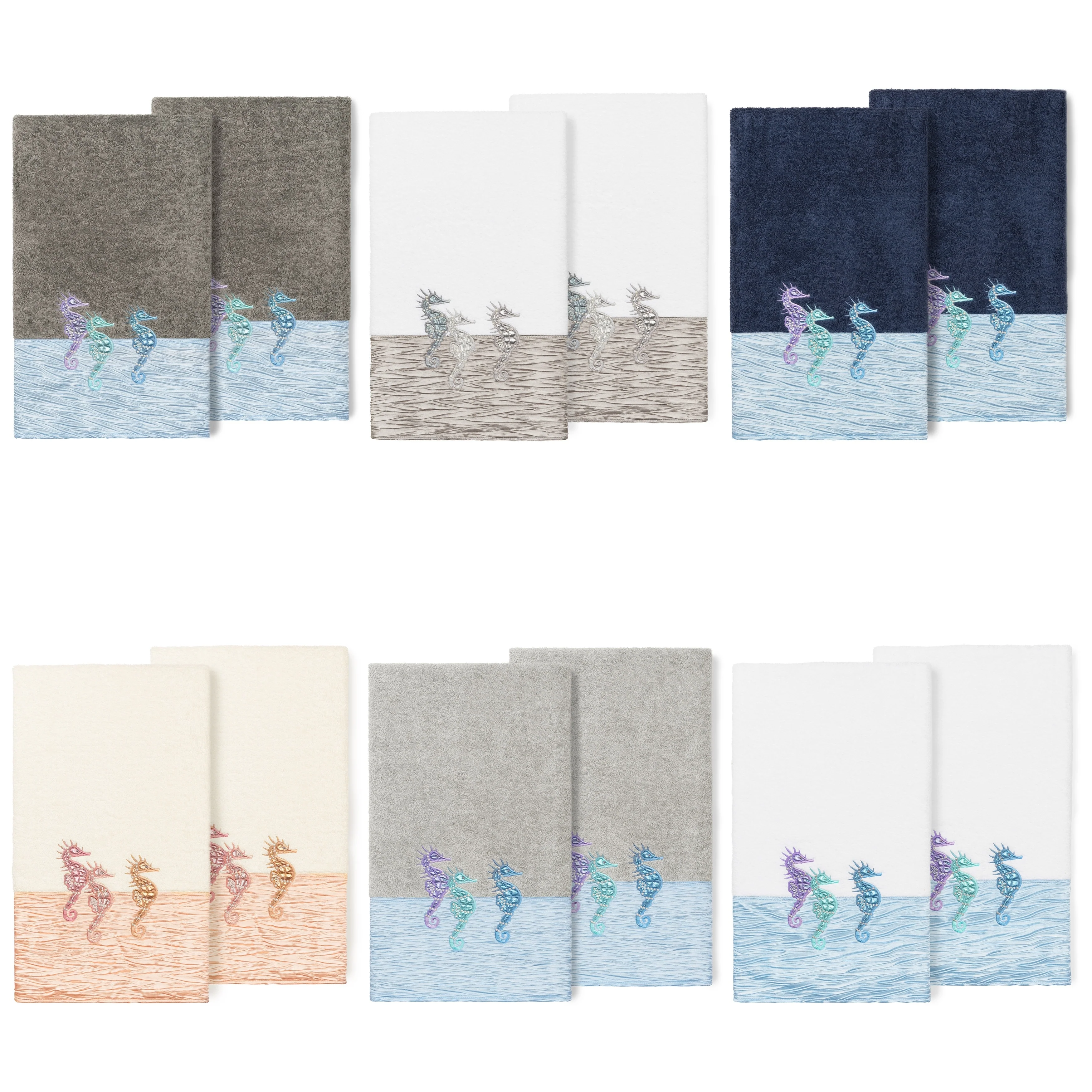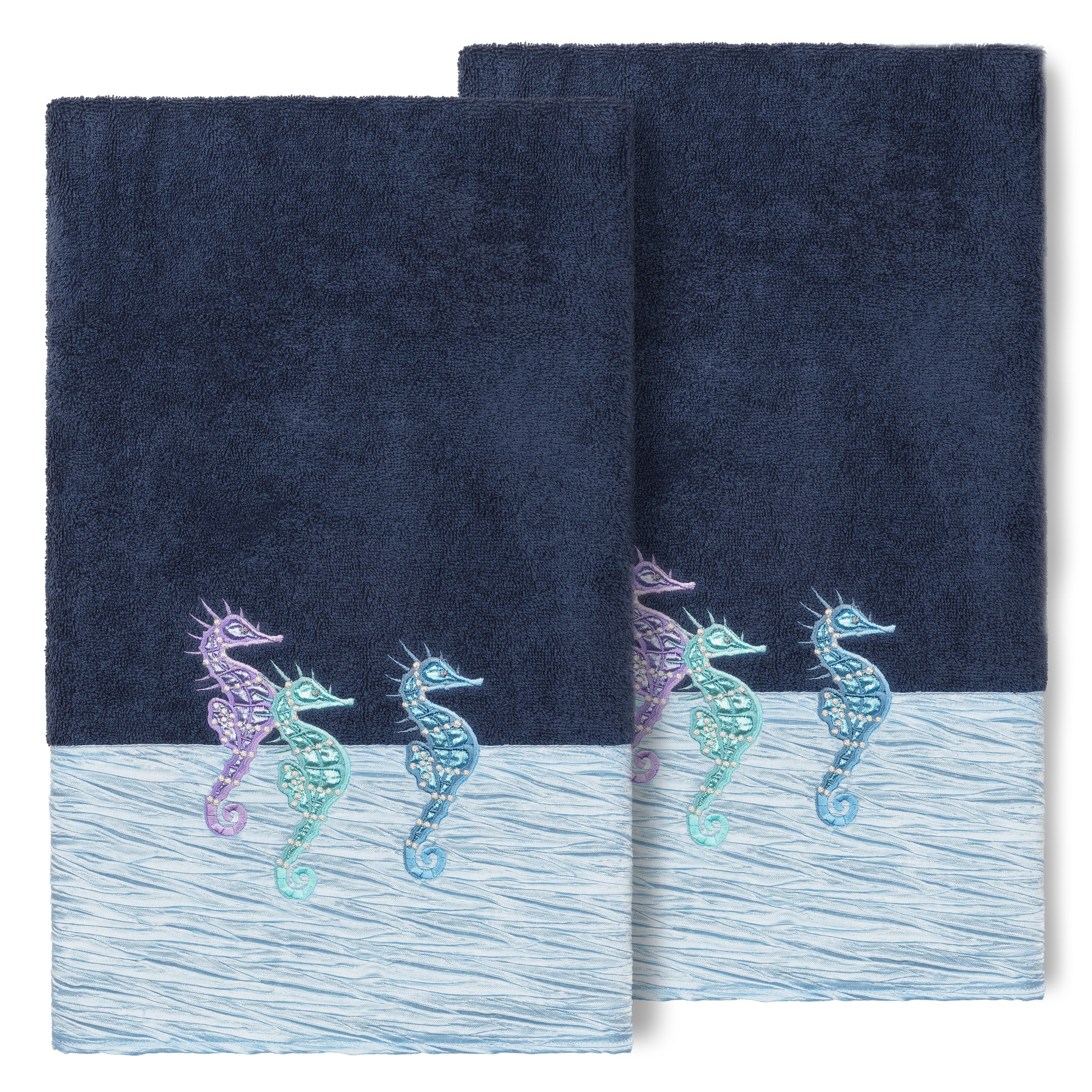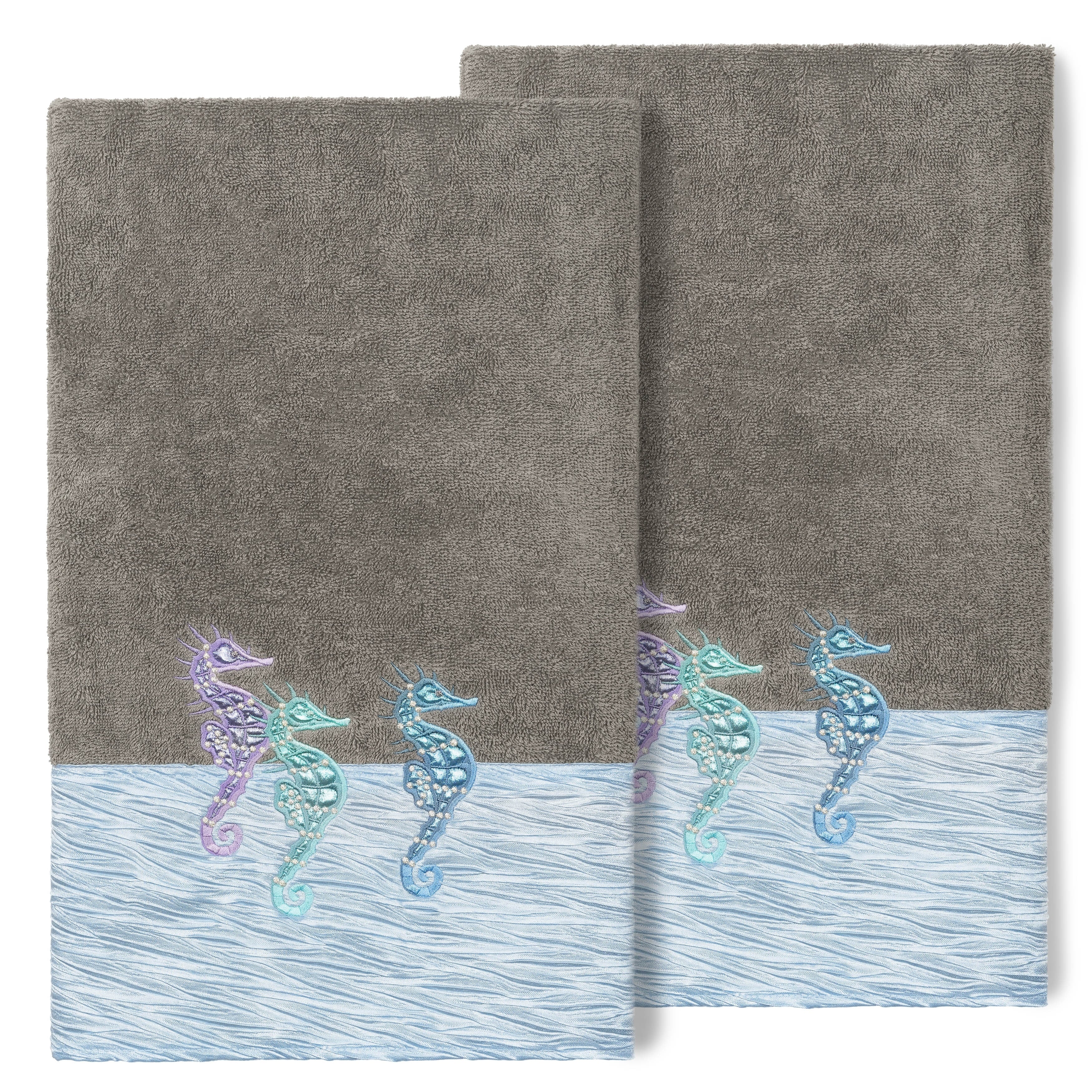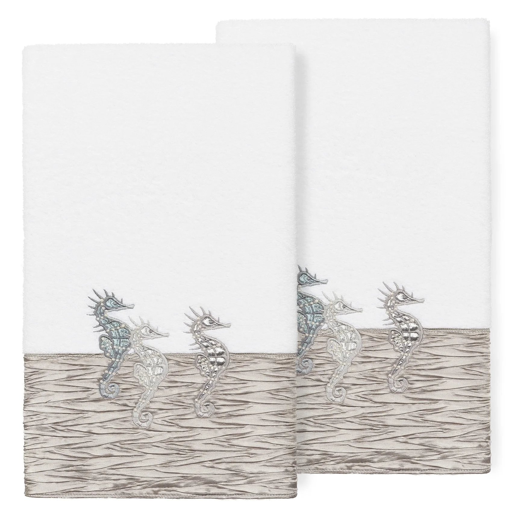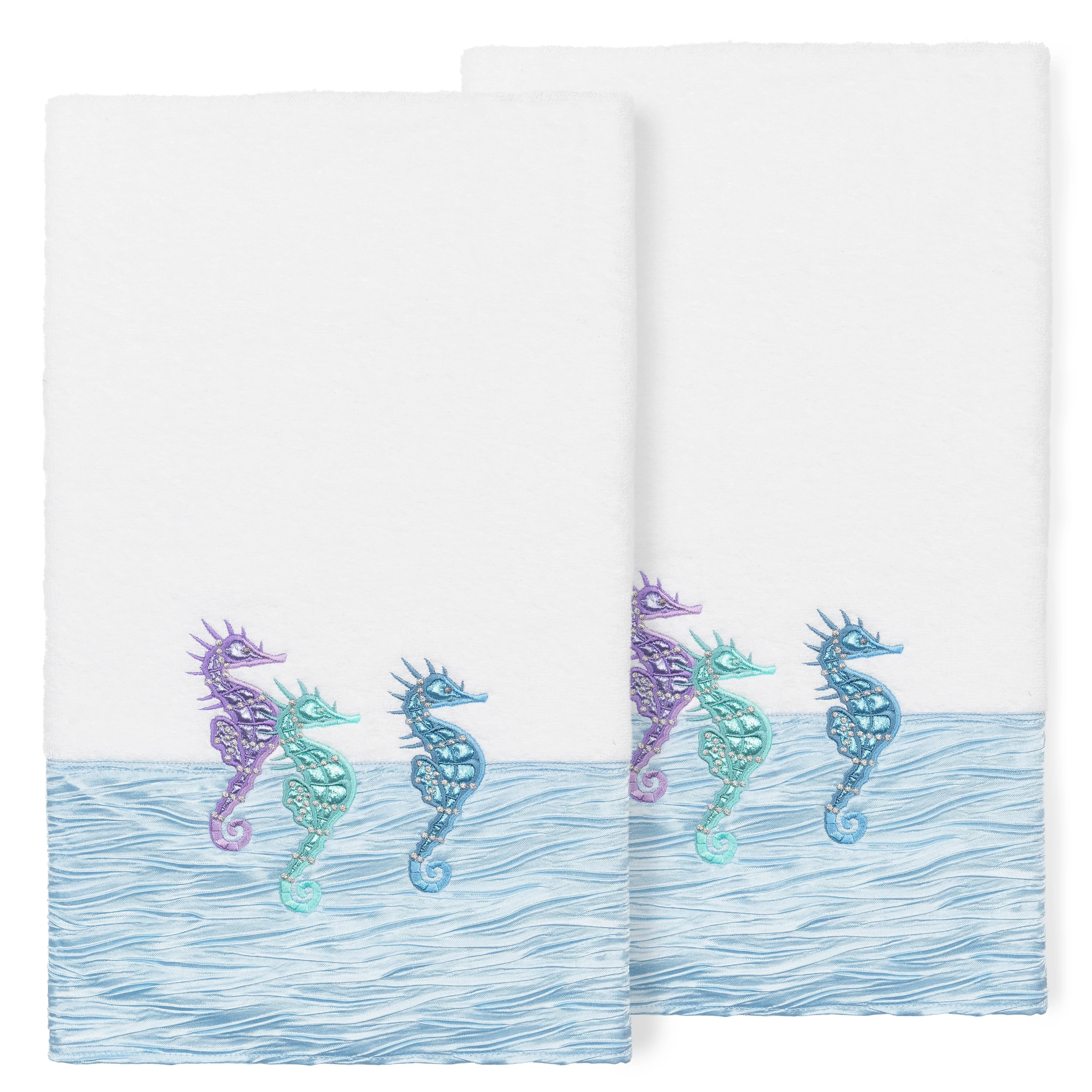 The Sofia Embellished Towel Collection features sparkling seahorses embroidered on a lustrous pleated border. These soft and luxurious towels are made of 100% premium Turkish Cotton and offer lasting absorbency and superior durability.