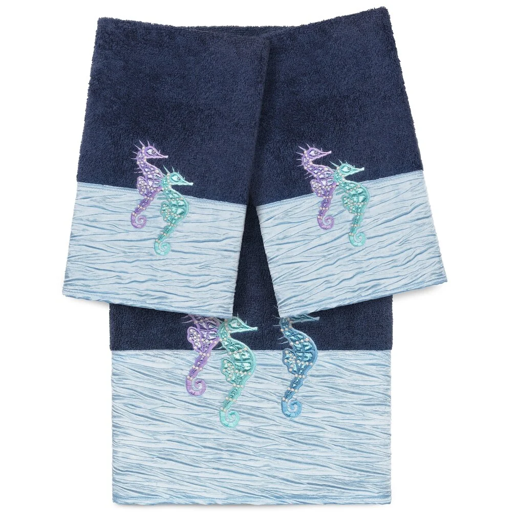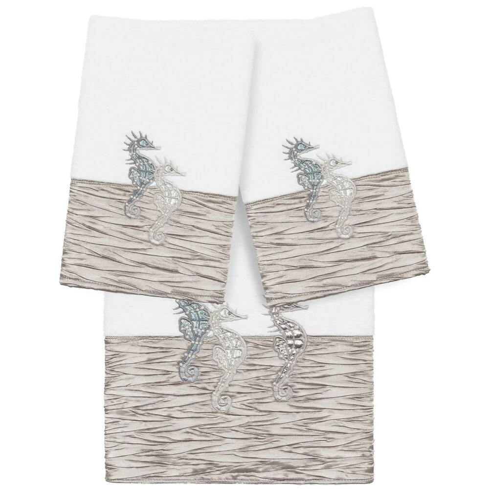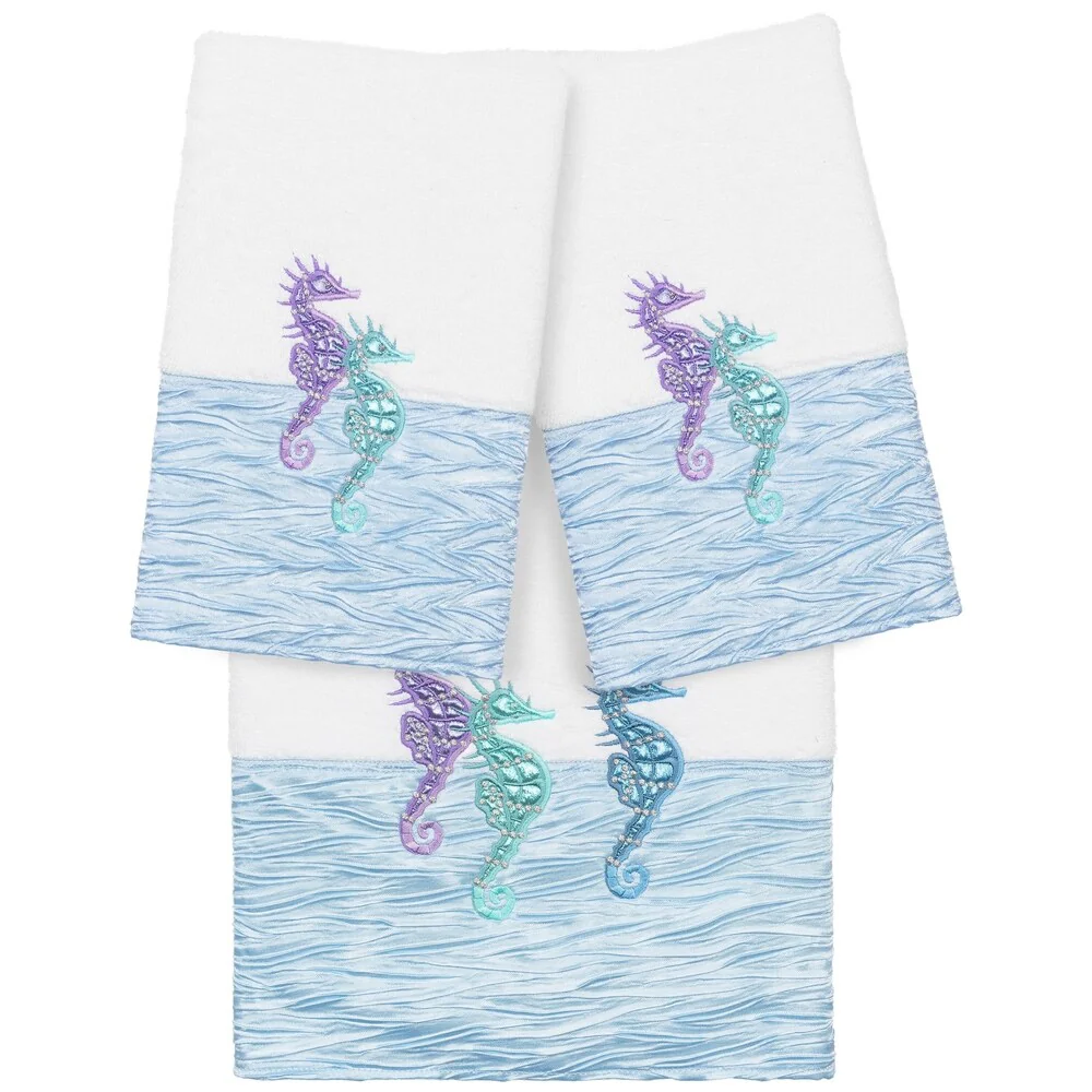 The Sofia Embellished Towel Collection features sparkling seahorses embroidered on a lustrous pleated border. These soft and luxurious towels are made of 100% premium Turkish Cotton and offer lasting absorbency and superior durability.