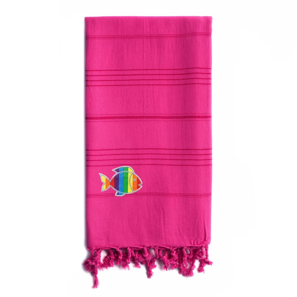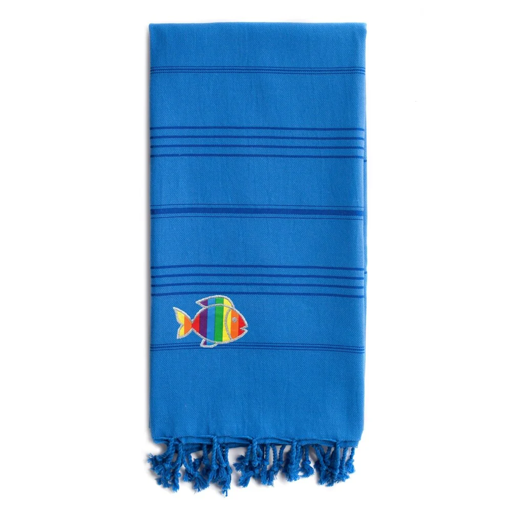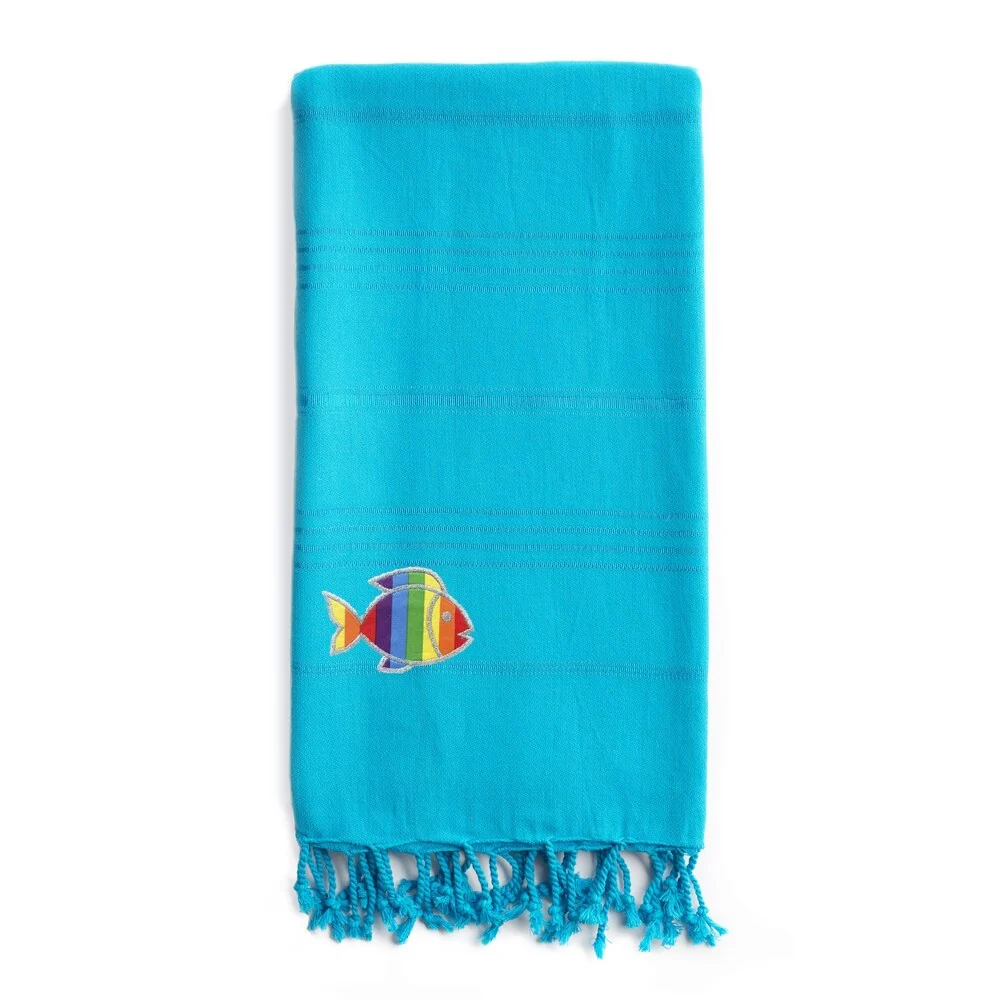 Wrap up in a luxurious super-soft and extremely absorbent Summer Fun Pestemal Beach Towel, embroidered with a Sparkling Rainbow Fish. Perfect for everyday use or travel, this eco-friendly design is light weight and fast drying for a cozy and luxurious feeling. It easily fits in a beach bag or in a suitcase and can be used as a family beach blanket, sarong, shawl, fun table cloth, bed topper and throw on your sofa. The Summer Fun Sparkling Rainbow Fish Pestemal Beach towel makes a wonderful gift for men, women and kids.