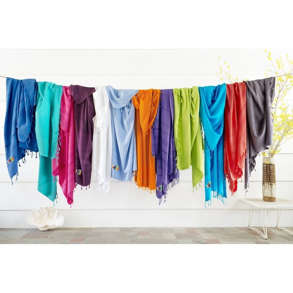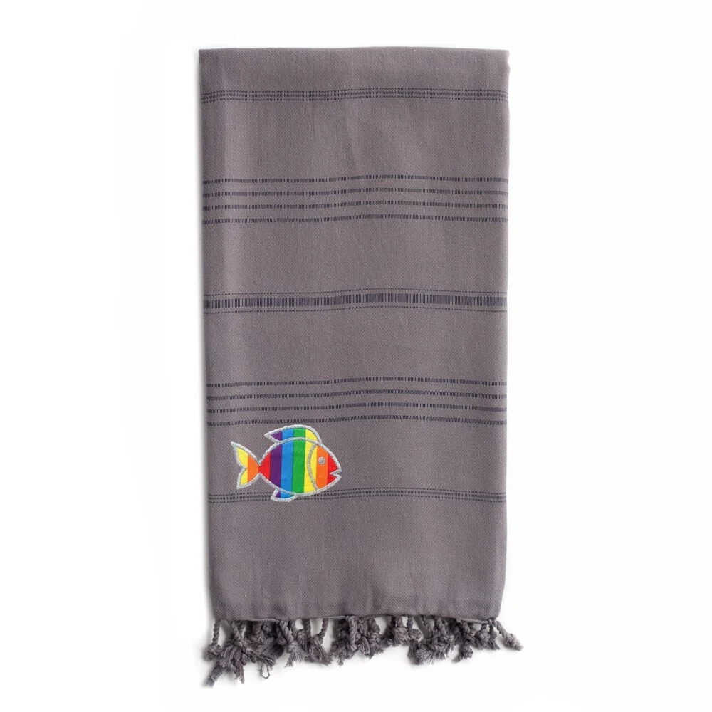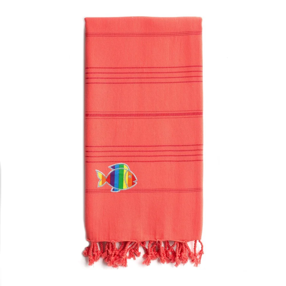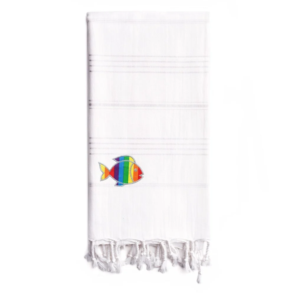 Wrap up in a luxurious super-soft and extremely absorbent Summer Fun Pestemal Beach Towel, embroidered with a Sparkling Rainbow Fish. Perfect for everyday use or travel, this eco-friendly design is light weight and fast drying for a cozy and luxurious feeling. It easily fits in a beach bag or in a suitcase and can be used as a family beach blanket, sarong, shawl, fun table cloth, bed topper and throw on your sofa. The Summer Fun Sparkling Rainbow Fish Pestemal Beach towel makes a wonderful gift for men, women and kids.