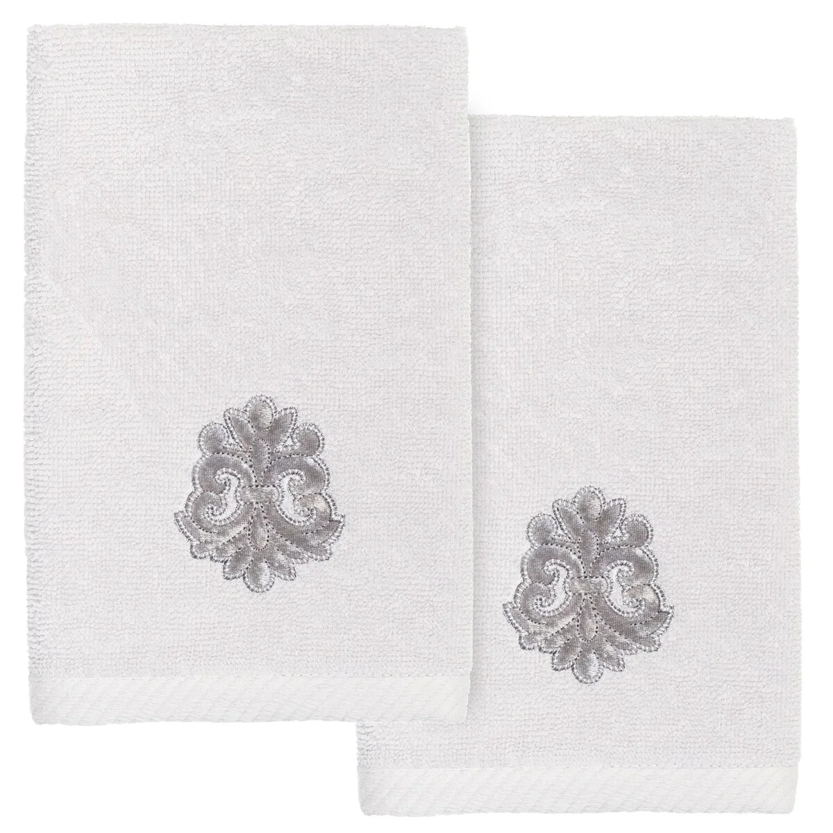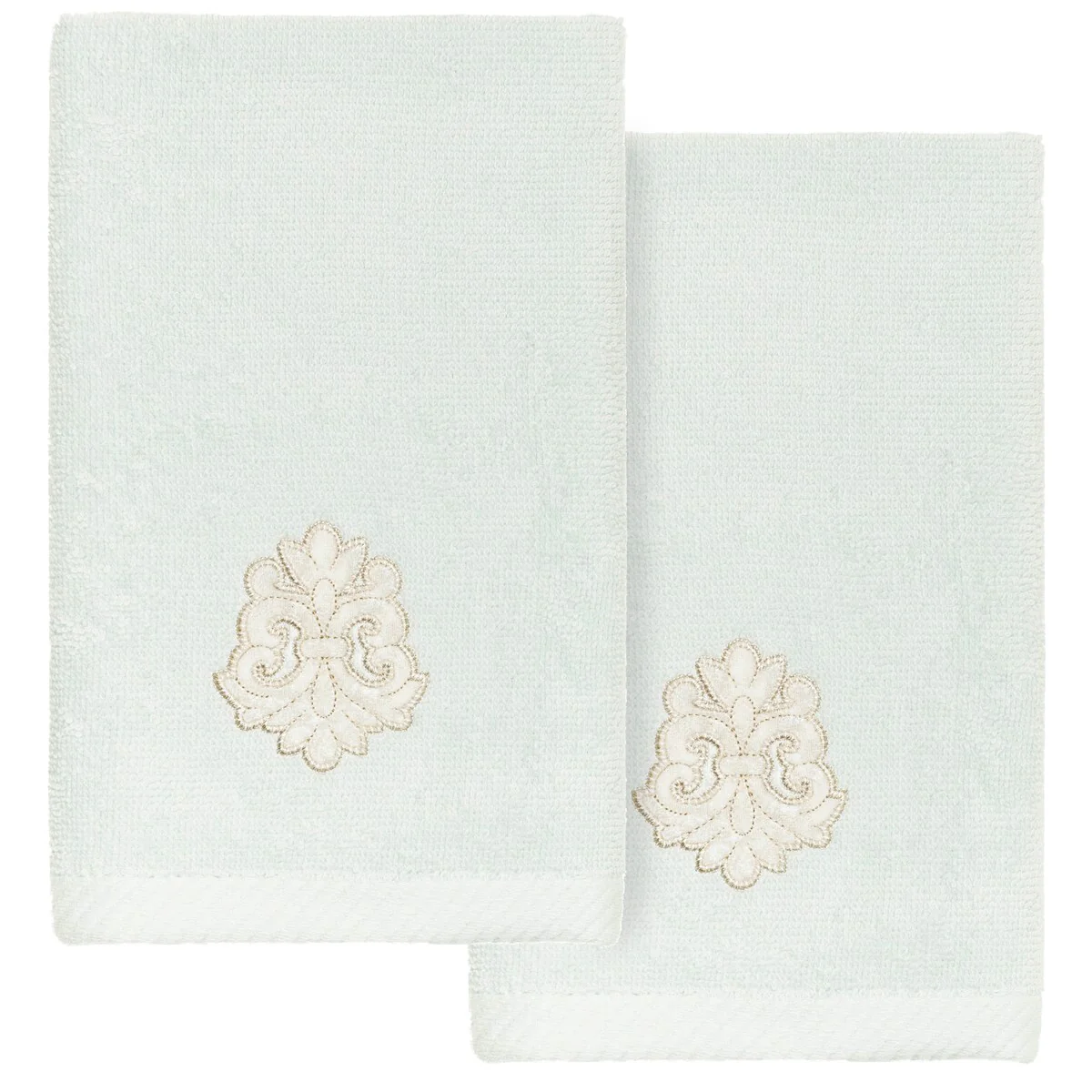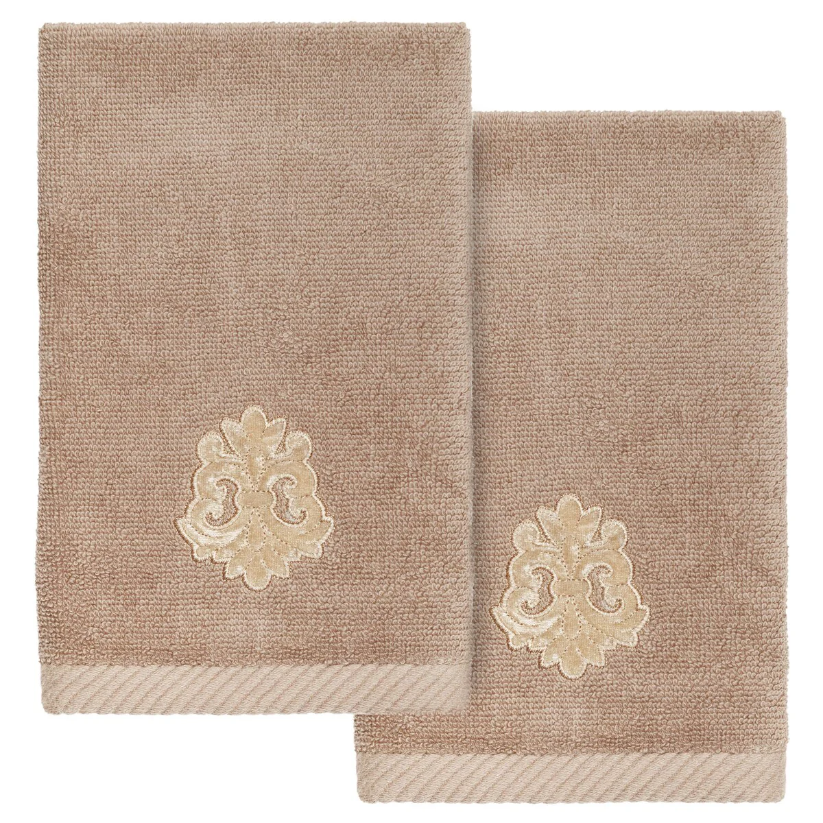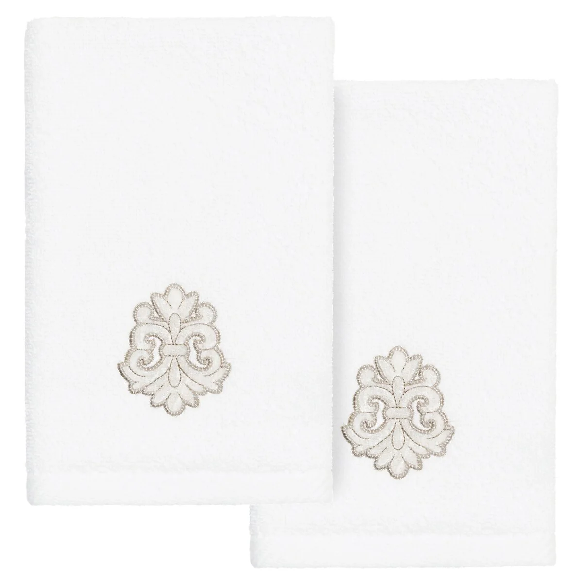 Your decorations are not complete without elegant embroidered towels by Authentic Hotel and Spa for the comfort of your family and guests. The May towels feature a classic velvet crest applique and are trimmed with the same lustrous velvet border. Cloud soft and super absorbent, these luxurious, durable towels keep their plush appearance after washing. This collection is available in 8 elegant colors: White, Beige, Blush, Aqua, Silver, Cocoa, Charcoal and Marine. The May Towel Collection brings a refined spirit and richness to your home decor and makes a great gift.