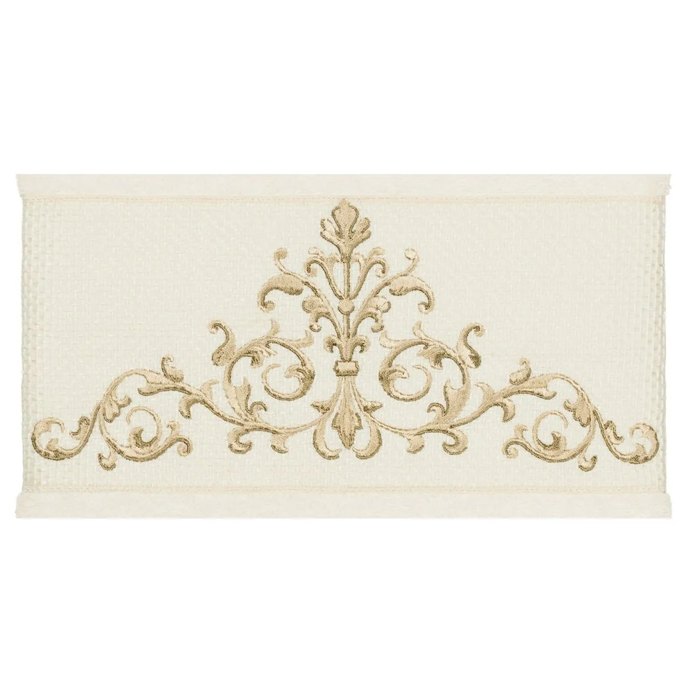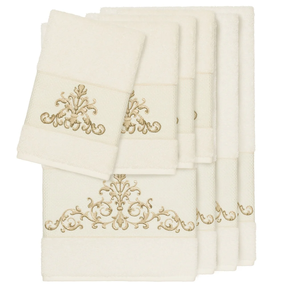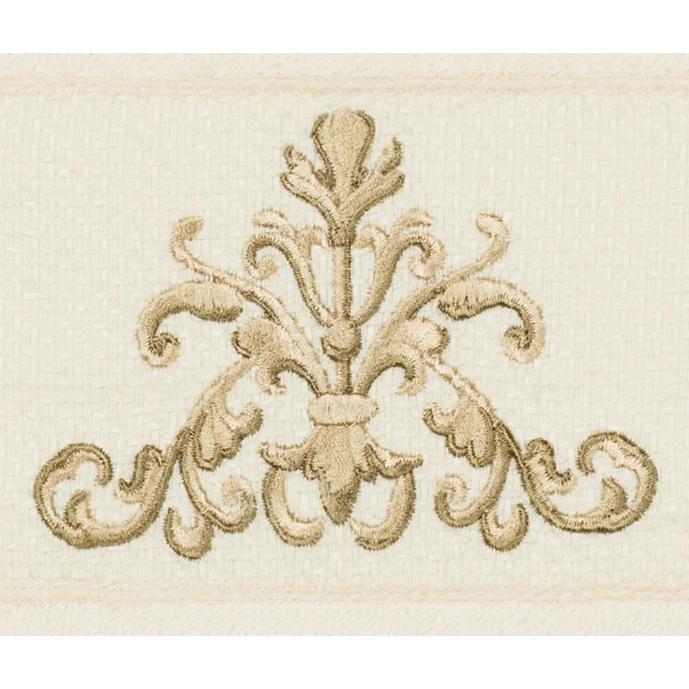 This authentic hotel and spa 4-piece towel set is made from plush, high end Turkish cotton for supreme absorbency and durability. The beautiful cream towels are embellished with a scrollwork applique and embroidery design with a textured woven border to add that special touch to your bathroom.