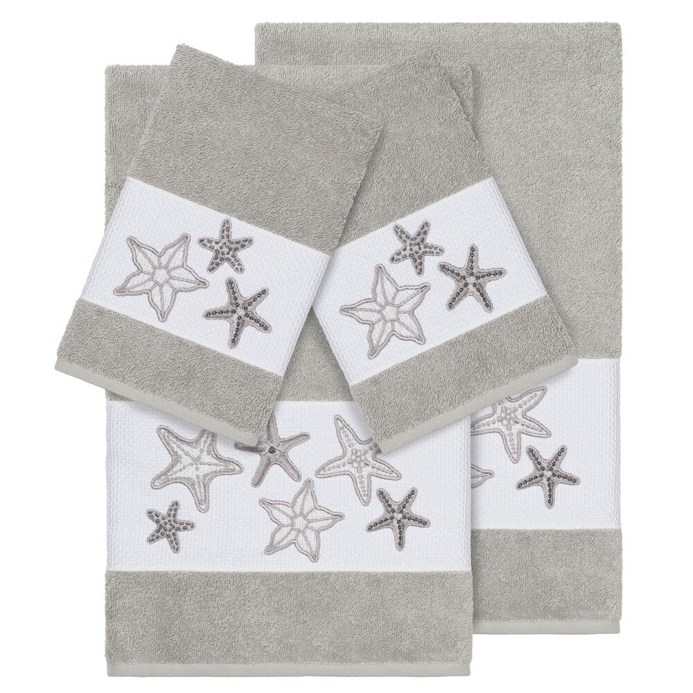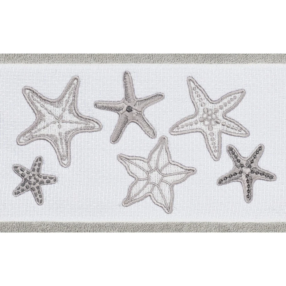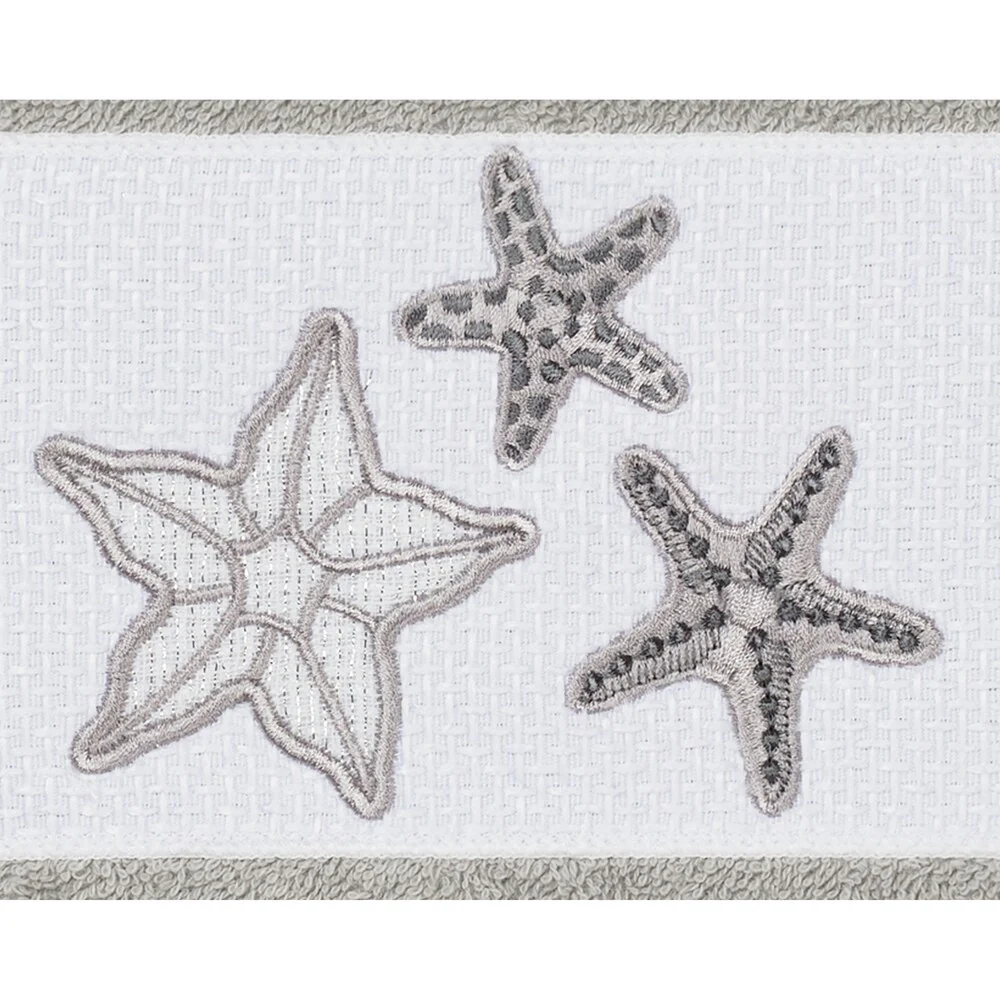 This authentic hotel and spa 3-piece towel set is made from plush, high end Turkish cotton for supreme absorbency and durability. The beautiful light grey towels are embellished with a starfish applique and embroidery design with a textured woven border to add that special touch to your bathroom.